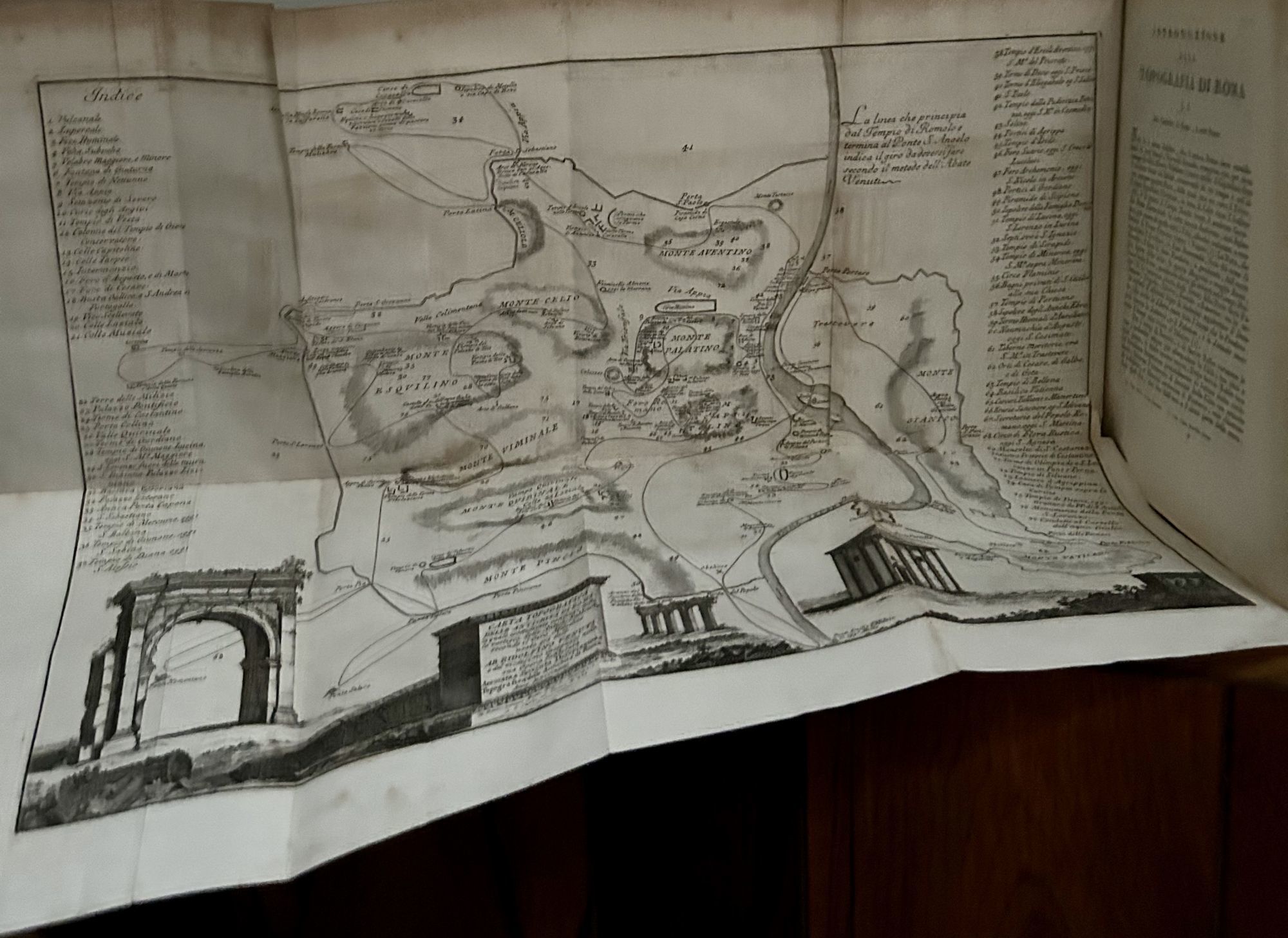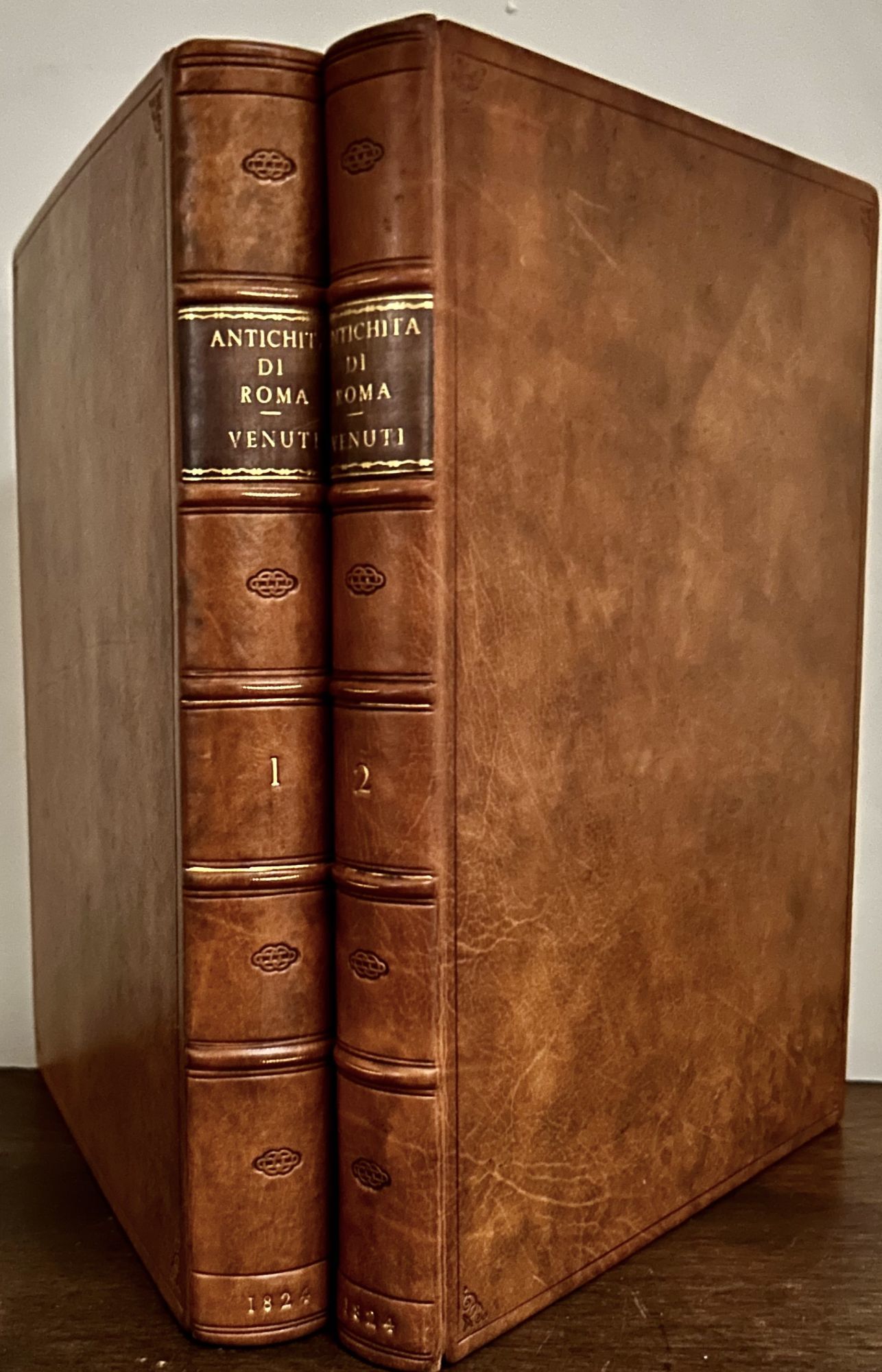 Rome: Pietro Piale & Mariano de Romanis, 1824. Third edition. leather_bound. Full modern antique niger. Near fine. 2 vols. (2) xvi, xxxii, 256' vi, 238 pages. 27.9 x 20.3 cm. Engraved vignette on title-pages, engraved portrait following title, 2 engraved head-pieces, large engraved folding map, 68 engraved plates after Piranesi, Morel, Rinaldi. Ferrerri, Duflos and others. Complete with 70 copper engraved plates of which 23 are by Piranesi. Included is a large fold-out map of Rome of Pirro Ligorio. An important work on the monuments of Rome. CICOGNARA 3905 (for 1st edition). Some marginal browning and spotting. Raised bands, spine decorations in blind, olive spine labels lettered in gilt.
