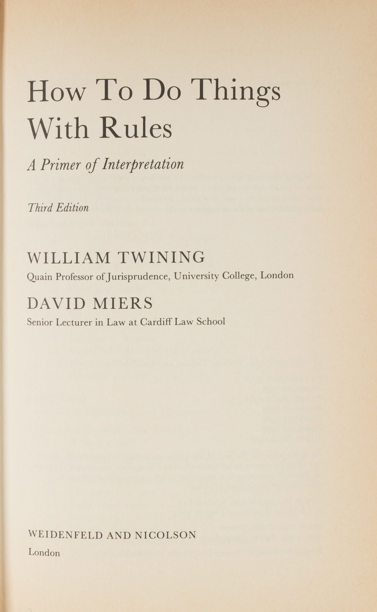 1991. Twining, William L. Miers, David. How to Do Things with Rules: A Primer of Interpretation. London: Weidenfeld and Nicolson, 1991. Third edition. xxv, 470 pp. Hardcover in lightly worn dust jacket. $45. * Twining and Miers examines the basic intellectual skills law students need, in particular those concerning the handling of rules. Designed to cater for the needs of a variety of groups, including 'pre-law', first year LLB students reading courses in legal method, and those studying jurisprudence options with an interpretation/legal reasoning basis, it has wide appeal and provides a general overview of the subject. The new edition brings the reader up to date with changes in the law and involves more emphasis on the EU and legislation, with new examples and exercises. (Publisher's description).