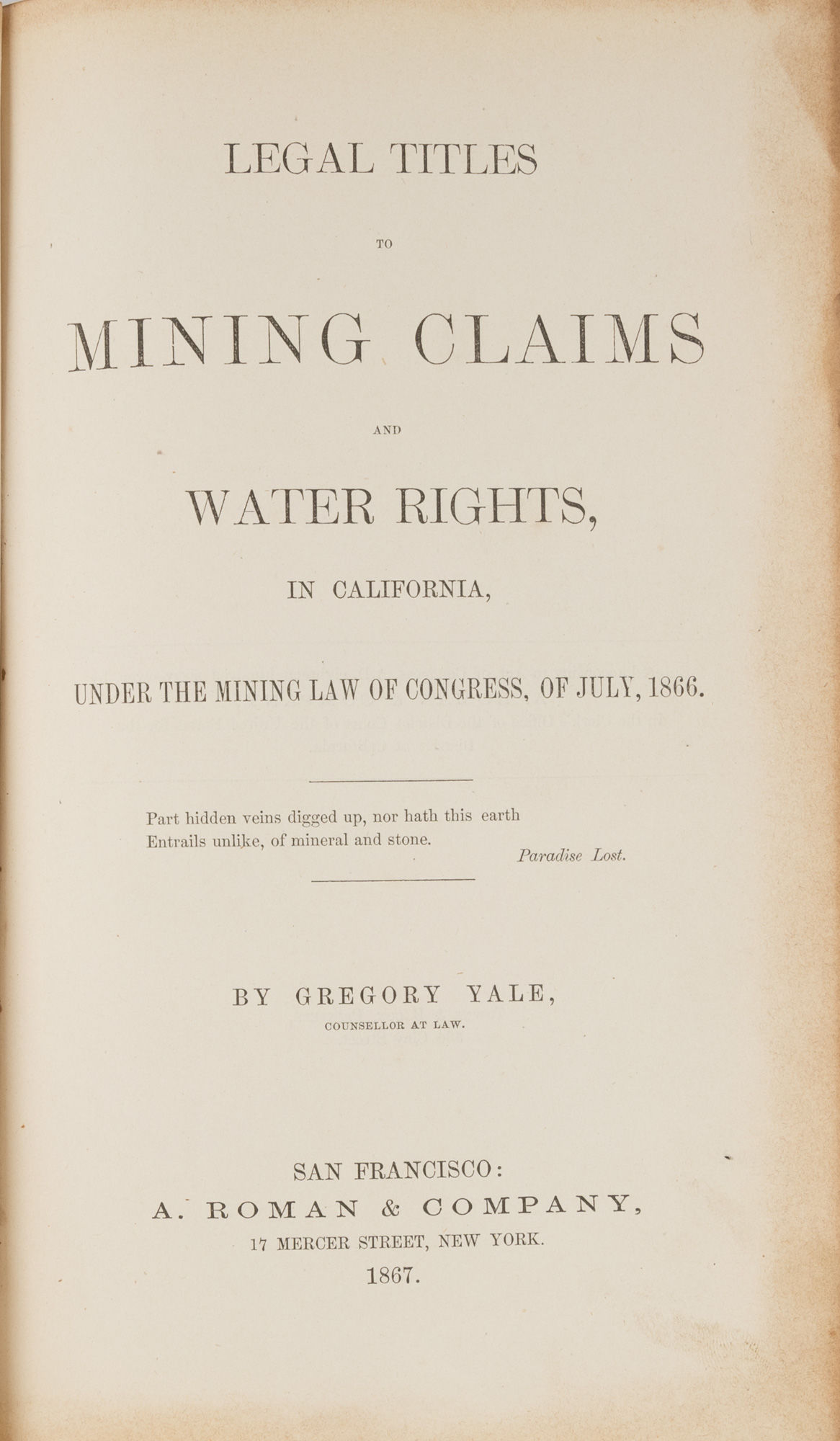 1867. An Early Treatise on Mining Claims in California, "Not Superseded by Any Later Authority" Yale, Gregory [1816-1871]. Legal Titles to Mining Claims and Water Rights, In California, Under the Mining Law of Congress, Of July, 1866. San Francisco: A. Roman & Company, 1867. xxiii, [2], 10-452, [2] pp. Main text followed by 2 pp. of publisher advertisements. Octavo (8-3/4" x 5-1/2"; 22.2 x 14 cm). Contemporary sheep, blind fillets to boards, blind fillets and red and black lettering pieces to spine. Light rubbing and a few minor scuffs, scratches and stains to boards, moderate rubbing to extremities, chipping to spine and spine ends, front joint starting at ends, corners bumped and worn, hinges cracked, light foxing and faint offsetting to endleaves. Light toning to interior, small spots and faint marginal staining to a few leaves. $450. * Only edition. Published a year after the passage of the first federal mining law, this treatise gives a detailed overview of the history of mining laws in California and the implications of the new federal legislation. "The author was an attorney of great ability, who figured in some of the famous law cases of San Francisco. This work contains much early local mining history, not superseded by any later authority" (Cowan). Cowan, A Bibliography of the History of California 1510-1930 698.