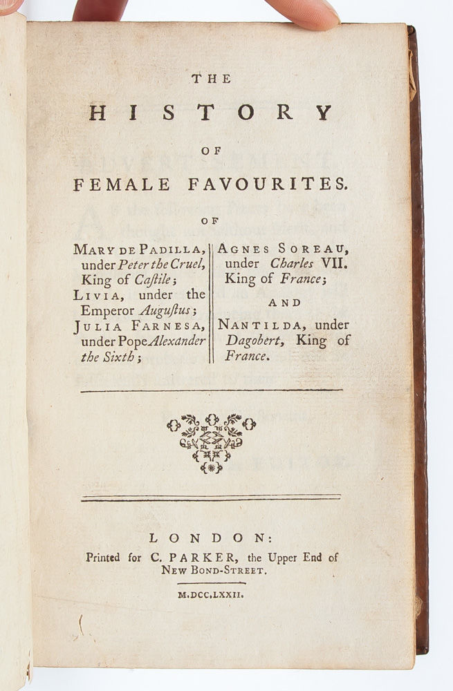 Anne de La Roche-Guilhem's history of famed courtesans was published in four languages between its 1675 release in French and its first appearance in English in 1772 (OCLC). That year, both The Critical Review and the London Magazine noted its potential interest to "those who are fond of of what is known by the name of secret history" and claimed somewhat dismissively that "the ladies will find themselves particularly amused." Female Favourites certainly participated in a popular genre aimed at women -- among its contemporaries were Thomas Amories' Lives of Several Ladies of Great Britain (1755), Thomas Gibbons' Memoirs of Eminently Pious Women (1777), and Ann Thicknesse's Sketches of the Lives and Writings of the Ladies of France (1778). Yet it stood out for avoiding the emphasis on women as exemplars, heroes, or artists to instead focus on the histories and lives of courtesans.