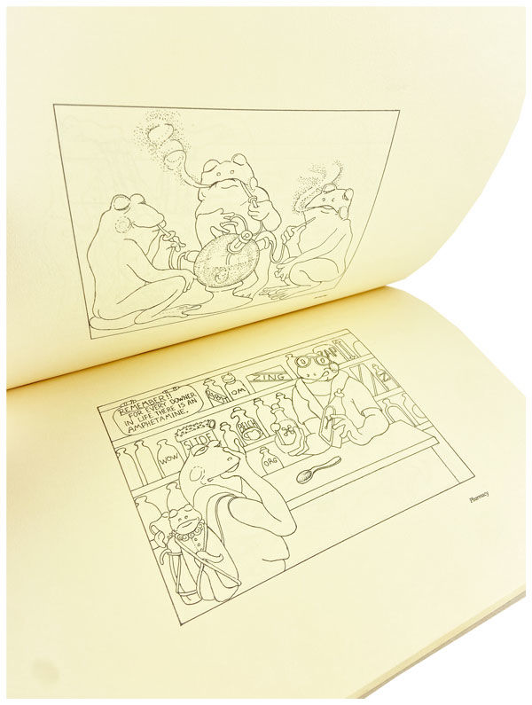 Uncommon cartoon collection, a series of vignettes depicting aspects of American life (populated in this case by a crowd of anthropomorphic frogs) as the 1970s drew to a close. Sex, drugs, "Jonesville" (i.e. Jonestown), and class distinctions all abound. Missed by OCLC as of May, 2025.