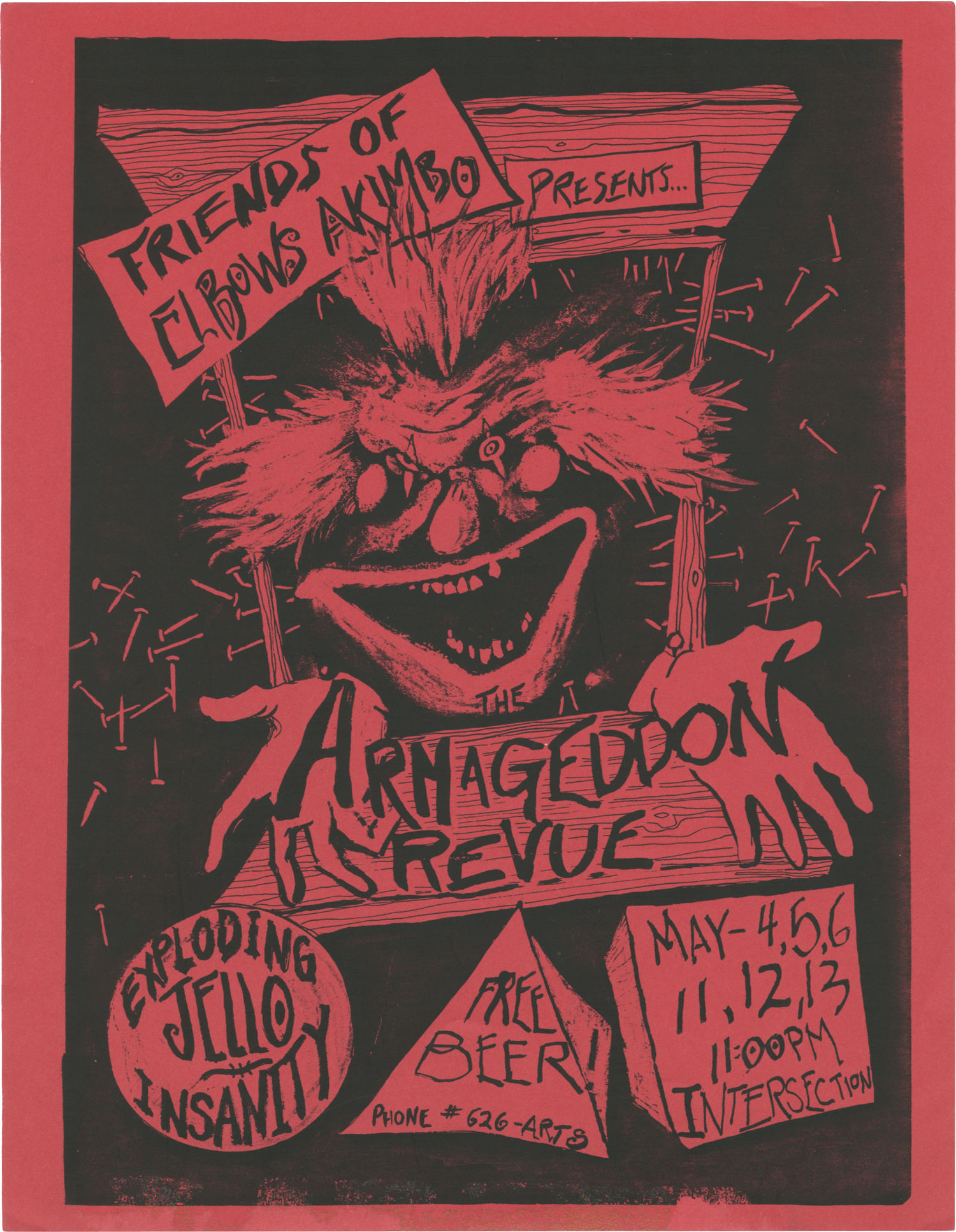 Friends of Elbows Akimbo Present Armageddon Review (Original flyer for the 1990 avant-garde performance series)