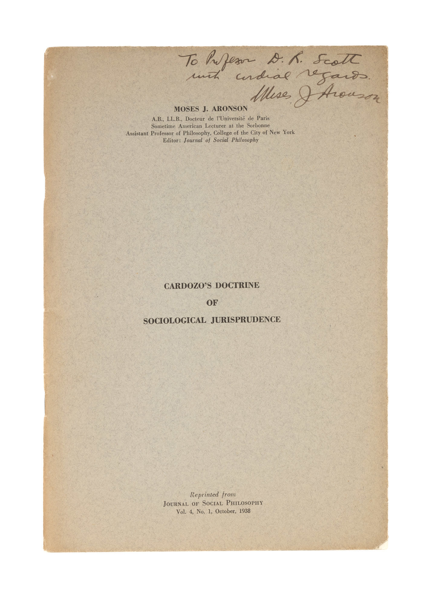1938. Aronson, Moses J. Cardozo's Doctrine of Sociological Jurisprudence. [New York]: "Reprinted from Journal of Social Philosophy, Vol. 4, no. 1, October, 1938." 5-44 pp. Stapled pamphlet, light shelfwear, light wear and fading to spine, author's presentation inscription to head of front cover: "To Professor D.R. Scott/ with cordial regards, Moses J Aronson." $25.