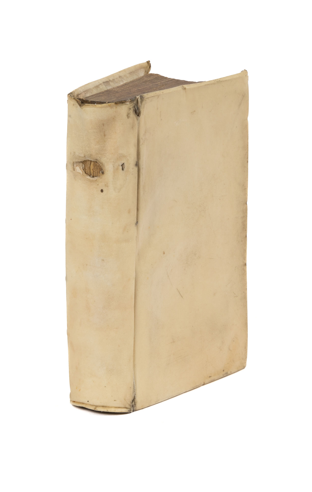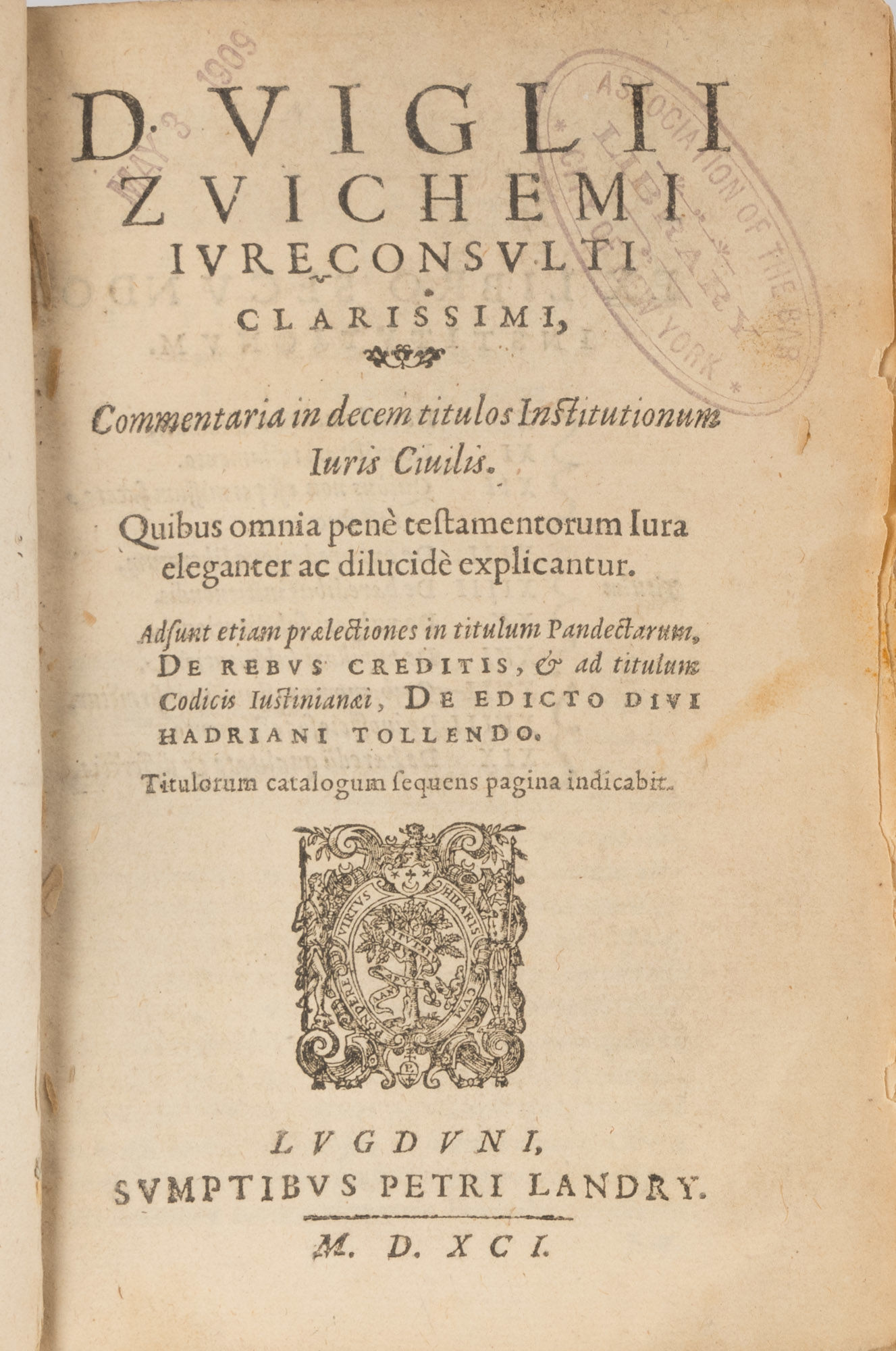 1591. Lyon: Sumptibus Petri Landry, 1591. Lyon: Sumptibus Petri Landry, 1591. Commentaries on Inheritance and Succession in Roman Law by a Distinguished Dutch Jurist Viglius (Aytta van Zwichem, Wigle) [1507-1577]. Commentaria in Decem Titulos Institutionum Iuris Civilis. Quibus Omnia Pene Testamentorum Iura Eleganter ac Dilucide Explicantur. Adsunt Etiam Praelectiones in Titulum Pandectarum, De Rebus Creditis, & Ad Titulum Codicis Iustinianaei, De Edicto Divi Hadriani Tollendo. Titulorum Catalogum Sequens Pagina Indicabit. Lyon: Sumptibus Petri Landry, 1591. 16, 479, [1], [32] pp. Octavo (6-1/2" x 3-3/4"). Contemporary vellum, edges rouged. Very light soiling to exterior, spine ends bumped, small hole near head of spine, joints starting at ends, vellum beginning to crack through pastedowns, small ink stamp to title page and rear pastedown, early (illegible) ownership signature to front free endpaper, front endleaves loosening and lightly edgeworn. Moderate toning to interior, small spots and pencil marks to margins of a few pages. $750. * Later edition. A collection of lectures on inheritance and succession in Roman law. Much of the work is dedicated to last wills and testaments, with discussions on wills made by soldiers, invalid wills and categories of persons prohibited from making wills. The first edition was published in Basel in 1534 and the final edition in Leeuwarden in 1643. Viglius, a Dutch statesman and jurist, was a lecturer at the universities of Bourges, Padua and Ingolstadt and went on to serve as a high-ranking minister under Emperor Charles V. This edition is scarce. OCLC locates 9 copies, none in North America. This edition not in Dekkers. Adams, A Catalogue of Books Printed on the Continent of Europe A-2355.