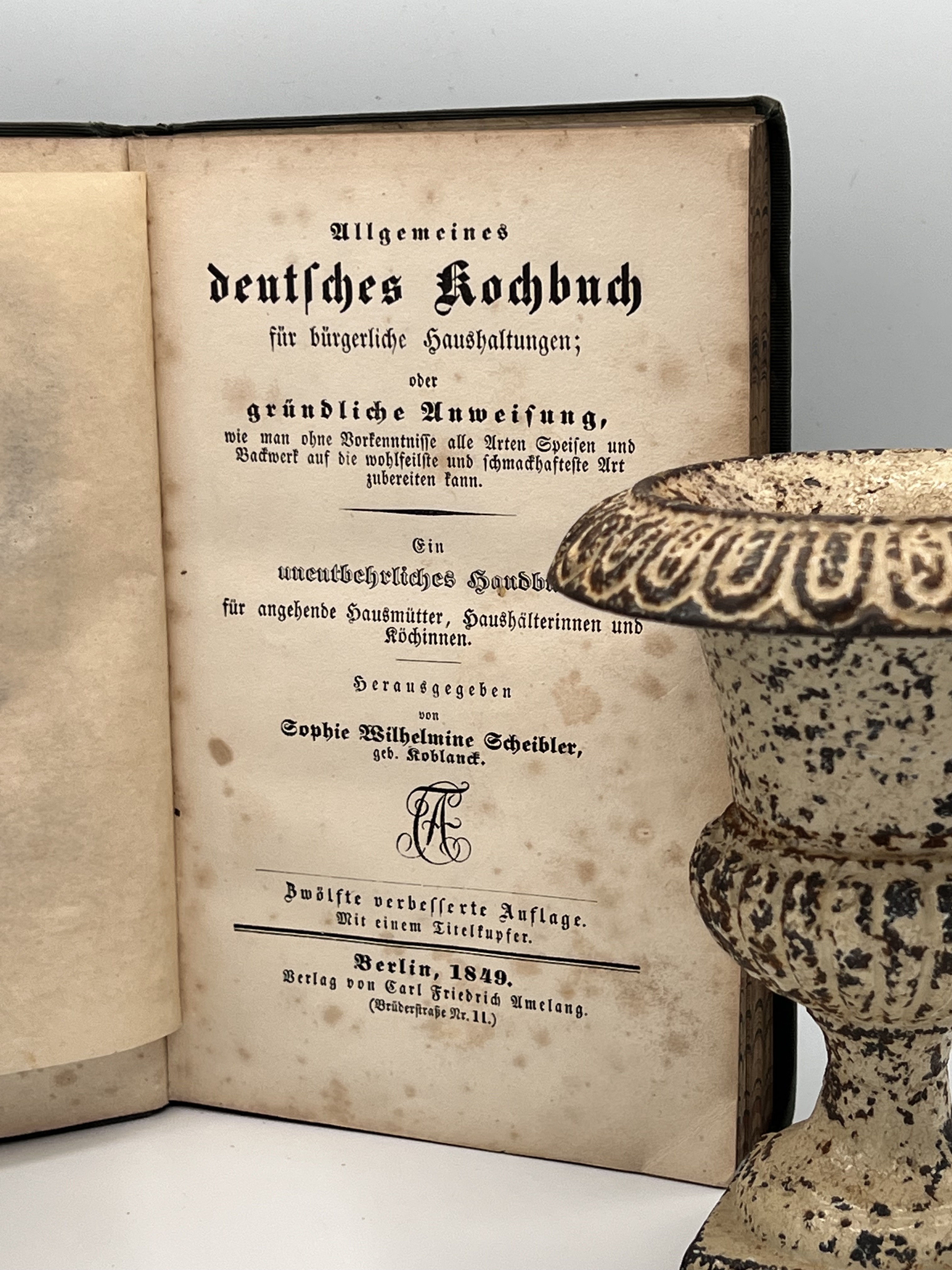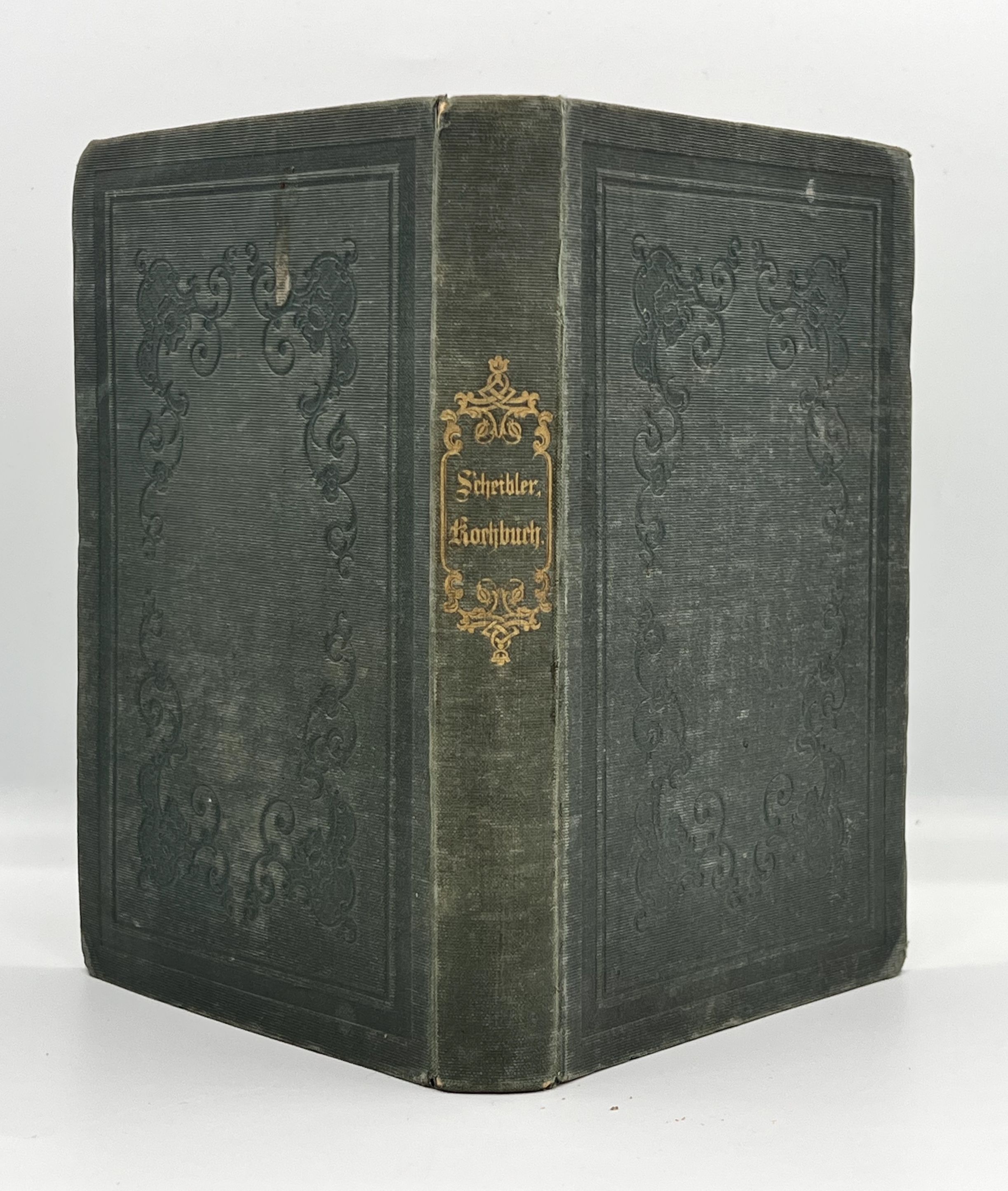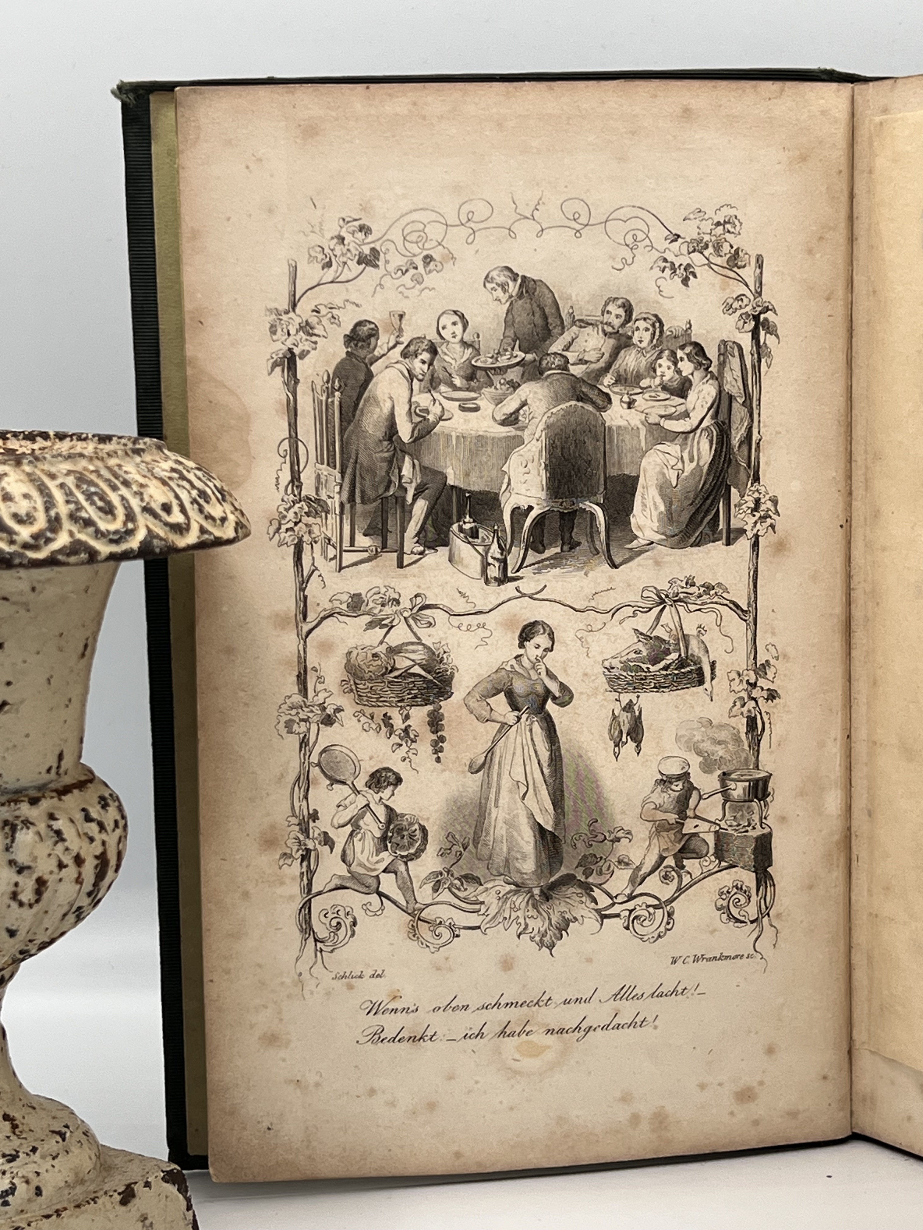 Berlin: Berlag von Carl Friedrich Umelang, 1849. Hardcover. Green embossed cloth covered boards. Very good. 445 pages. 19 x 12 cm. Lovely engraved frontispiece with tissue guard. An essential handbook for aspiring housewives, housekeepers and cooks. Written in "old' German script, or Fraktur. Marbled edges. Interior lightly foxed, otherwise clean. Boards lightly rubbed. From the culinary collection of Carl G. Sontheimer, the man who revolutionized American cooking by bringing the Cuisinart to the United States. Bookplate states: This book is a gift from THE SONTHEIMER FOUNDATION Greenwich, Connecticut.