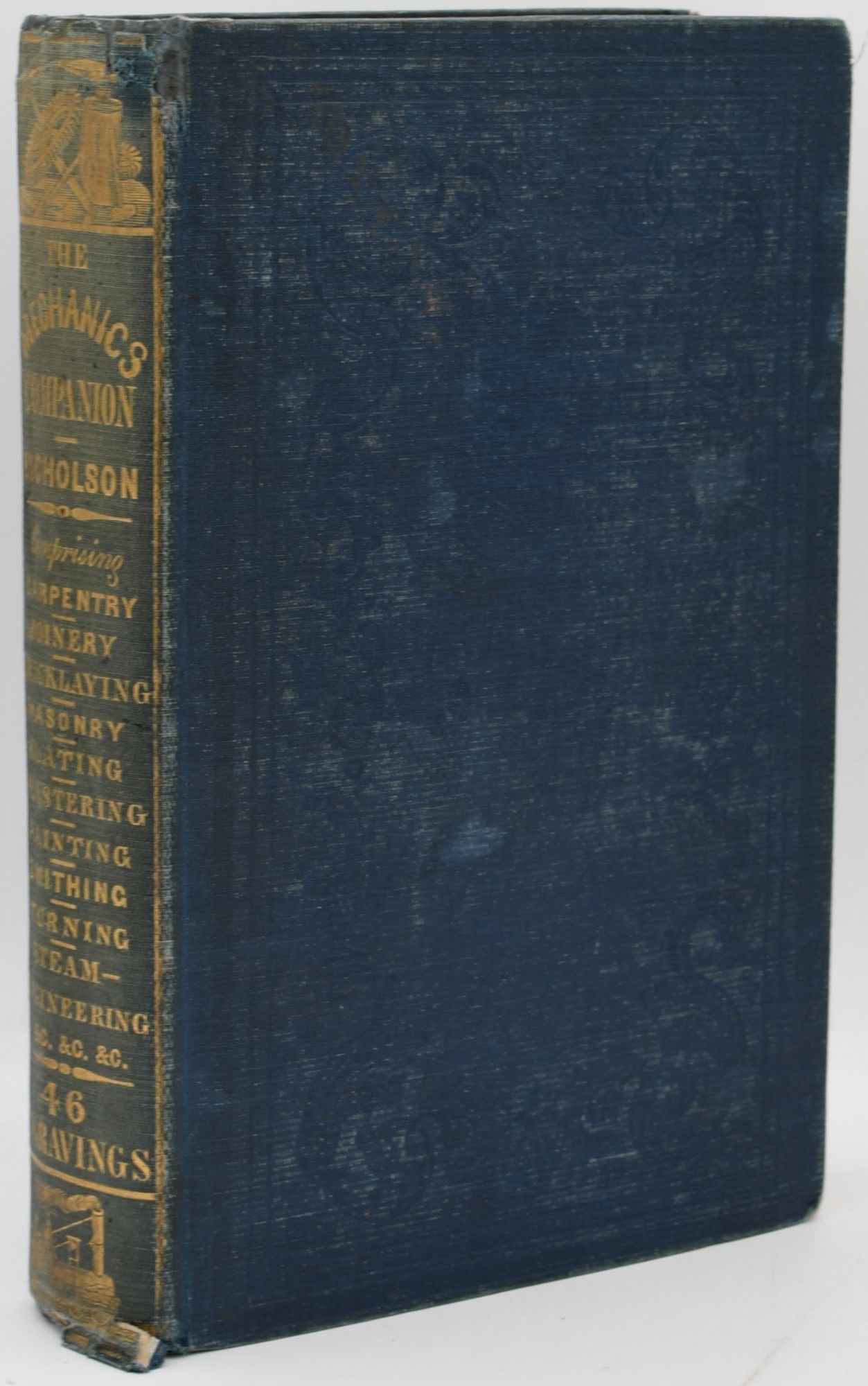 Philadelphis: Harper & Row, 1850. Fourth Printing. Hard Cover. Very Good binding. Large 8vo.; in the publisher's blue embossed cloth binding, with the spine elaborately titled in gilt; complete with frontispiece and 40 full page numbered plates and numerous in-text illustrations; a signature or two a bit loose but all holding well.~~First published in 1812 as Mechanical Exercises; then in 1831 and The Mechanic's Companion and again in 1845 and 1850. An important book that was used successfully in the 19th century in the building and construction trade.~~This edition was a 27 page illustrated appendix on the steam engine, with engravings.~~A wonderful compendium of how it was done back in the day.~~. Very Good binding.