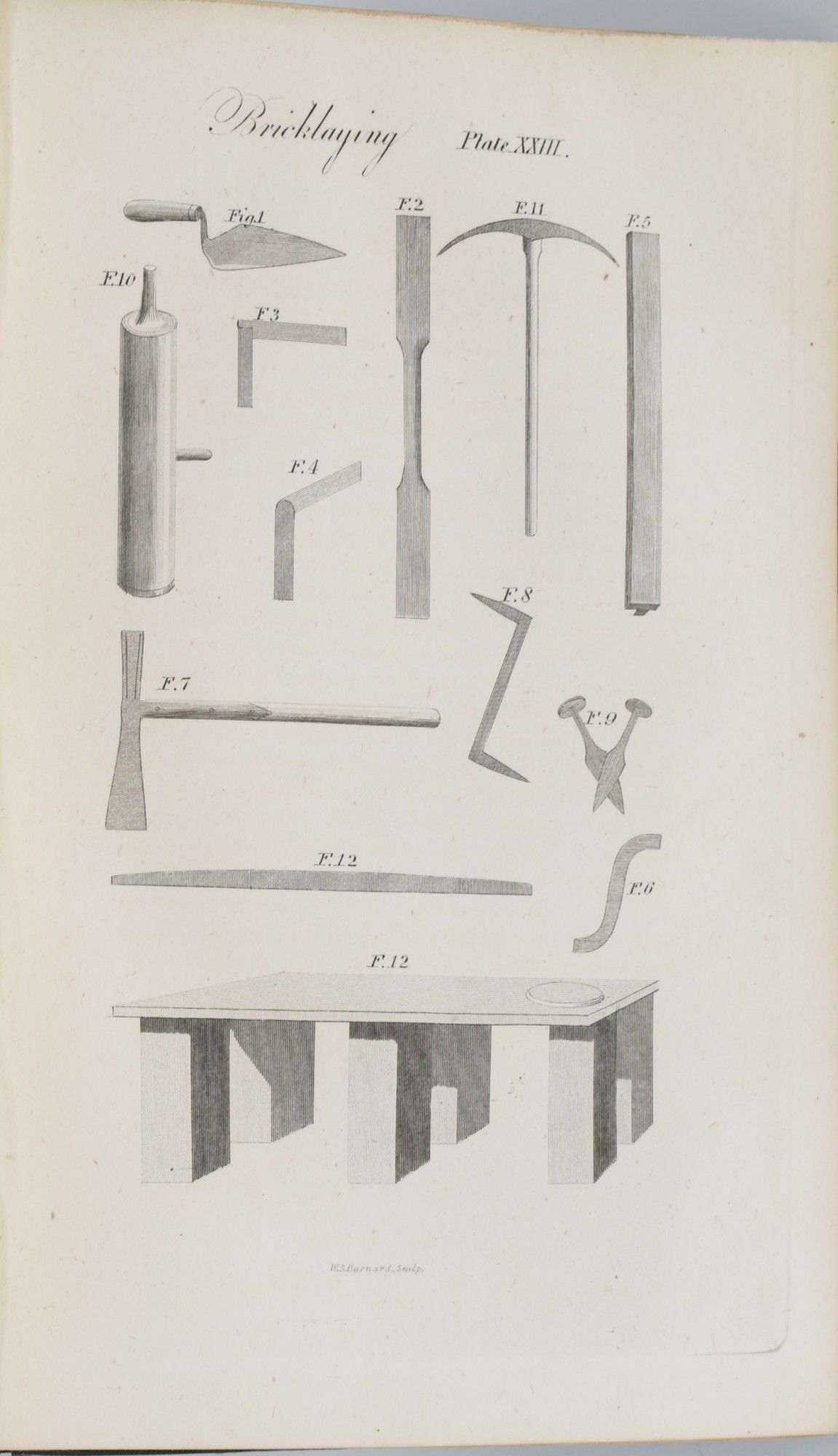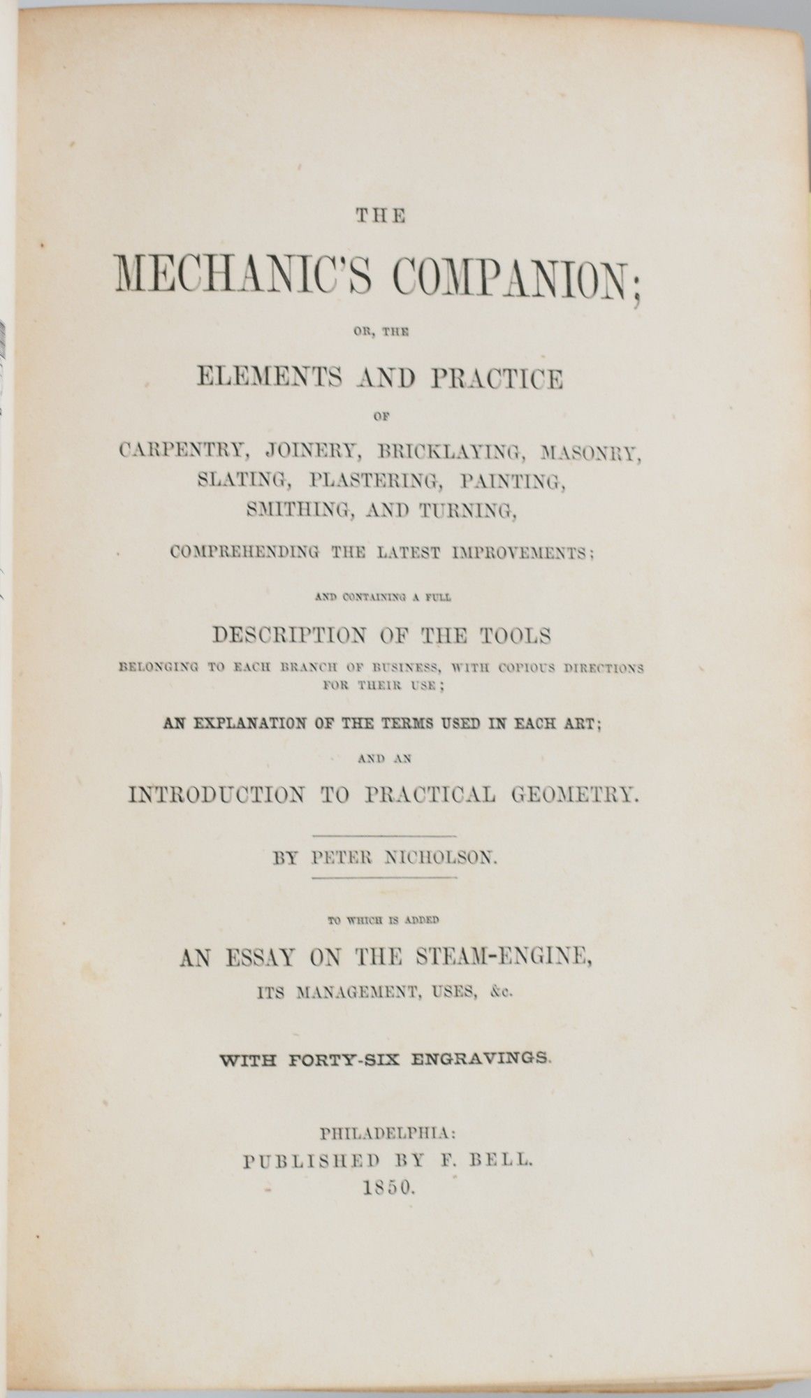 [ARCHITECTURE] THE MECHANIC'S COMPANION; OR, THE ELEMENTS AND PRACTICE OF CARPENTRY, JOINERY, BRICKLAYING, MASONRY, SLATING, PLASTERING, PAINTING, SMITHING, AND TURNING, COMPREHENDING THE LATEST IMPROVEMENTS; AND CONTAINING A FULL DESCRIPTION OF THE TOOLS ... WITH AN ESSAY ON THE STEAM ENGINE WITH FORTY SIX ENGRAVINGS