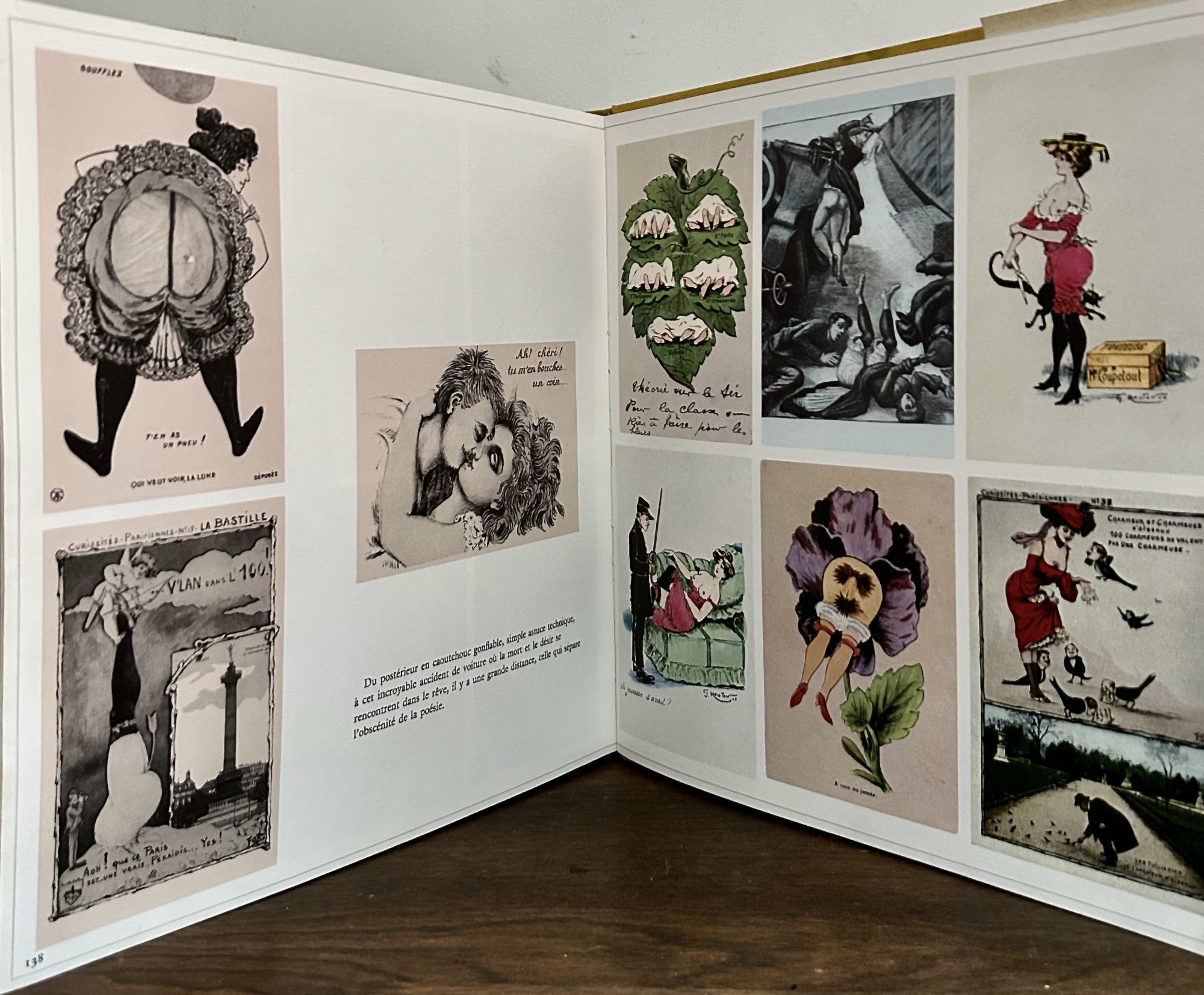 Paris: Andre Balland, 1966. First edition. Hardcover. Orig. yellow cloth, covers and spine printed in red. Fine in mottled very good dust wrapper. 152 pages. 31 x 31 cm. A cornucopia of color and black and white illustrations on lustrous stock with high quality imagery. Text in French. Post Card subjects cover politics, religion, military, war, women and eroticism. Interior contents very clean and bright. Index.