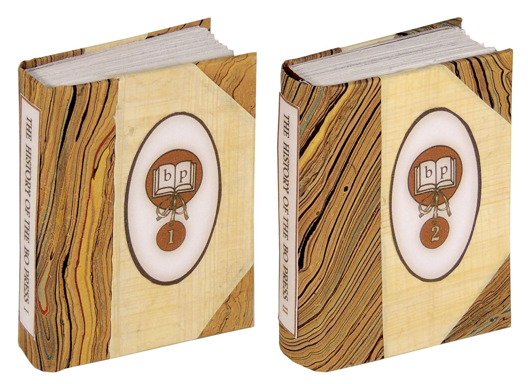 The History of Bo Press is a collection of every book I’ve ever written, illustrated, designed, and published (that I can remember) since then. This is a fairly easygoing bibliography, and a few lacunae are to be expected from someone like me who hates to keep records. The book listings include title, author, illustrator, and pages." Both volumes are bound in tan marbled paper with paper title labels to spines and front boards. Housed in a slipcase covered in marbled paper and off-white handmade paper with a metal chain lining the seams of where the papers meet. Each volume is 170 pages. Size: Books: 2 3/4 x 2 1/8 inches; Case: 3 x 2 1/4 x 1 5/8 inches. ARTB/091123.