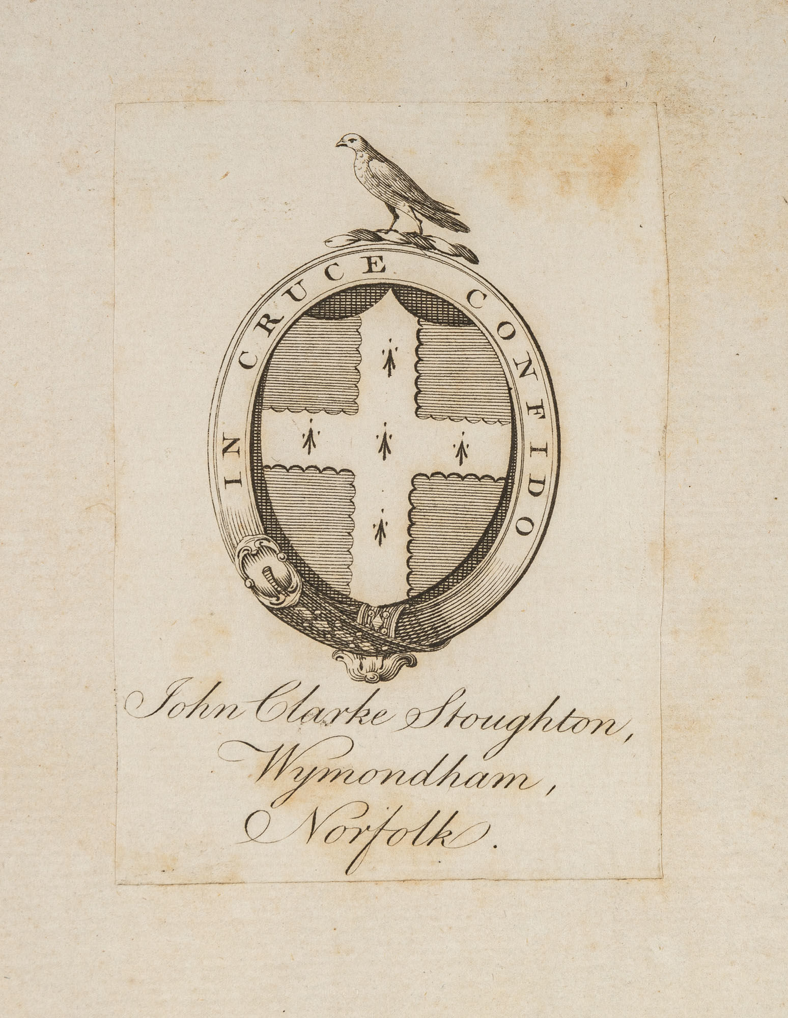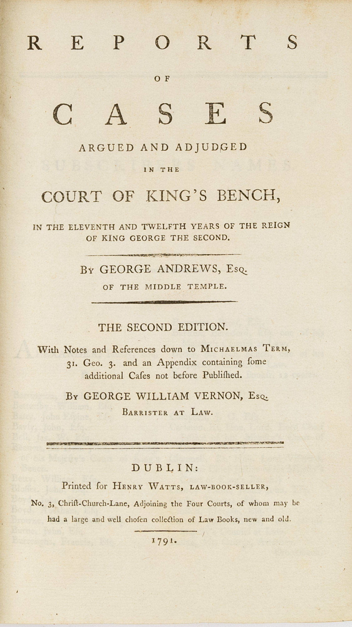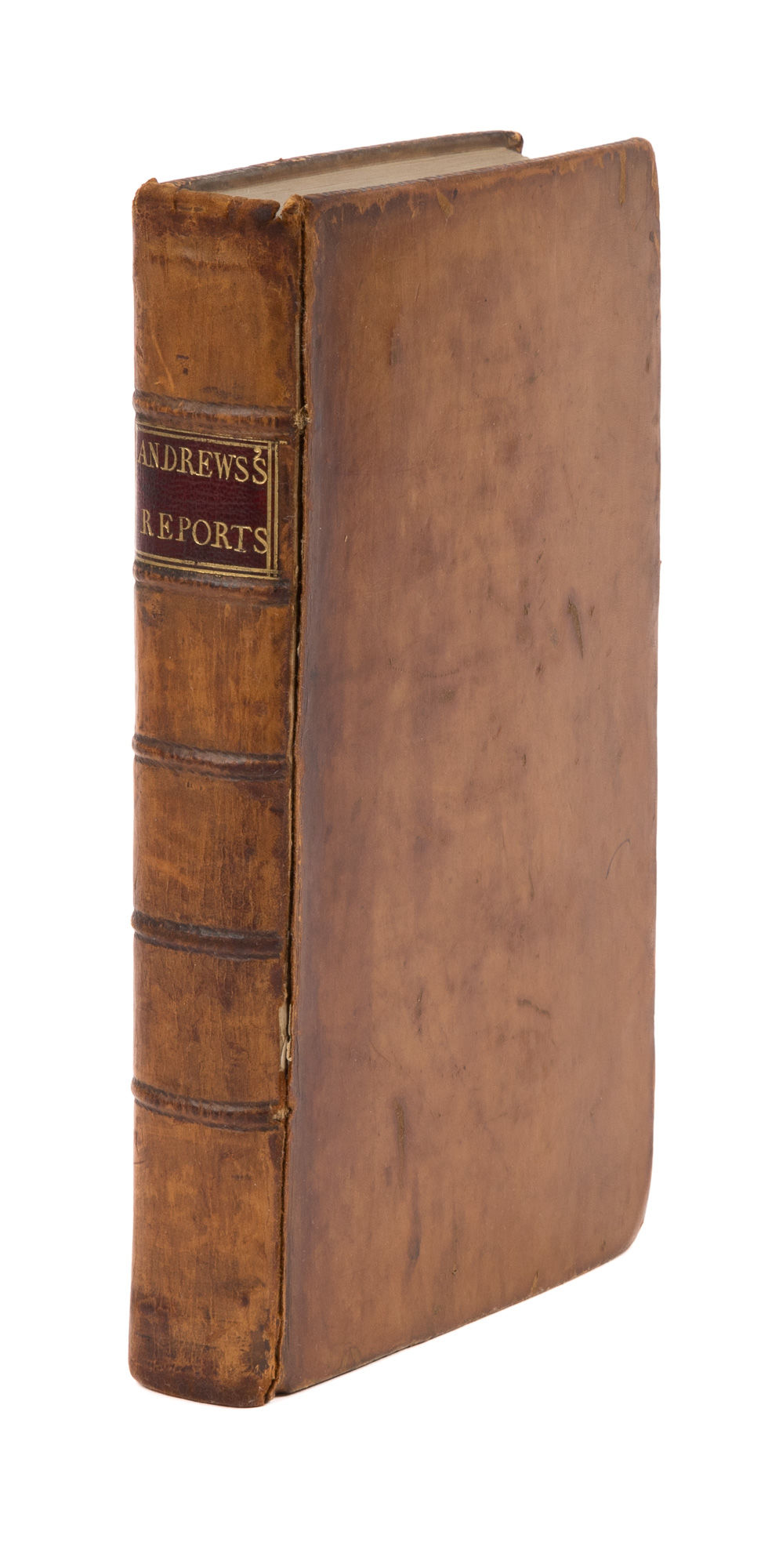 1791. Dublin: Printed for Henry Watts, 1791. 2nd ed.. Dublin: Printed for Henry Watts, 1791. 2nd ed. "Very Much Esteemed by the Profession" Andrews, George. Reports of Cases Argued and Adjudged in the Court of King's Bench, In the Eleventh and Twelfth Years of the Reign of King George the Second. With Notes and Referenced Down to Michaelmas Term, 31. Geo. 3. And an Appendix Containing Some Additional Cases Not Before Published. Dublin: Printed for Henry Watts, Law-Book-Seller, 1791. xiii, [15], 397 (i.e. 487, star-paged), xiv, [42] pp. Octavo (8" x 5"). Contemporary calf, raised bands and lettering piece to spine, blind tooling to board edges. Light rubbing and some shallow scuffs to boards, front board separated but secured by cords, chipping to head of spine, corners bumped and lightly worn, light foxing to edges of text block, armorial bookplate (of John Clarke Stoughton) to front pastedown. Light toning to interior, very small faint stains to margins of a few pages, clean tear to fore-edge of leaf Ee3 (*P 343) affecting side-note without loss to legibility, brief annotation to one page of unnumbered table at rear. $500. * Second edition, one of three Dublin issues identified by the ESTC. Covering the years 1738-1740, this set of reports was, to quote Wallace, "very much esteemed by the profession in general." Marvin notes that "Andrews has usually given a fuller and more satisfactory report of these cases than is found in reports of the same period." The first edition was published in London in 1754 and the final edition in London in 1792. Stoughton [17666-1804] was an attorney and churchwarden of Wymondham Abbey in Norfolk. Wallace, The Reporters 440. Marvin, Legal Bibliography 61. English Short-Title Catalogue (ESTC) T176096.