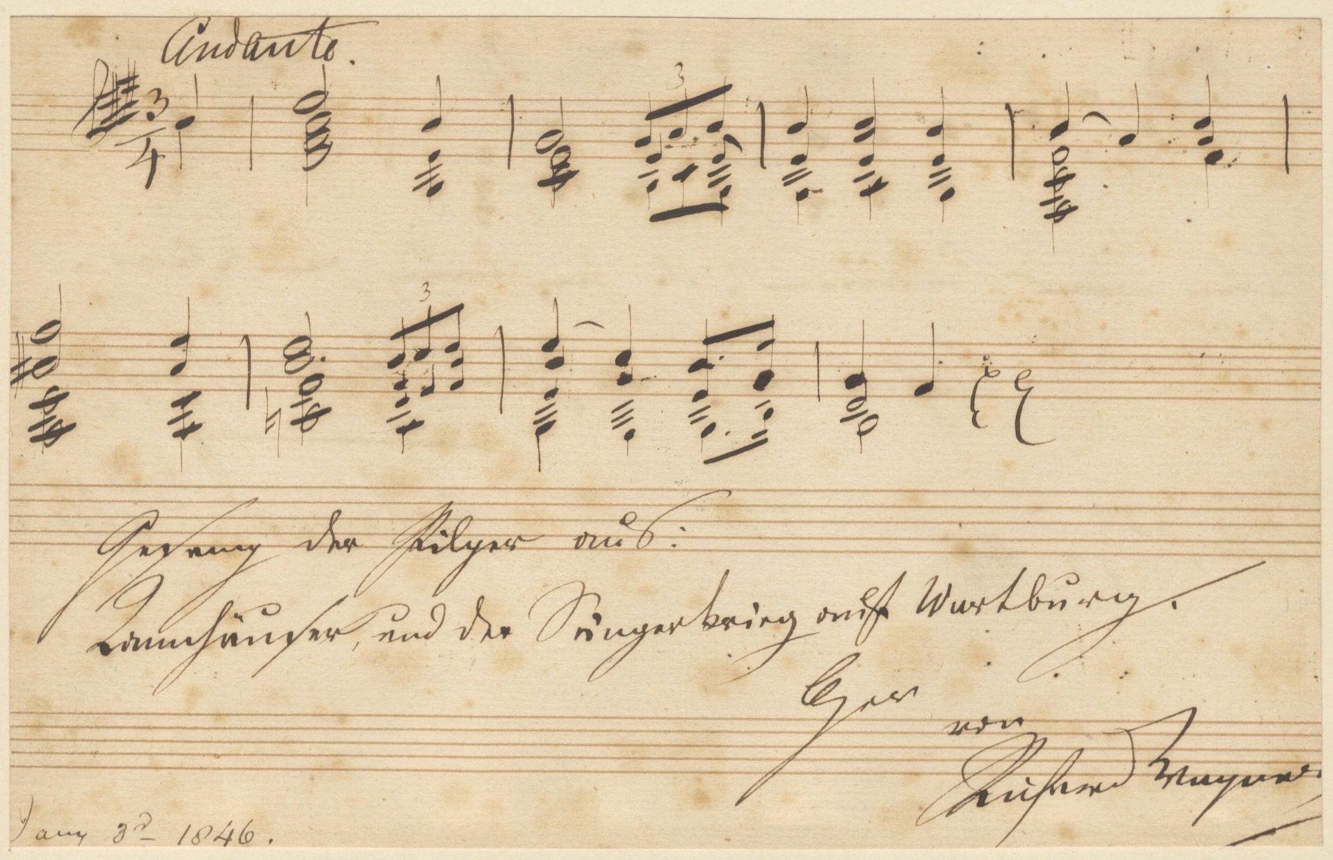 Oblong octavo (101 x 160 mm. ). The first 8 measures. Notated in black ink on four staves, the four vocal parts incorporated into one stave. Inscribed below the quote: "Gesang der Pilger aus Tannhäuser, und der Sängerkrieg auf Wartburg ... von Richard Wagner." With the date "Janu. 3d, 1846" in the hand of the British concert manager and critic John Ella (1802-1888) at lower left, presumably the day on which Wagner both penned the quotation and presented it to Ella.