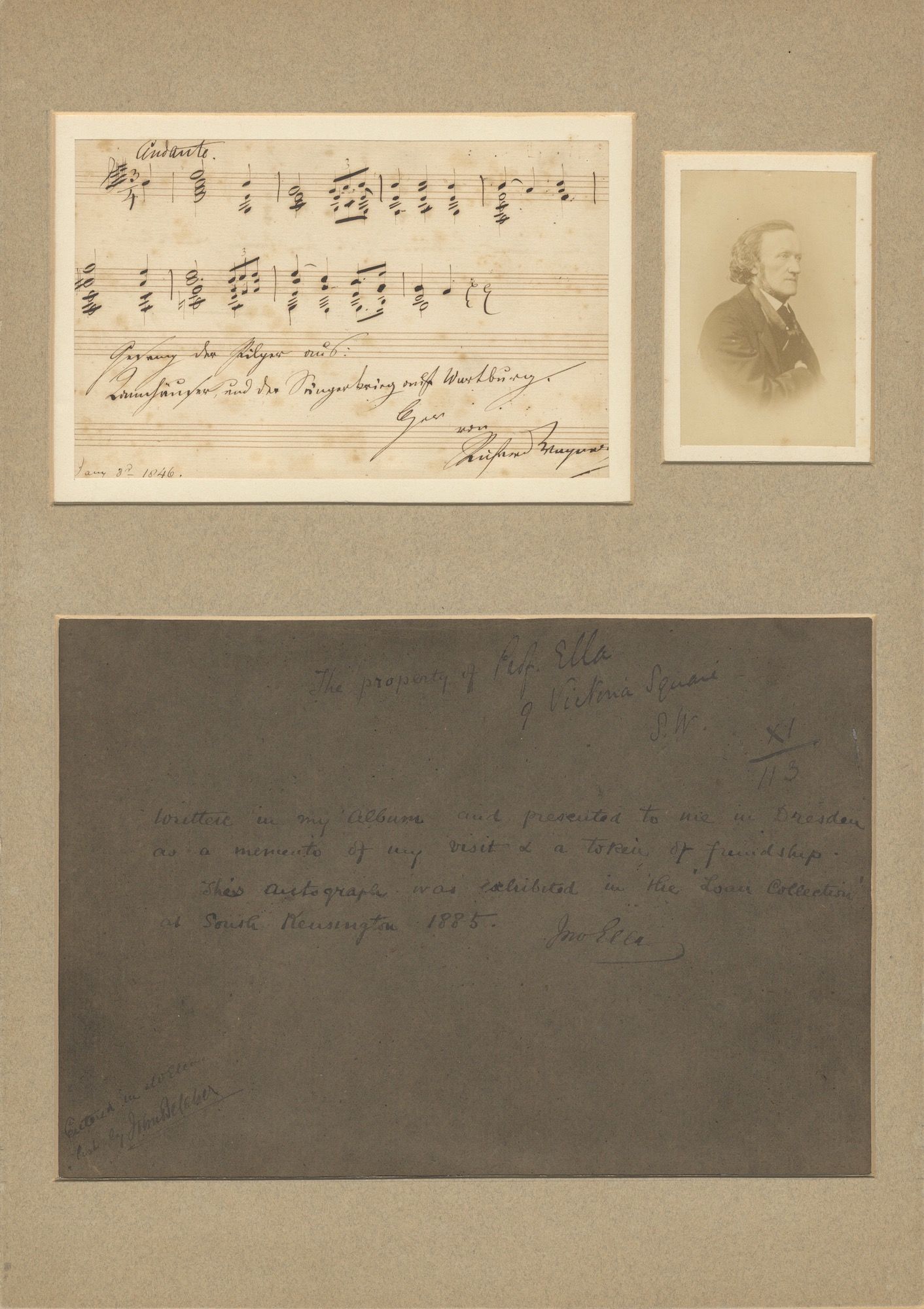 A 1-page (167 x 245 mm.) autograph statement in Ella's hand relating how he acquired the present autograph: "The property of Prof. Ella, 9 Victoria Square S.W, XI/113. Written in my Album and presented to me in Dresden as a memento of my visit & a token of friendship. This Autograph was exhibited in the 'Loan Collection' at South Kensington 1885 Jno Ella. Entered in collection list by John Belcher."