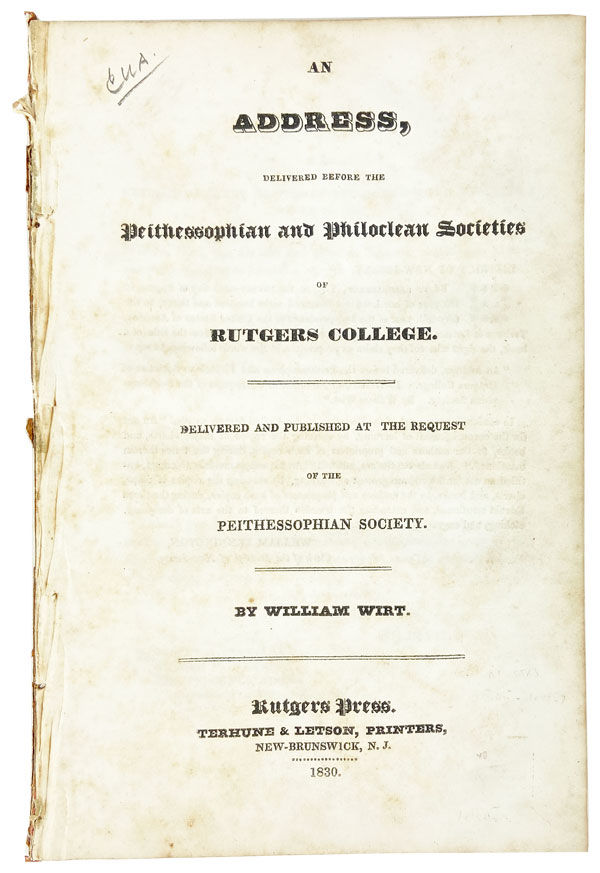 Address by William Wirt (lawyer, orator, and presidential candidate) addressing to two Rutgers student societies on education.