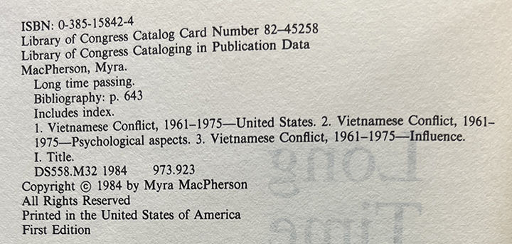 Garden City: Doubleday and Company, Inc, 1984. First Edition. Hardcover. Fine/Near Fine. Fine in a Near Fine jacket, unclipped ($19.95), toned at the flaps, lightly rubbed at the edges. Quarter black cloth with grey paper on the boards. Square and firmly bound, clean internally. MacPherson's "comprehensive study of the war's impact on the generation that was asked to fight it," the product of more than 500 interviews.