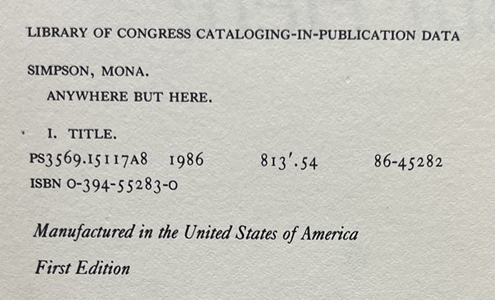 New York: Alfred A. Knopf, 1987. First Edition. Hardcover. Fine/Fine. Fine in a Fine jacket, unclipped ($18.95), lightly bumped at the edges. Quarter blue cloth with beige paper on the boards. Square and firmly bound, clean internally. Simpson's prize-winning debut novel, adapted into the 1999 film of the same title starring Susan Sarandon and Natalie Portman.