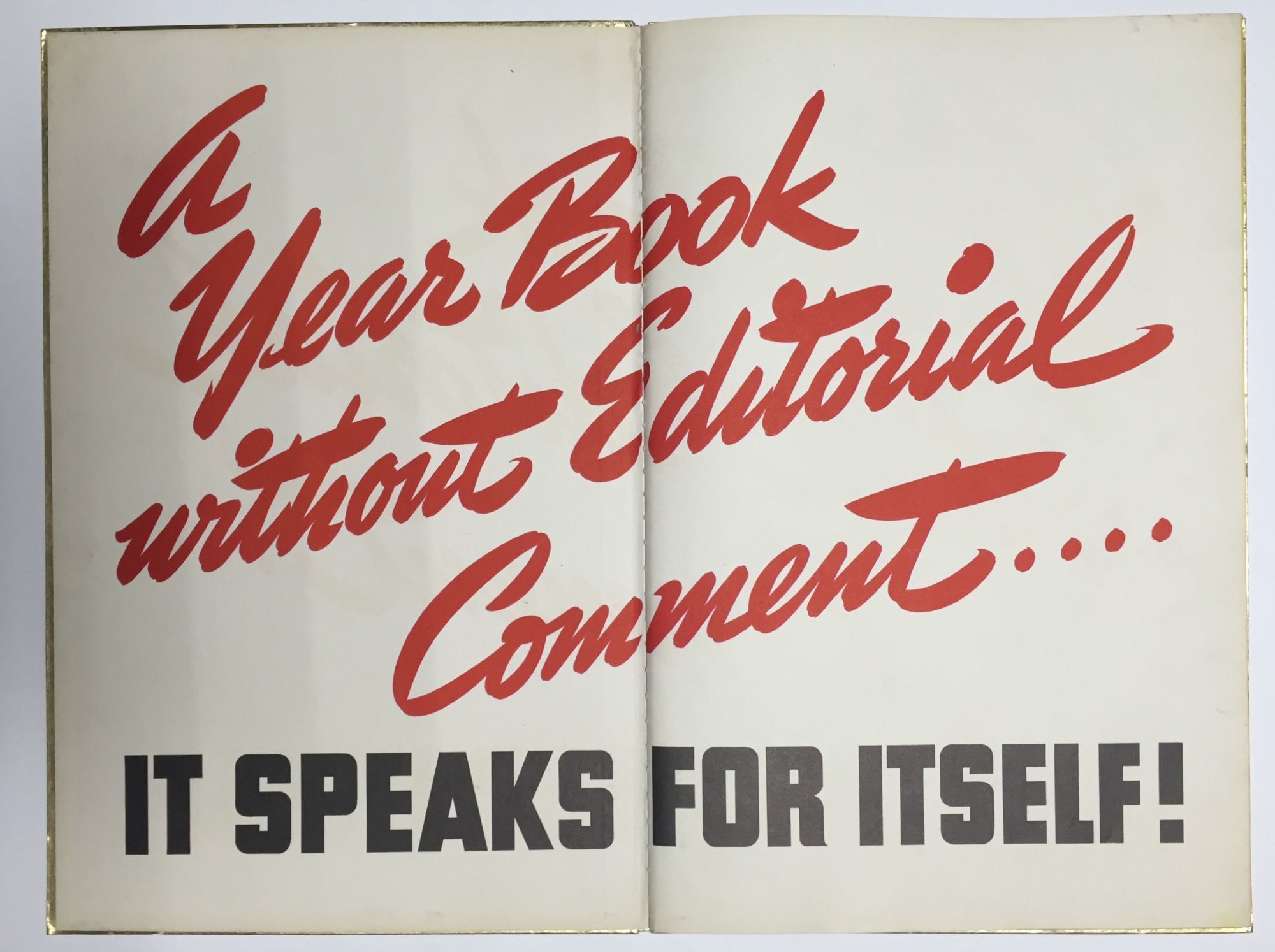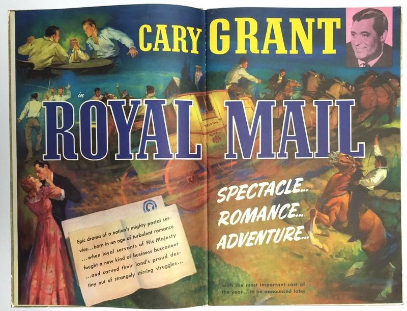[Hollywood] / (New York): [Columbia Pictures] / (Polygraphic Company of America), 1940. First Edition. Very good.. Lavish promotional book of full-bleed and -color lithographed illustrations advertising upcoming programs for Columbia Pictures' 1940-1941 season. Likely distributed to theater owners and clearly produced well in advance of actual production, the book contains a disclaimer stating that properties may not be produced precisely as advertised. And indeed, most of the films advertised did not make it into theaters, or did so with different stars or under different titles. Of the films included, 11 appear to be completely unrealized, with most of the remaining either produced under different titles, with different principals, or both. Most of the pictures rely heavily on Columbia's roster of contract players: Cary Grant, Loretta Young, Melvyn Douglas, Jean Arthur, etc. Star directors like Charles Vidor also feature prominently. While many of the pictures seem well on their way to production — with directors, writers and stars attached — some seem to be little more than ideas, such as "Canal Zone" or "I Joined the Bund," with generic titles evoking timely topics. In addition, a handful of CBS radio plays are advertised as well, including Ellery Queen and Blondie. An uncommon look into film marketing and production at the height of the studio era. Only two holdings in OCLC; especially rare with original mailer. Hardcover. Folio. 18.5" x 12.25" approx. Metallic gold paper covered boards with titles printed in red and blue. Rubbing to boards. Some light wear at spine ends. Interior bright and sharp. In original brown card mailer, worn at edges with moderate damp-staining (not effecting book) at one end. 50pp. Very good overall.