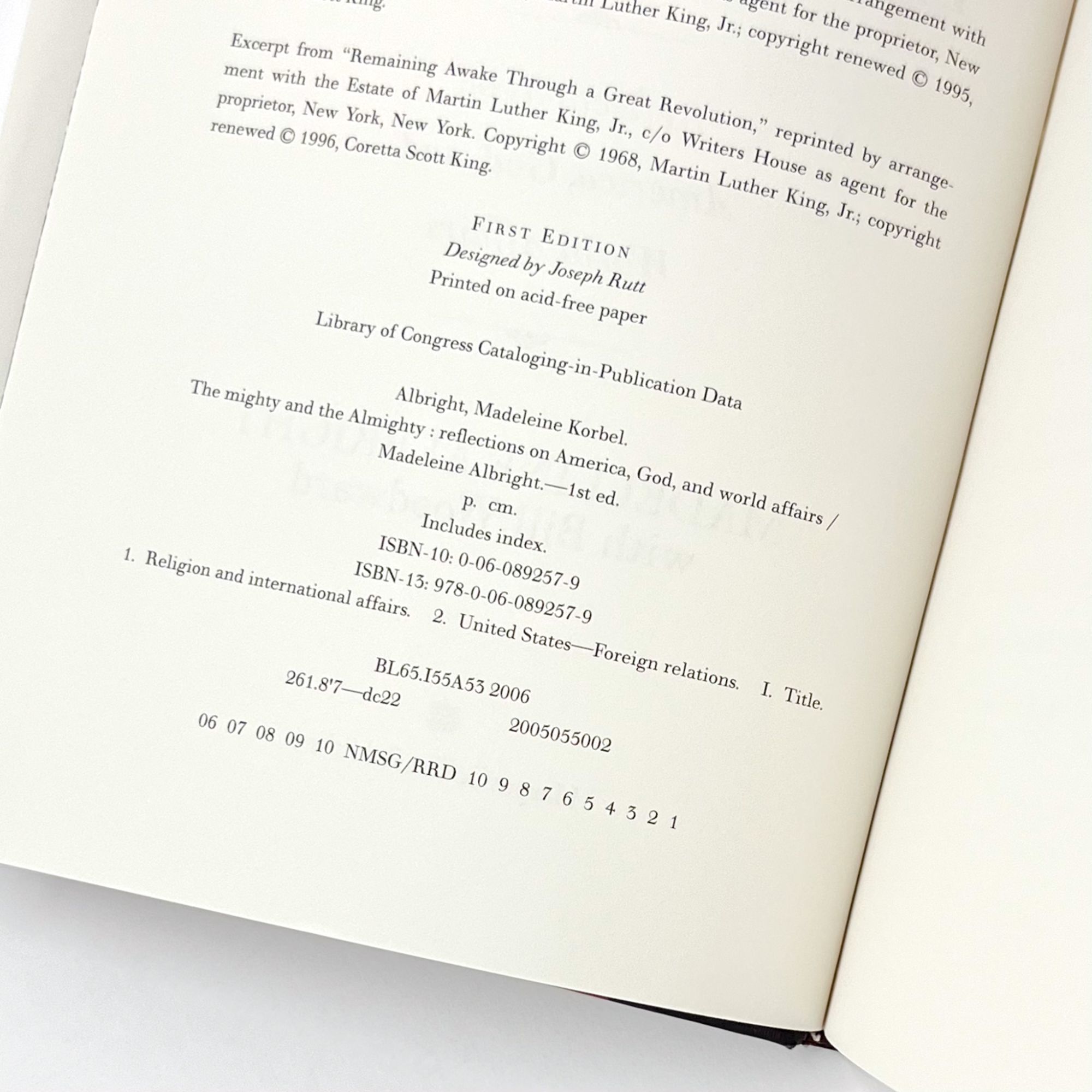 New York: Harper Collins, 2006. First edition. Near fine in a near fine jacket.. Signed first printing of the former Secretary of State's examination of the influence of Christianity in American attitudes and political discourse, and its impact in world affairs. 9'' x 6''. Publisher's boards in original unclipped ($25.95) dust jacket. Inscribed by Albright at half title. Minor wear to edges of dust jacket. Faint crease at front flap. Boards fresh. Interior bright and clean. 339, [1] pages.