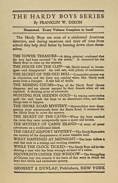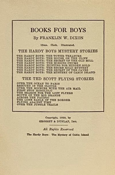 New York: Grosset & Dunlap, 1929. Reprint. Hard Cover. Very Good/Good. 0x0x0. Rogers, Walter S. Early reprint (Carpentieri 1934B-10), front flap lists through Mark on the Door (book 13), copyright page through Cabin Island, rear ad through Footprints Under the Window (book 12). Ink gift note dated June 28 1938 on recto of frontispiece, a few faint spots on fore edge, jacket edges rubbed with minor loss from corners, jacket toned. 1929 Hard Cover. iv, 214 pp., 6-page terminal publisher ad. Light brown cloth, dark brown titles, orange Gretta endpapers. #8 in the Hardy Boys series. Glossy frontispiece by Walter S. Rogers. With two mysteries to solve, Frank and Joe must climb aboard their iceboat the Sea Gull to reach Cabin Island, where a belligerent stranger orders them off. Sabotage to the boat, danger to themselves, and a ghostly prowler do not daunt the Hardy boys in their search for Johnny Jefferson and for clues to stolen antique medals. How the teenage investigators outwit a ruthless foe and succeed in solving both mysteries makes for mounting suspense in this brisk-paced adventure.