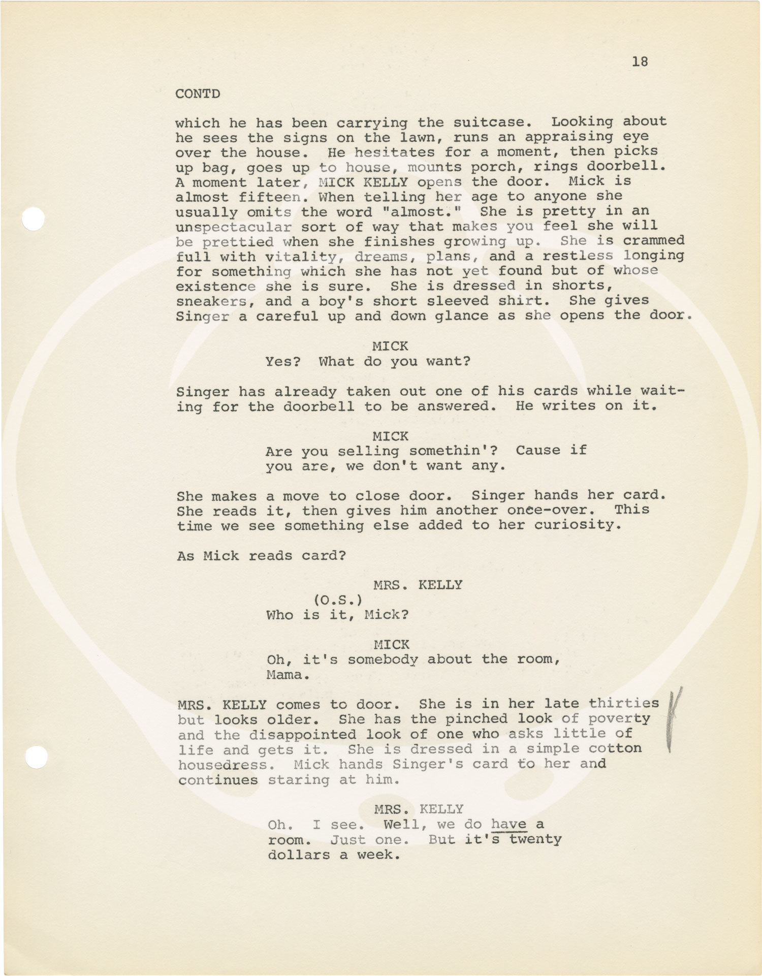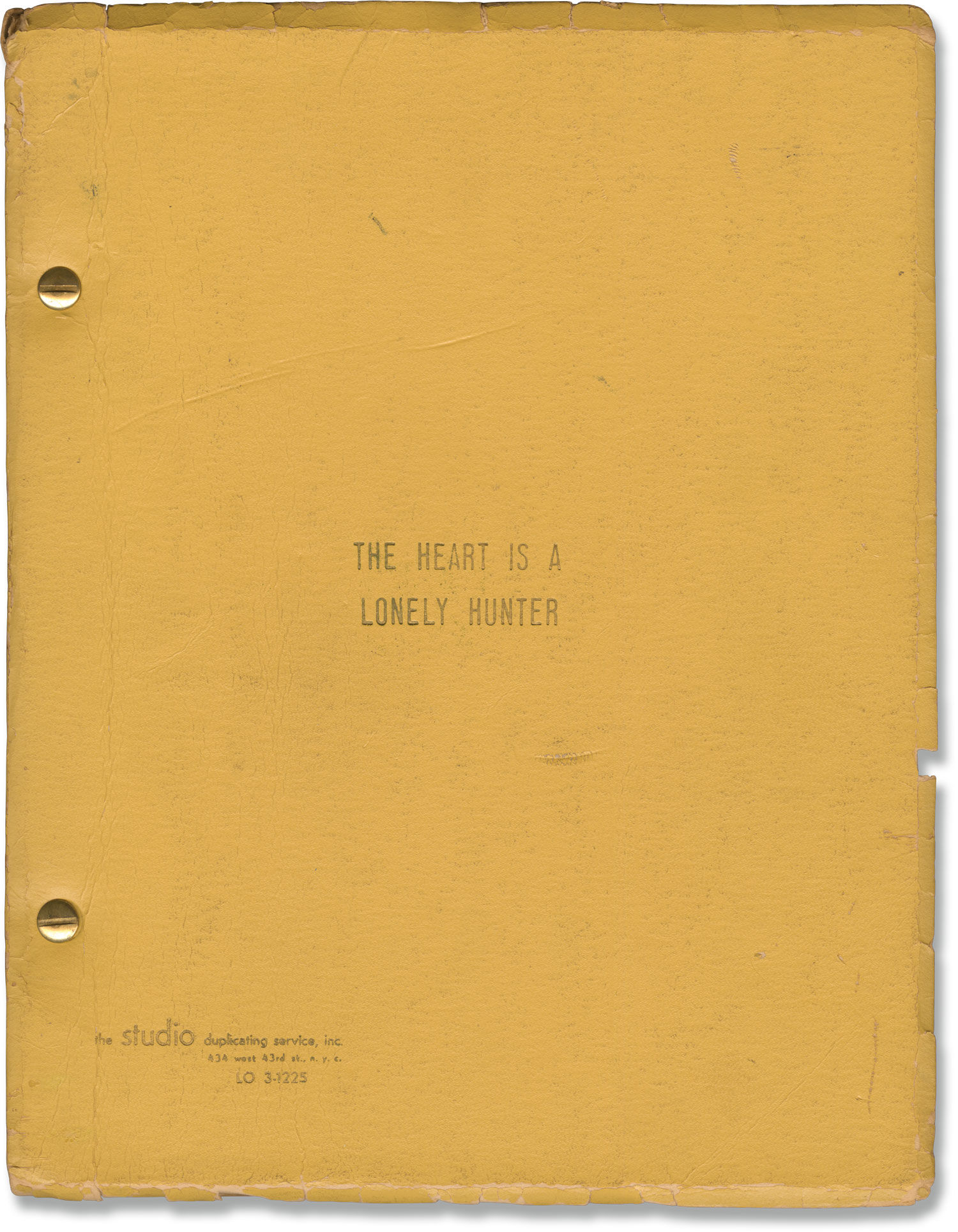 Goldenrod titled wrappers. Title page present, noted as REVISED, with credits for screenwriter Thomas C. Ryan and novelist Carson McCullers. 145 leaves, with last page of text numbered 144. Mimeograph duplication, rectos only. Pages Fine, wrapper Very Good plus, bound with two gold brads.