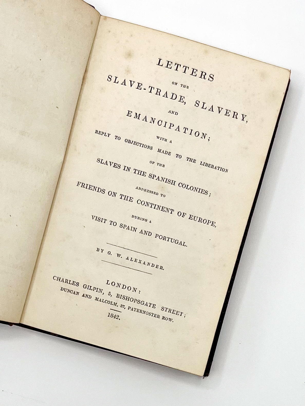 London: Charles Gilpin, 1842. Near fine.. First edition of these essays presenting arguments for the international abolition of the slavery by the Treasurer of the British and Foreign Anti-Slavery Society, specially bound for presentation and inscribed by the author. After the victories of the triumphant generation of British abolitionists such as William Wilberforce, Thomas Clarkson, and Ottobah Cugoano, whose efforts led to the outlawing of the slave trade in 1807 and legal eradication of slavery in the British Empire in 1833, anti-slavery advocates in Britain did not remain complacent. In 1839 a new generation of abolitionists founded the British and Foreign Anti-Slavery Society (BFASS), through which the wealthy merchant and Quaker George William Alexander "emerged [...] as a leader in the British Abolitionist movement" (Rodriguez, 16). In his role as Treasurer he donated vast amounts of his own money to the Society, which sought not only the end of slavery internationally but stricter enforcement of abolitionist laws already in place.