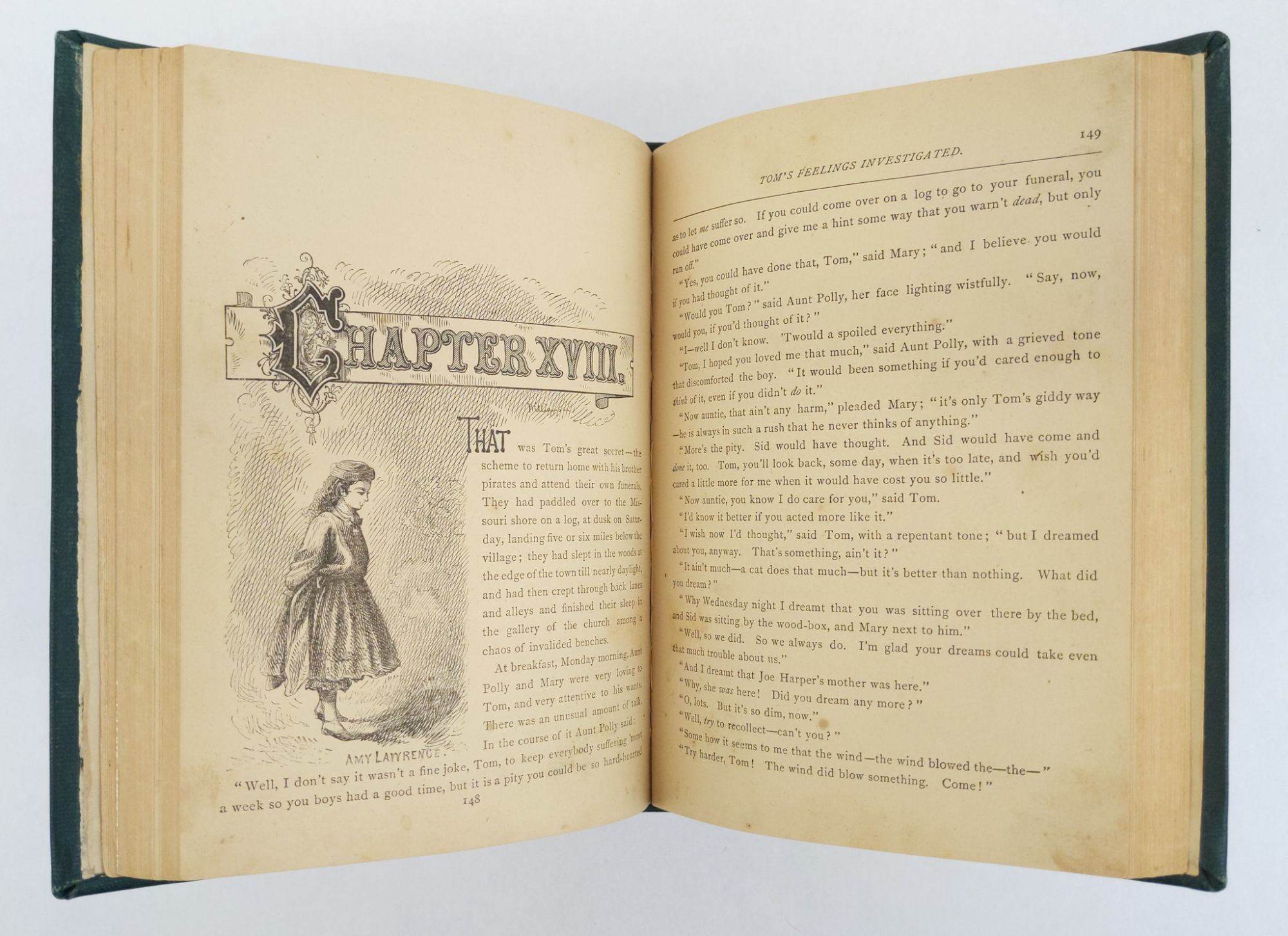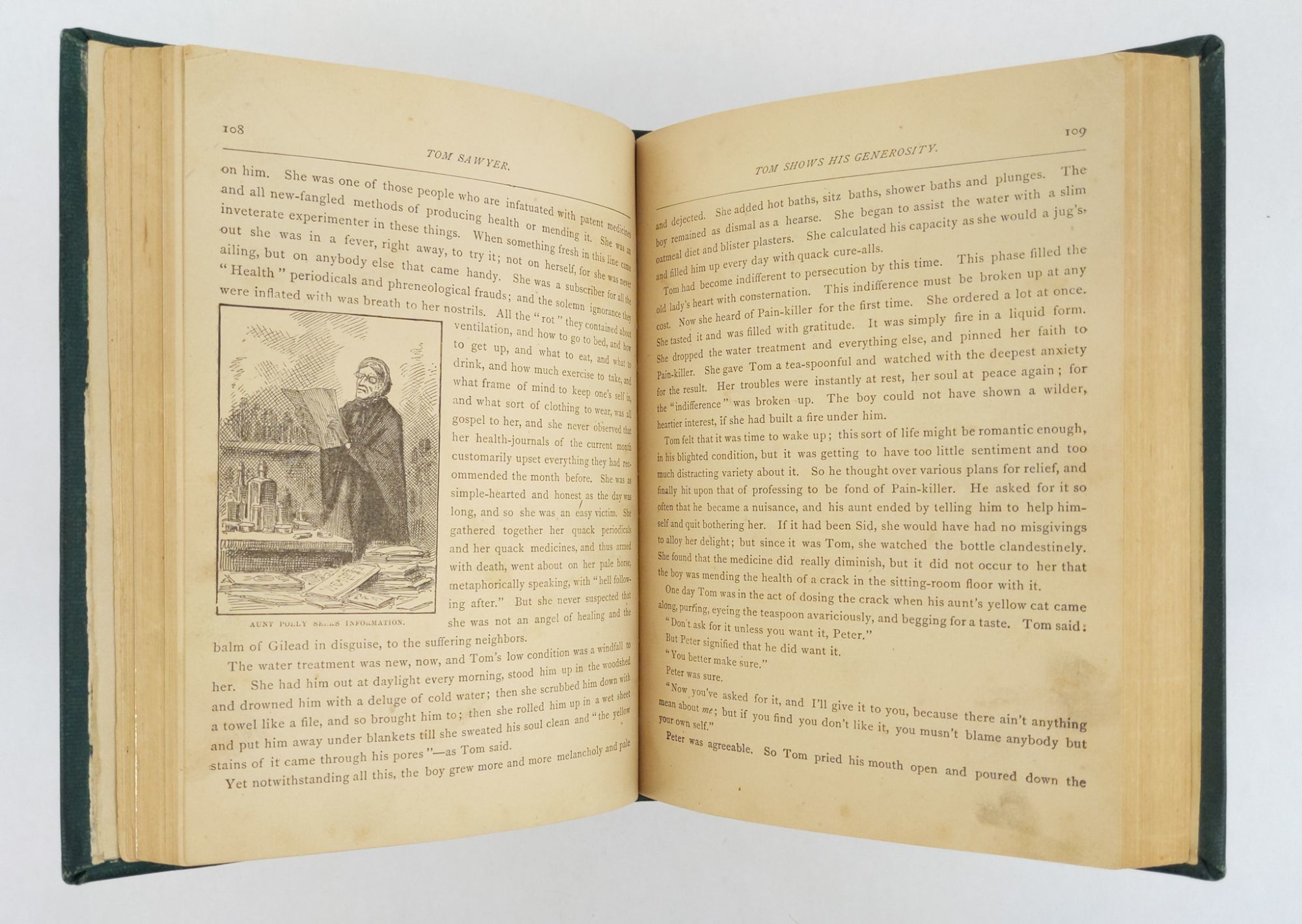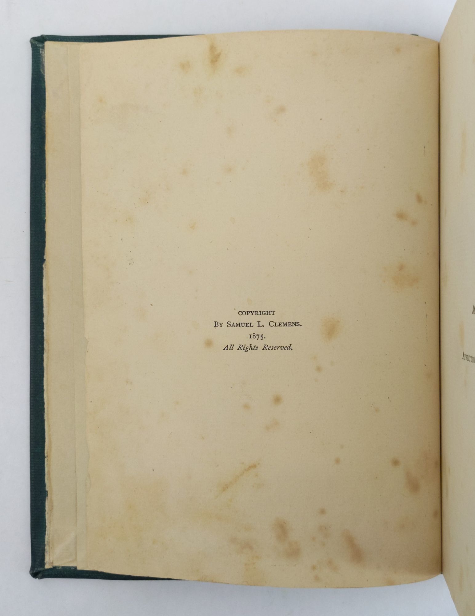 Hartford: The American Publishing Company, 1876. First Edition, Second Printing. Hardcover. Octavo, [I]-XVI, [17]-[275] pages. In Fair condition. Rebound in green cloth with gilt lettering on spine. Boards show mild edge wear and shelf wear. Text block has been closely trimmed to text and has mild to moderate foxing to pages, tearing and tape to fore edge of pages 33/34, non archival tape repairs on pages 77 and 97, and staining to title page. During the rebinding the frontispiece has be lost. Before the title page there is an ad leaf, or a page with an ad pasted on, but most of the ad has been removed except for the top tine that reads "How well do you know your America?..." BAL 3369. [Shelved in Room G]. Second Printing, Issue A. 1372607. Special Collections.