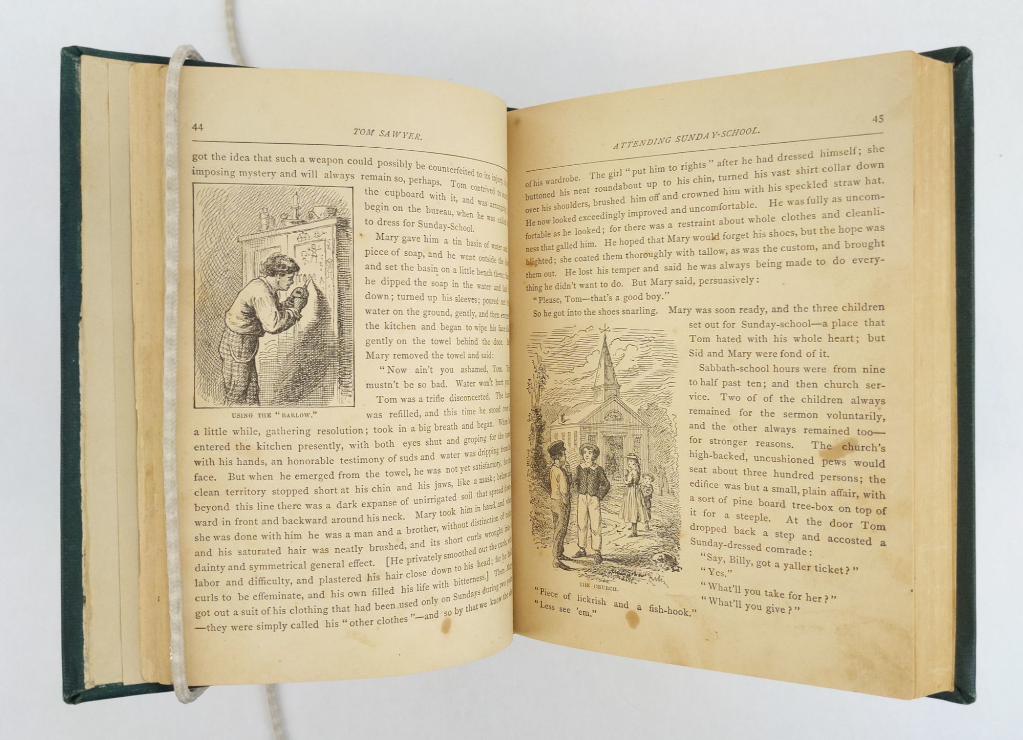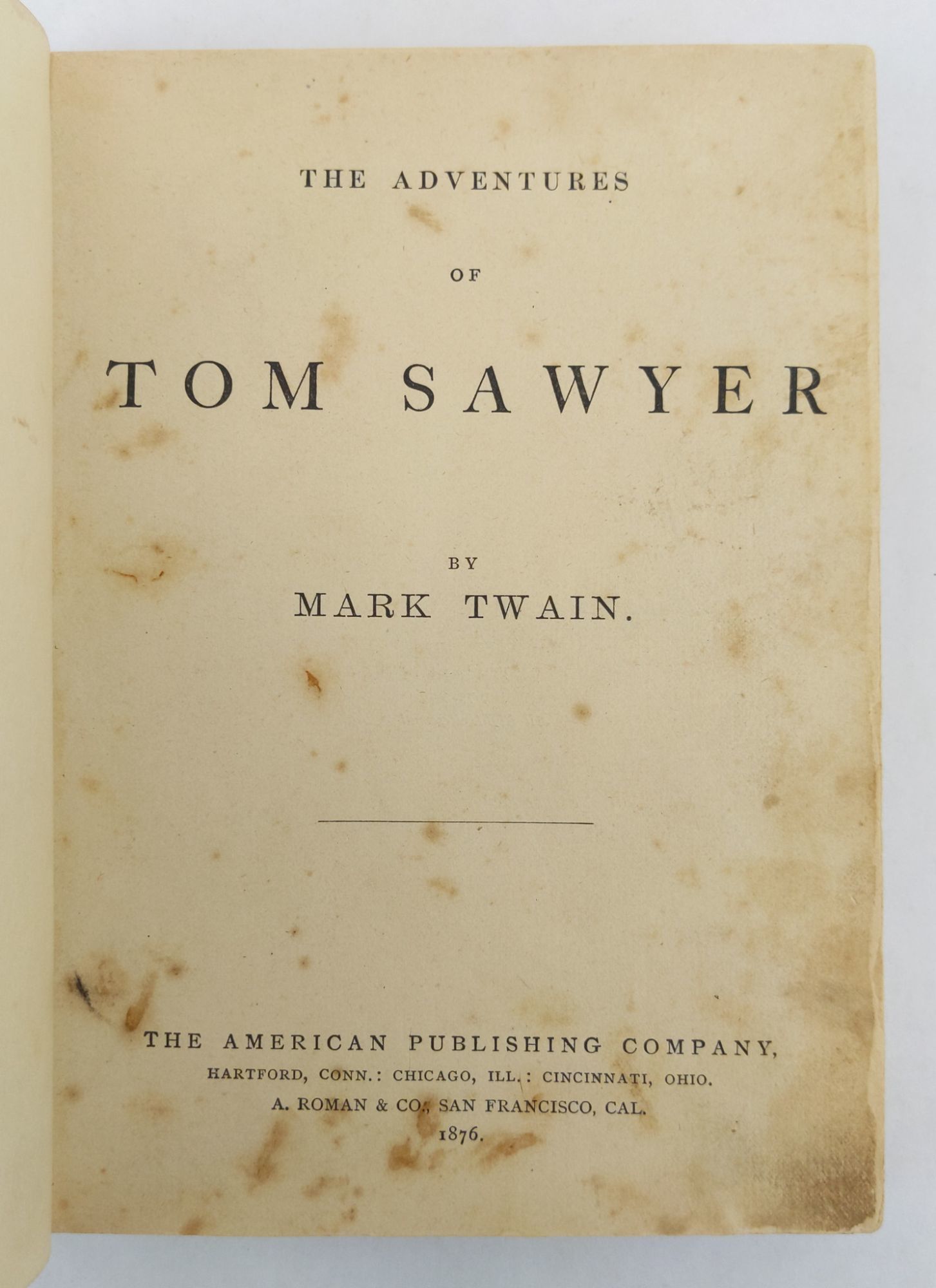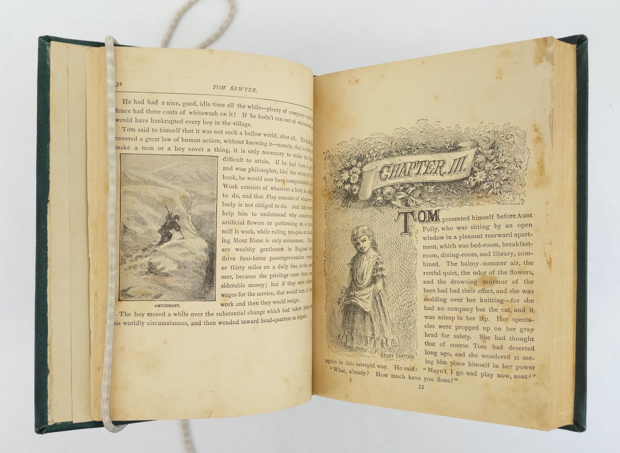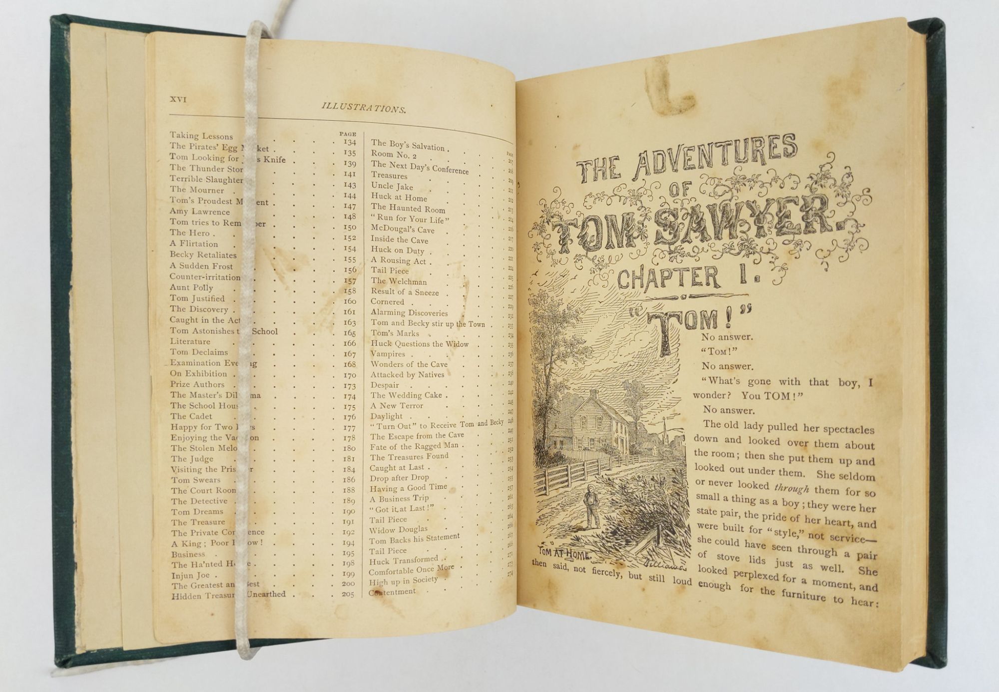 Hartford: The American Publishing Company, 1876. First Edition, Second Printing. Hardcover. Octavo, [I]-XVI, [17]-[275] pages. In Fair condition. Rebound in green cloth with gilt lettering on spine. Boards show mild edge wear and shelf wear. Text block has been closely trimmed to text and has mild to moderate foxing to pages, tearing and tape to fore edge of pages 33/34, non archival tape repairs on pages 77 and 97, and staining to title page. During the rebinding the frontispiece has be lost. Before the title page there is an ad leaf, or a page with an ad pasted on, but most of the ad has been removed except for the top tine that reads "How well do you know your America?..." BAL 3369. [Shelved in Room G]. Second Printing, Issue A. 1372607. Special Collections.