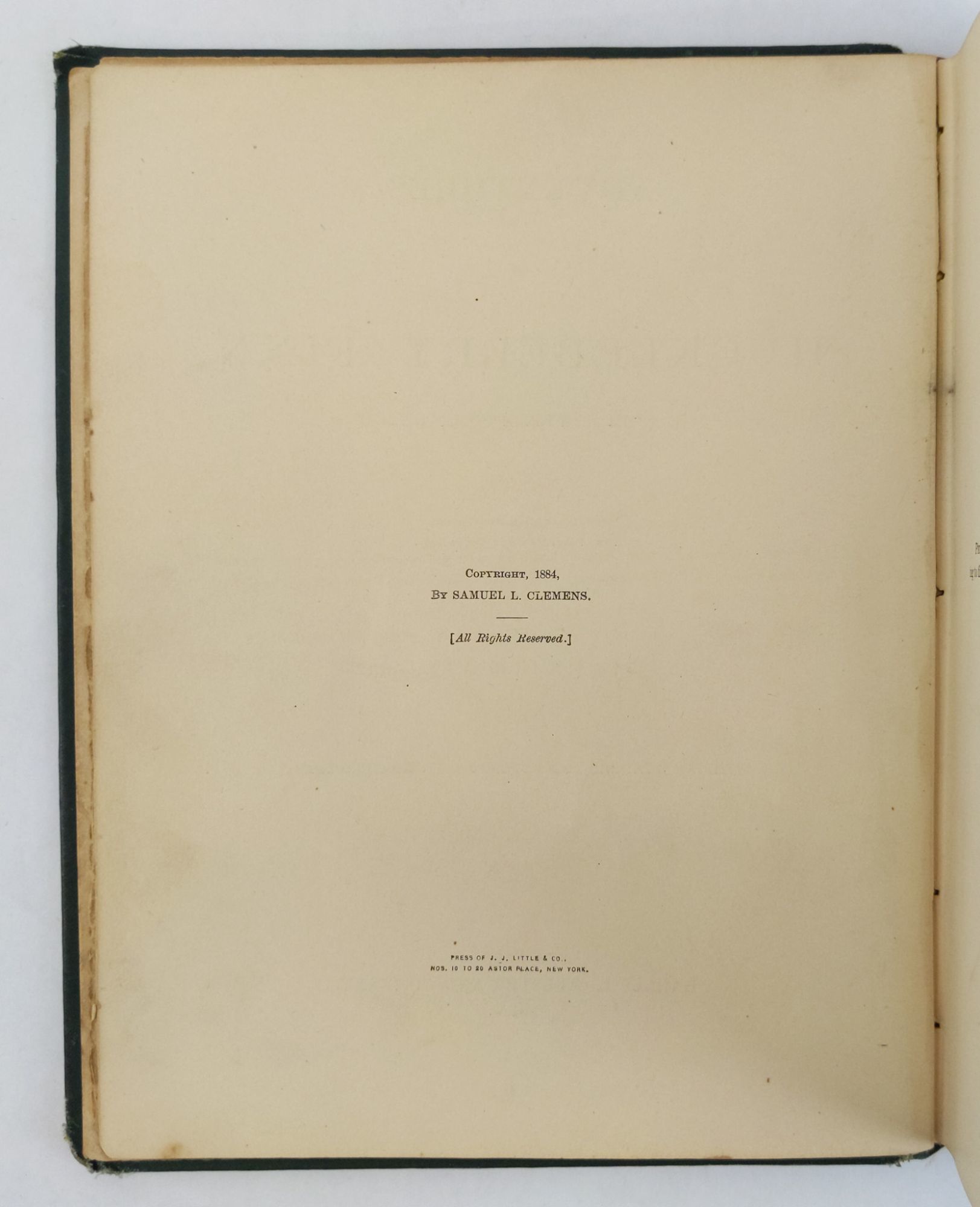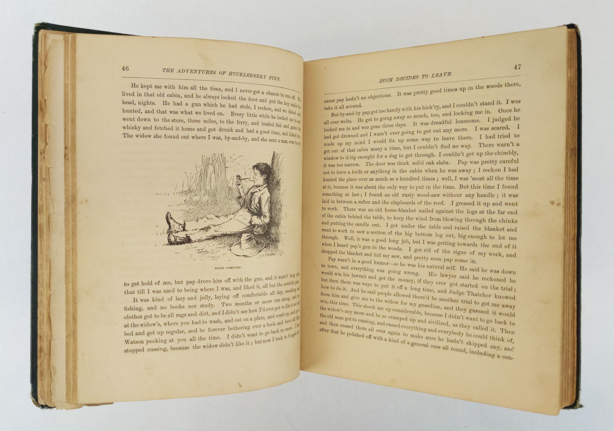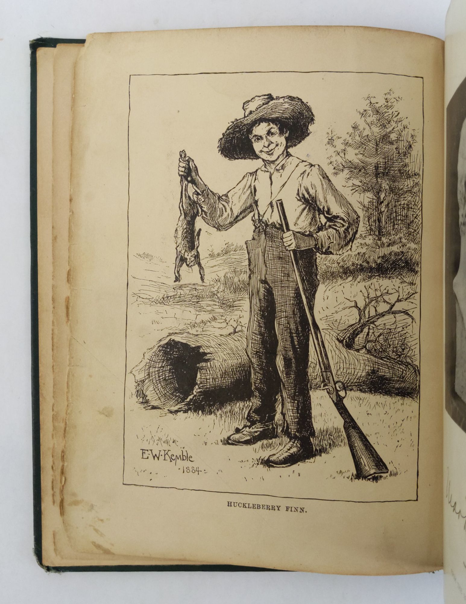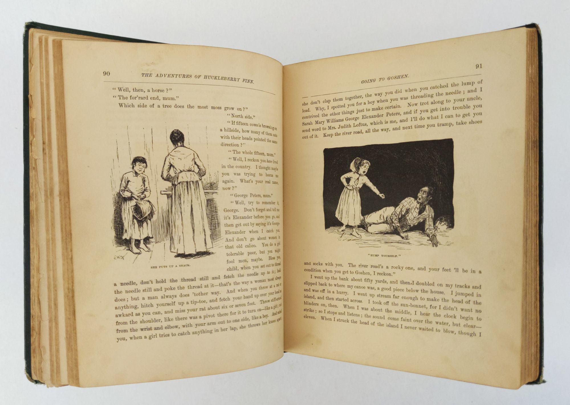New York: Charles L. Webster, 1885. First Edition. Hardcover. Octavo, [1]-366 pages. In Fair condition. Bound in green cloth with gilt and black lettering and decoration. Boards show rubbing to corners exposing boards, bumping to corners, fraying to spine edges, boards exposed along tail edges, head edge of spine partially chipped off, and mild to moderate edge and shelf wear. Binding somewhat shaken. Text block has splitting to interior hinges, light age toning, last page of illustration list detached, light gray staining on some forward pages, and tearing to fore edge of some forward pages. Points includes: List of illustrations has page 88 rather than page 87, "was" instead of "saw" on page 57, last 5 in 155 on page 155 set slightly lower than other numbers, Leaf 23 8 pasted under Terminal endpaper, and earliest portrait frontispiece with "Heliotype Printing Co." BAL 3415. [Shelved in Room G]. 1372620. Special Collections.