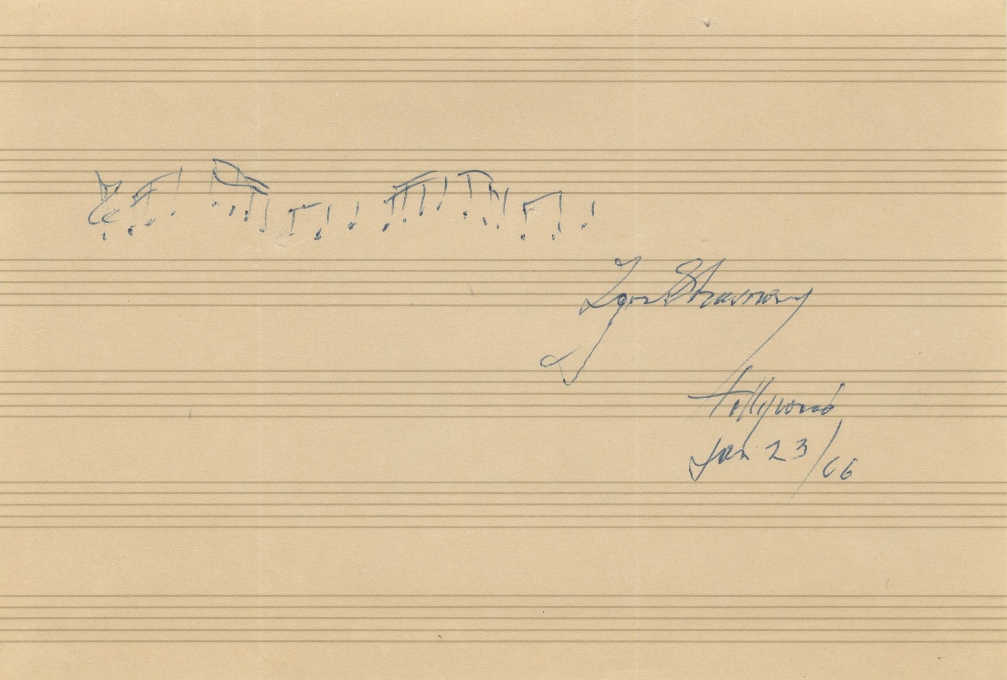 Four measures containing the theme of the closing of the first scene of the composer's Danse Russe. Notated, unbarred, on dark ivory music paper in blue ink, signed and dated Hollywood 23 January 1966. On an album leaf 141 x 199, laid down to backing board.