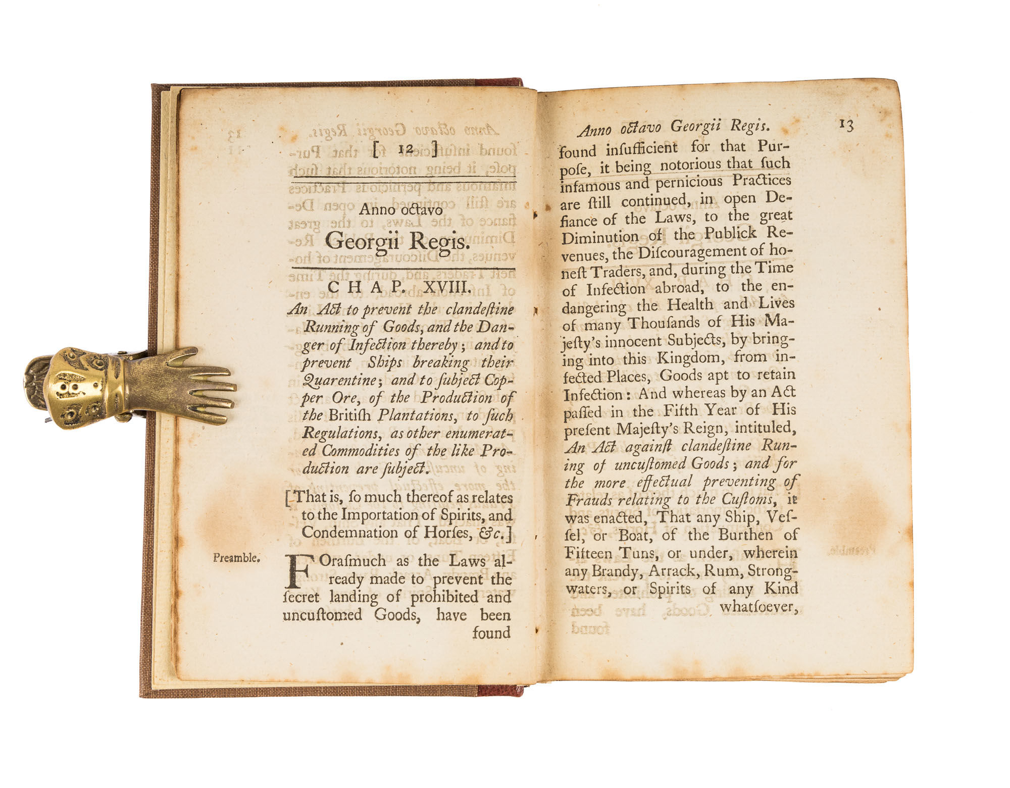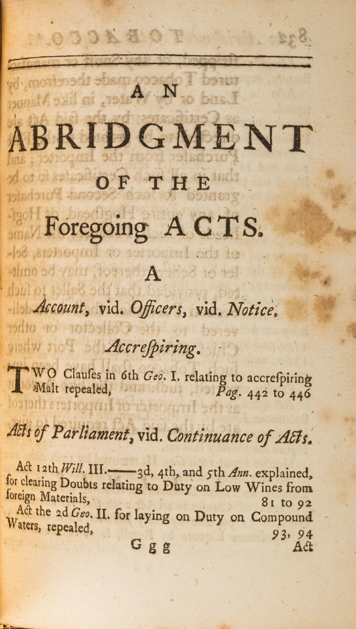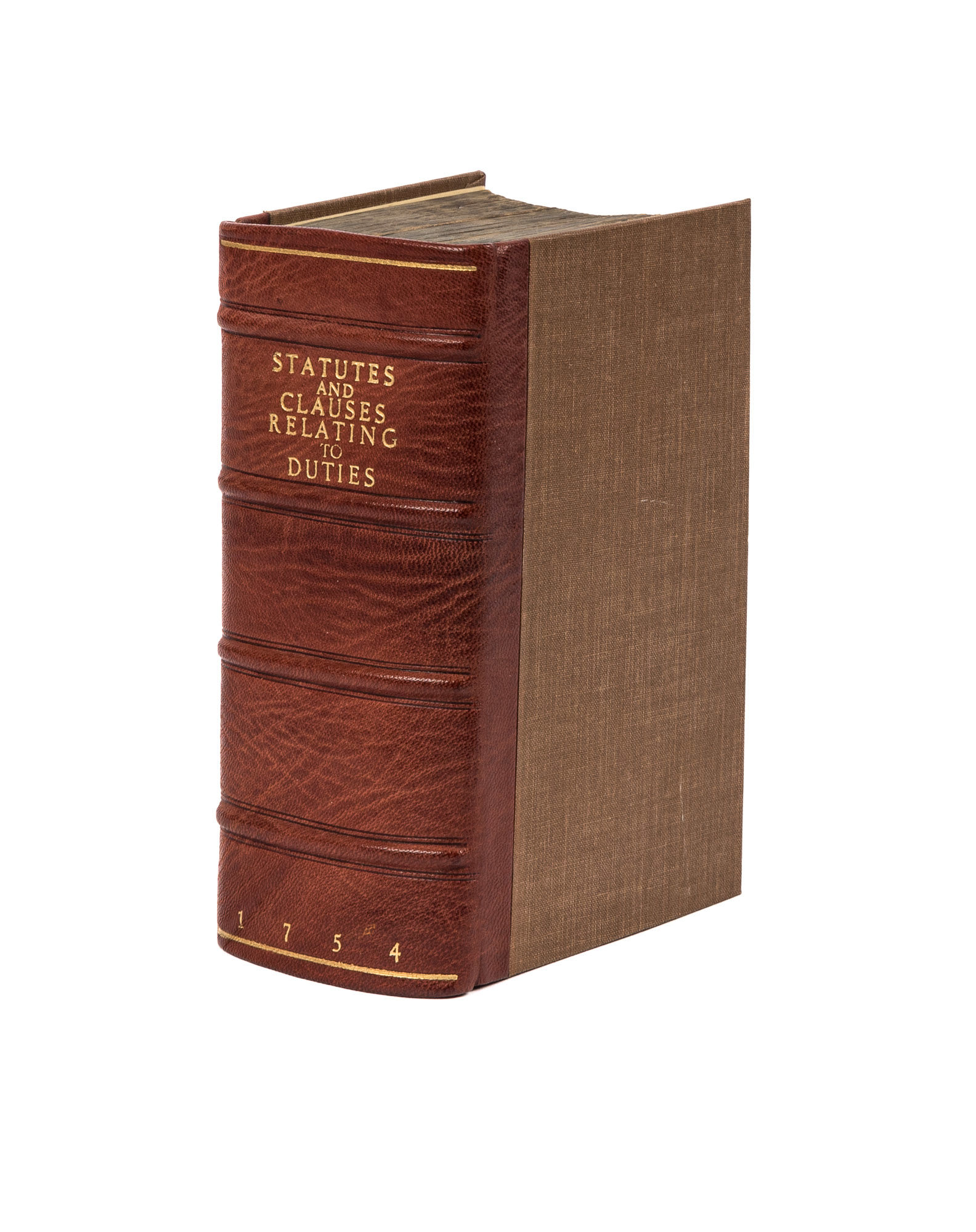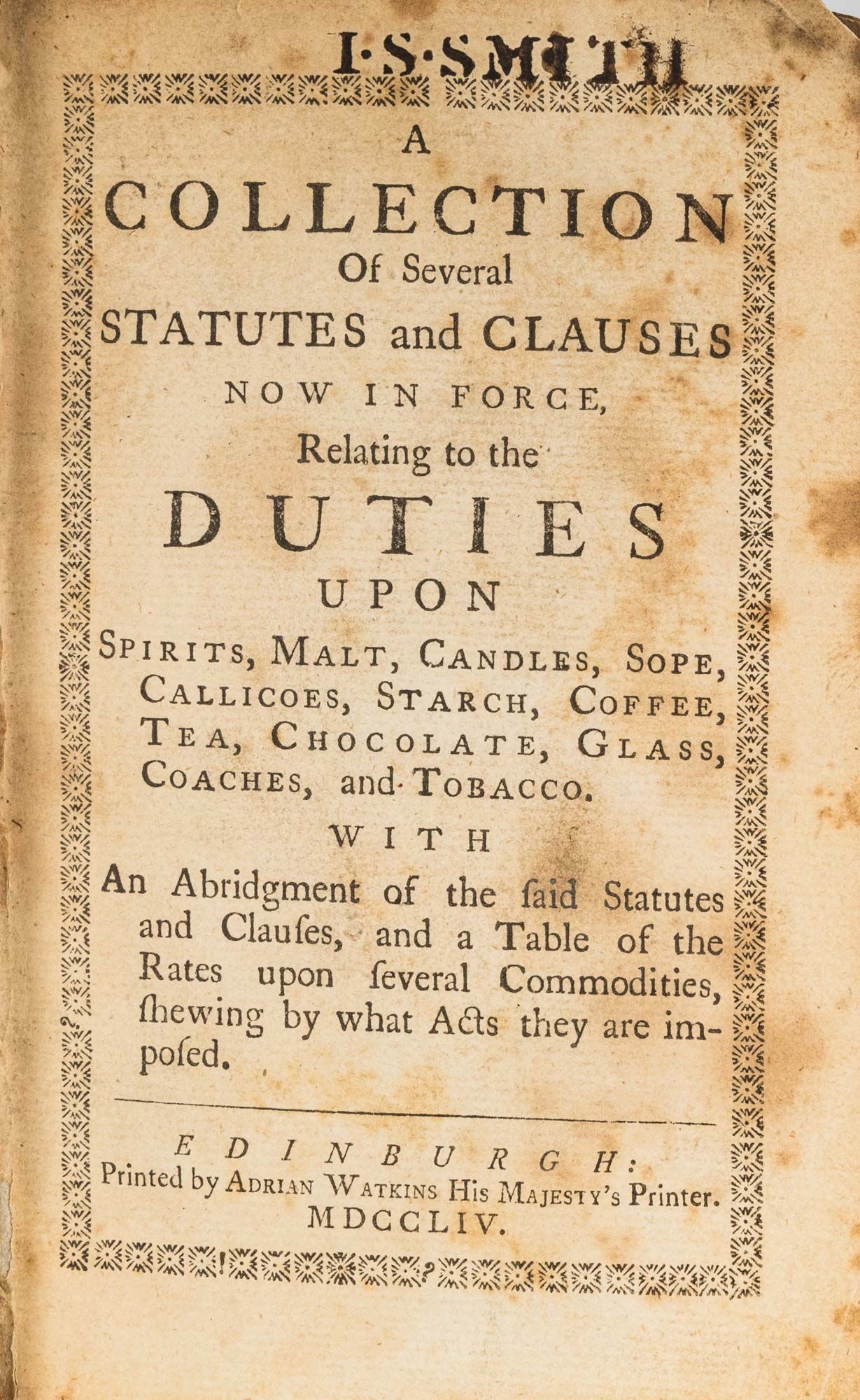 1754. Edinburgh: Printed by Adrian Watkins, 1754. Rare.. Edinburgh: Printed by Adrian Watkins, 1754. Rare. Consumer Taxation in Eighteenth-Century Great Britain [Great Britain]. A Collection of Several Statutes and Clauses Now in Force, Relating to the Duties upon Spirits, Malt, Candles, Sope, Callicoes, Starch, Coffee, Tea, Chocolate, Glass, Coaches, And Tobacco. With an Abridgment of the Said Statutes and Clauses, And a Table of the Rate upon Several Commodities, Shewing by what Acts They are Imposed. Edinburgh: Printed by Adrian Watkins, His Majesty's Printer, 1754. 832; 155, [13] pp. Two parts, the second with the drop-head title An Abridgment of the Foregoing Acts. Octavo (6" x 4"). Recent period-style quarter morocco over cloth, raised bands, gilt title and blind and gilt fillets to spine, gilt publication date to foot of spine, endpapers renewed, recent owner bookplate (King Lawrence Parker) to front pastedown. Moderate toning and light foxing to interior, later owner stamp (I.S. Smith) to head of title page. $600. * Only edition. Enhanced by an abridgment and an index, this digest collects the wide array of laws used to raise revenue through the taxation of popular consumer goods. The introduction of similar laws in the North American colonies, such as a tax on tea, helped to initiate the American Revolution. The collation of the Abridgement section of our copy differs from the ESTC record. Ours has 155 pages instead of 115. This is a rare title; OCLC and the ESTC locate 1 copy (National Library of Scotland). Its collation is identical to ours. English Short-Title Catalogue (ESTC) T184226.