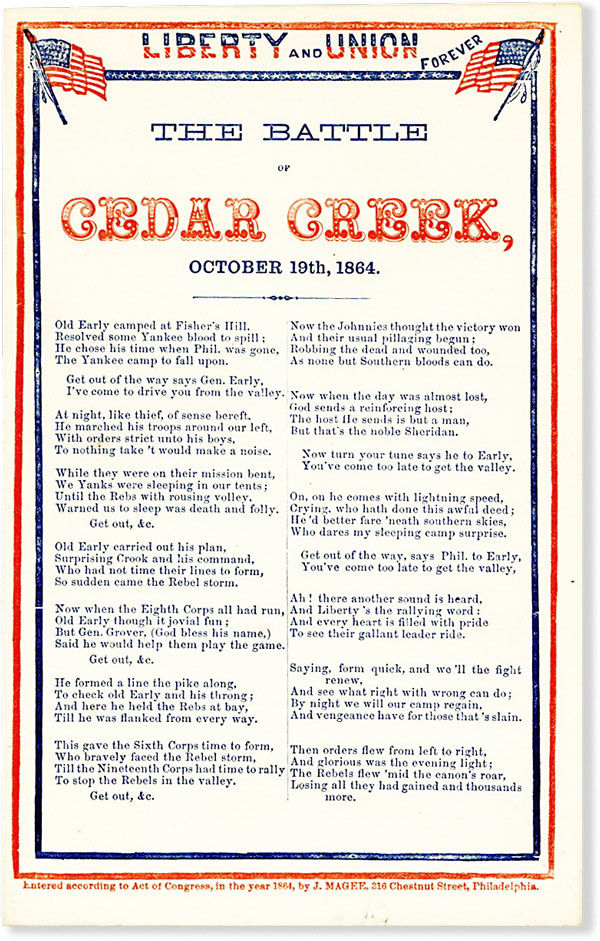 A patriotic song in thirteen stanzas, celebrating Sheridan's victory over Jubal Early's Confederate troops at Cedar Creek, in the northern Shenandoah Valley, in late 1864. This was one of the decisive battles of the War, and it is described colorfully here. Though no music is included, the chorus, repeated with variations throughout the song – "Get out of the way, says Phil to Early / You've come too late to get the Valley," etc – suggests it was meant to be sung to the popular minstrel tune "Ole Dan Tucker.