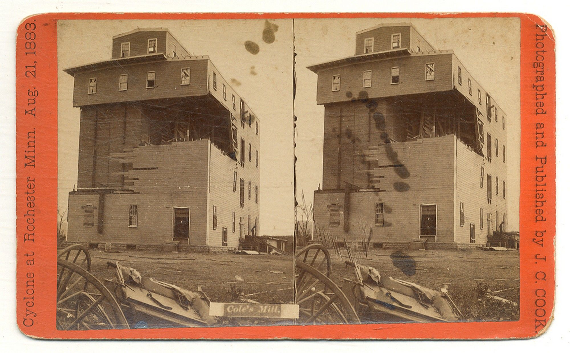J.C. Cook, 1883. Unbound. Very Good. Stereoview photograph. Imperial size, measures 4¼" x 7". Gentle bumping and some rubbing along the edges, spotting on the photos, modest soiling on the verso, very good. Verso with a neat ink inscription reading: "Mr. Cole was found several roads north east of here." Image shows the tornado damage done to Cole's Mill, Rochester, Minnesota, August 21, 1883.