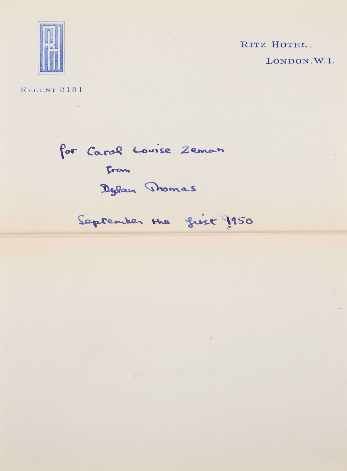 New York: New Directions, 1946. First edition, second issue with redesigned title page and later New Directions address, "333 Sixth Ave." on copyright page. Frontispiece portrait of Thomas by Augustus John opposite p. ix. xxiii, 183 pp. 1 vols. 8vo. Red cloth, gilt titles blocked in black on spine. Near fine in very good original unclipped dust jacket (spine sunned, small loss at head). First edition, second issue with redesigned title page and later New Directions address, "333 Sixth Ave." on copyright page. Frontispiece portrait of Thomas by Augustus John opposite p. ix. xxiii, 183 pp. 1 vols. 8vo. A.N.s. of Dylan Thomas, a presentation to Carol Louise Zeman dated September 1st, 1950, laid in. The note is on stationery of the Ritz Hotel, where Marguerite and Louis Cohn usually stayed when they were in London. They were proprietors of House of Books, early specialist dealers in modern literature and publishers of a series of signed books. Their acquaintances included T.S. Eliot, Marianne Moore, and Robert Frost among numerous others. Carol Zeman (later Rothkopf) was Marguerite's niece. Rolph B11. Provenance: Margie Cohn; Carol Z. Rothkopf
