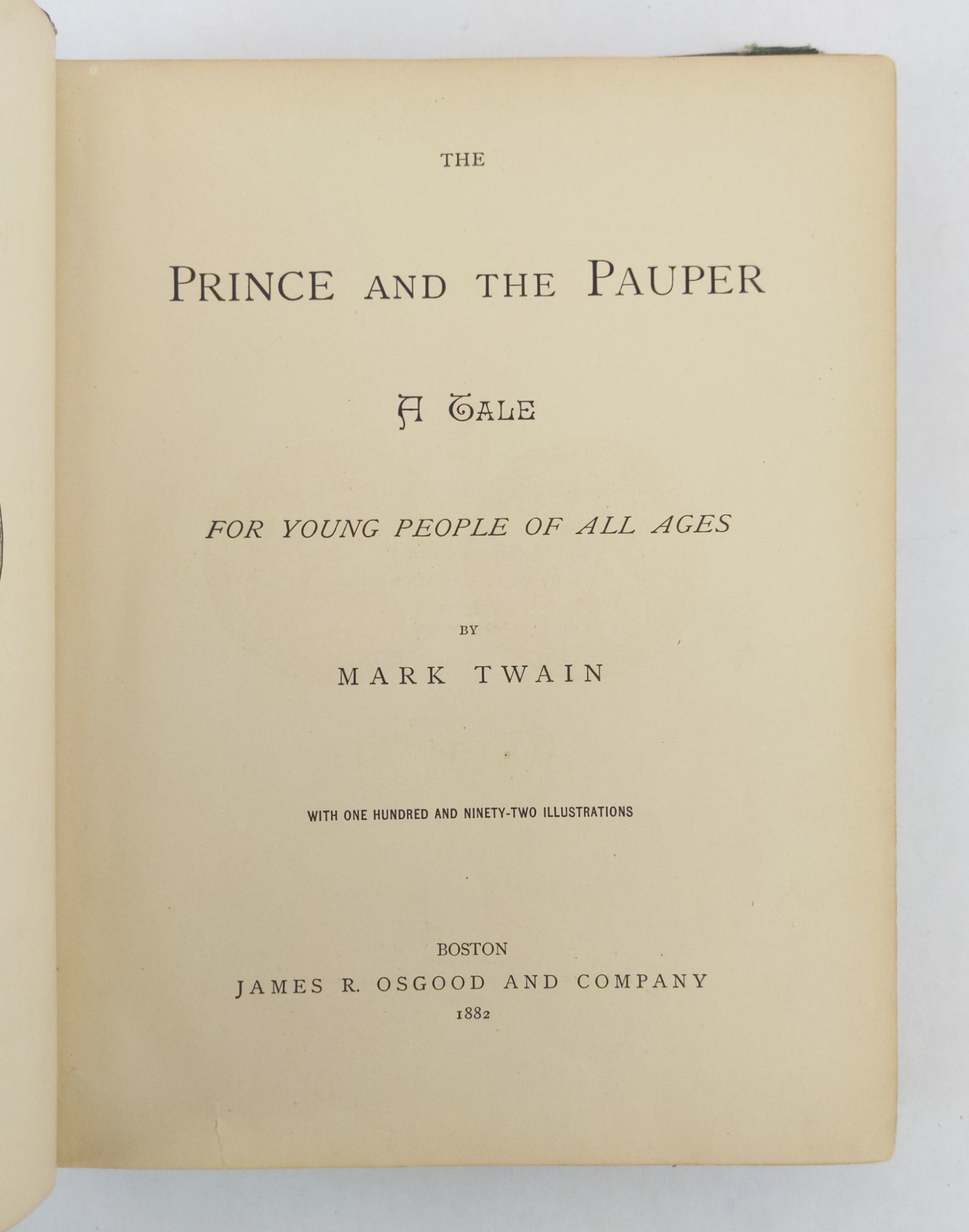 Boston: James R. Osgood, 1882. First American Edition, First Printing, First State, Second State Binding. Hardcover. Octavo, [1]-411 pages. In Fair condition. Bound in green cloth with gilt lettering and gilt and blind stamped decoration. Boards have head edge of spine chipped off, tearing and splitting to both joints, glue spot on spine, boards exposed at corners and along edges, and fraying to edges. Binding loose. Text block has light age toning to edges, partial splitting to front interior hinge, writing in pen on second page, pages 115 to 126 mostly detached with splitting to gutters surrounding the section of pages, and heavy splitting to rear interior hinge. First issue with all text points, uncorrected state of the text with "estate" on page 124, "do not" on page 263, and "reigned" on page 362, Franklin Press imprint on the copyright page. Second state of binding, with the center rosette on the back-strip 1/16 inch below the fillet. BAL 3402. [Shelved in Room G]. 1372664. Special Collections.