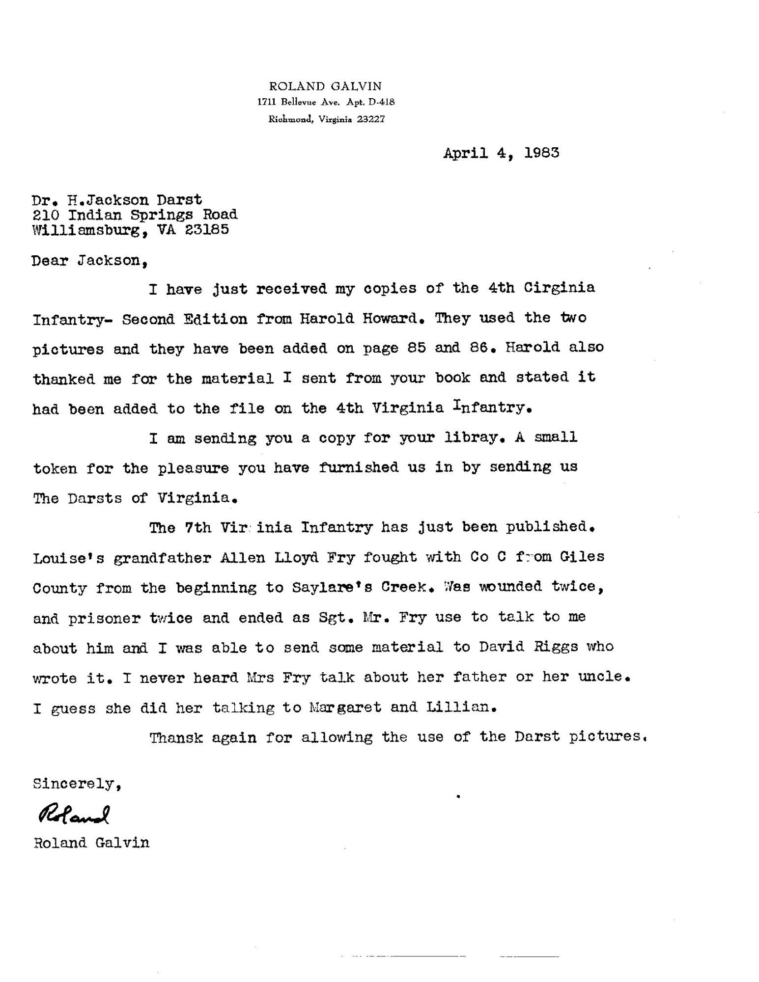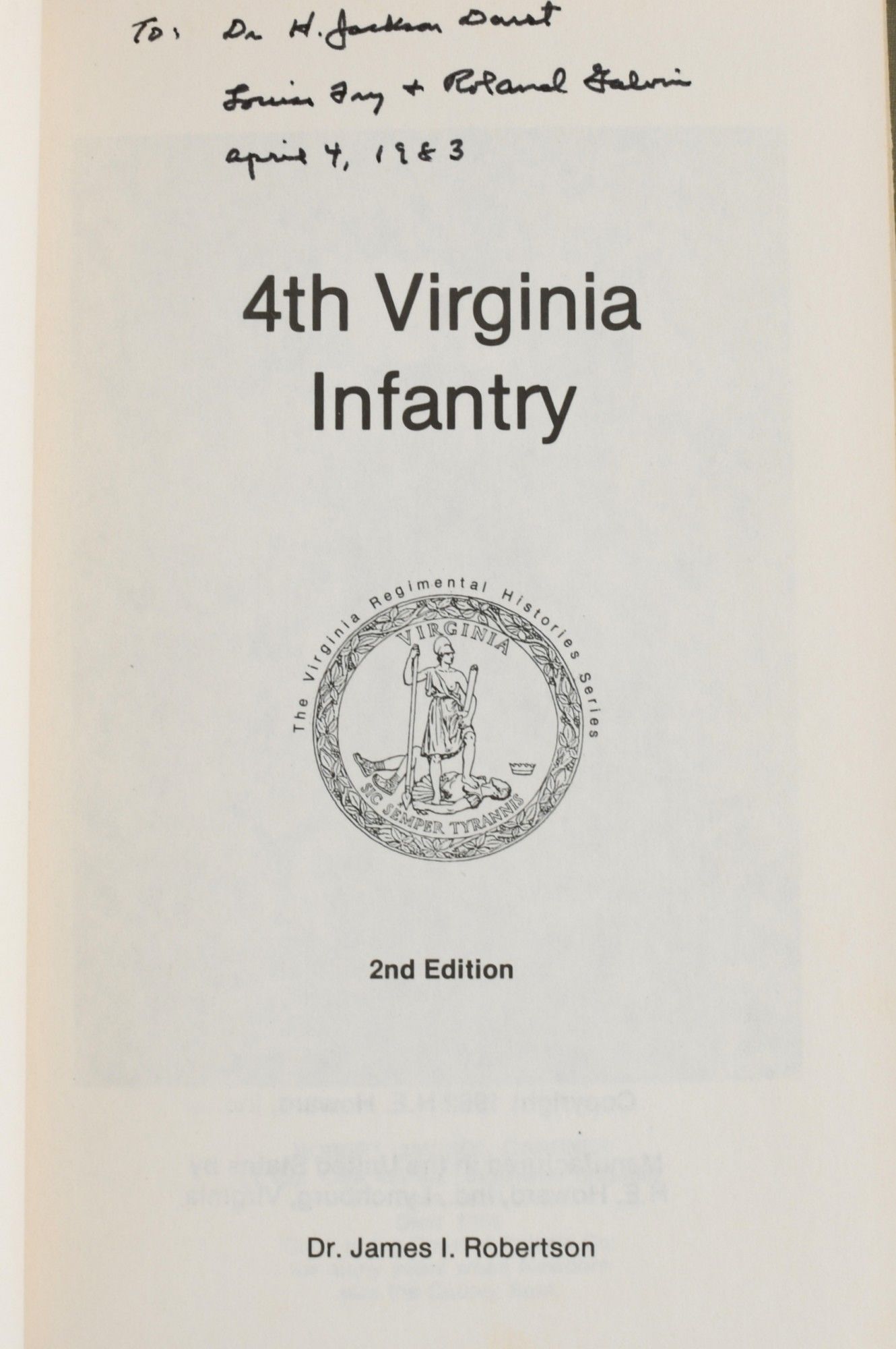 Lynchburg, Virginia: H. E. Howard, Inc, 1982. Second Edition. Hard Cover. Fine binding. 8vo.; in the publisher's gray cloth binding, with decoration and titling in gilt; [iii]; 87 pages (the last three with photographic portraits); this copy with a non-authorial inscription on the title page, and a typed letter laid in.~~The letter is of interest. It is addressed to Jackson Darst of Williamsburg and is from Roland Galvin, a longtime member of the Richmond Civil War Roundtable. Mr. Darst apparently provided images of William Benjamin Darst with John Welch Darst in a double daguerreotype, and a single image John Benjamin Darst. The three Darsts served in the 4th Virginia Infantry. The images are included in this edition, at the back of the book. Fine binding.