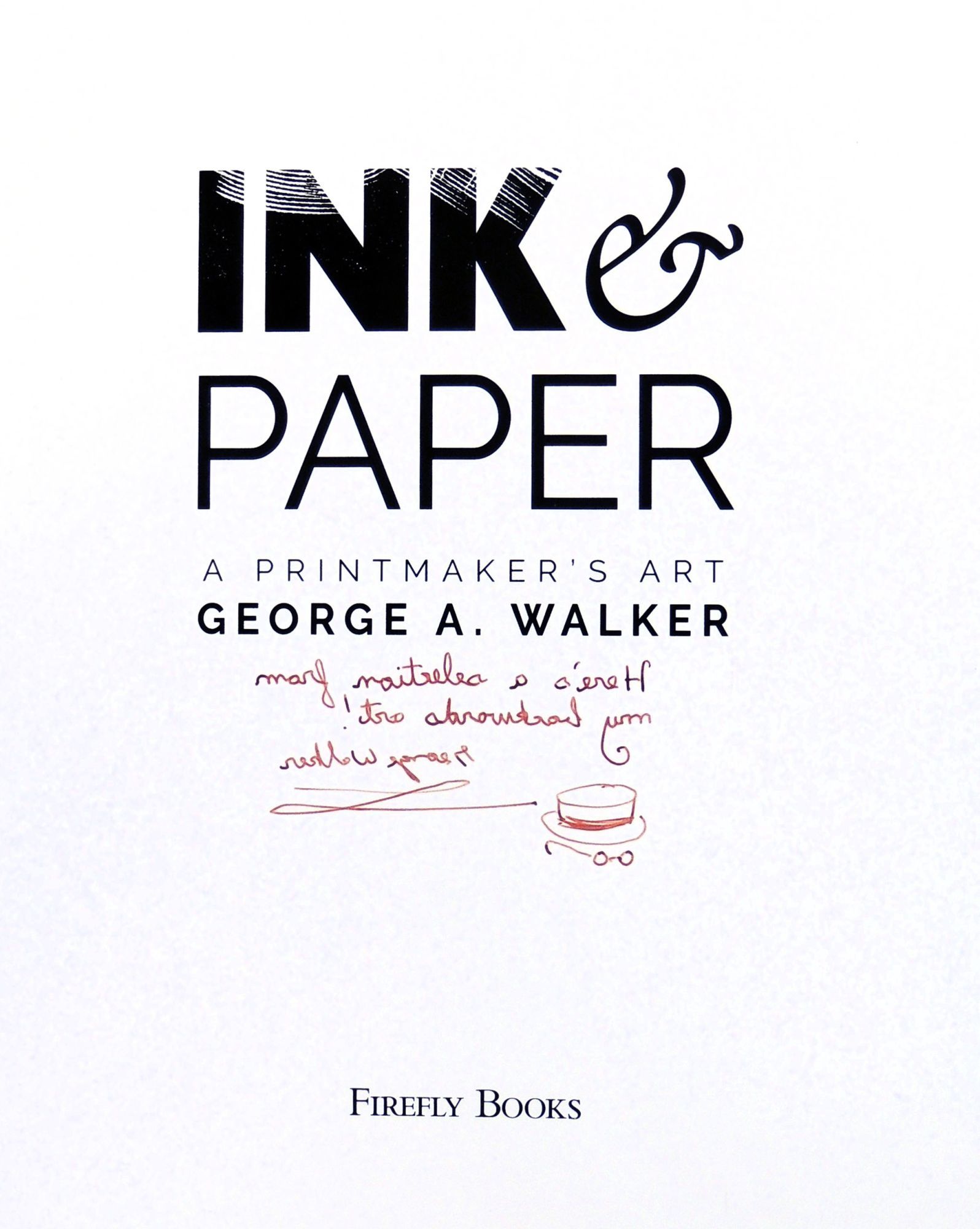 Toronto: Firefly Books, 2023. Hardcover. Fine. Hardcover. Quarto. Signed in brown ink to title page with small illustration and an inscription in mirror image by George. A wonderful tribute to the art of George Walker. "Ink and paper are my muses. Using hand press printing and printers' ink to create original prints has absorbed me for at least the last 47 years. I love teh qualities of all papers, especially the luxury of fine rag papers and washi papers. Their tactile and soft surfaces beg to receive ink adn I am always too happy to oblige them," George Walker (rear cover). Bound in green cloth boards with white title to spine and front board. Black and white illustration of a tree pasted down to front cover. Includes an introduction, a section with full page black and white reproductions of George's prints, a section on his books, broadsides, and etchings with full color photographic illustrations, an afterword, comments by the artist, and a bibliography. Clean and bright. 213 pages. PRI/100623.