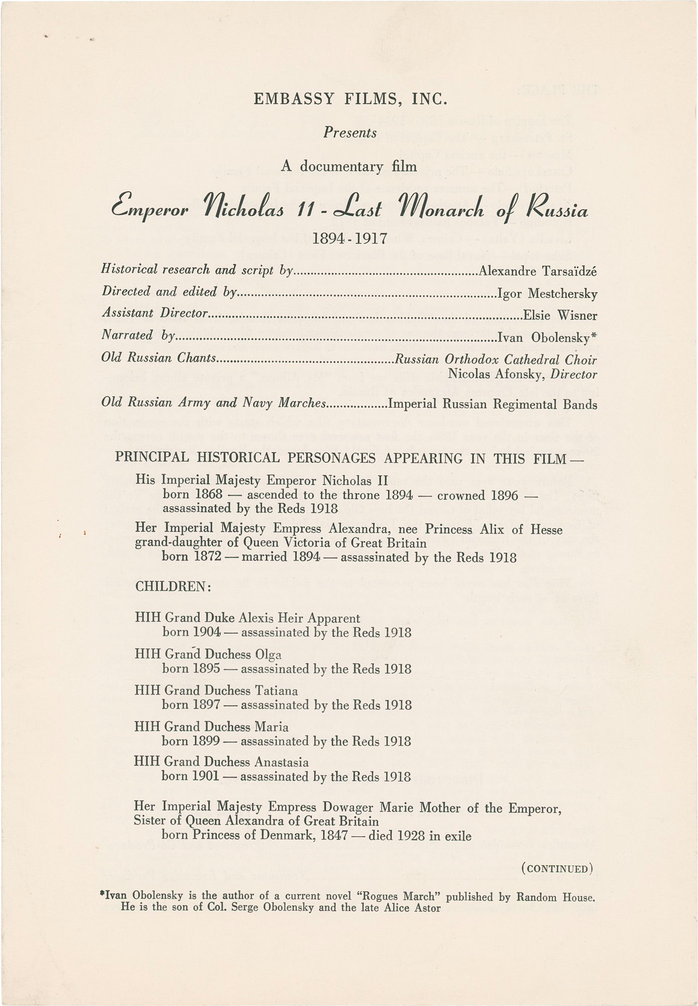 Emperor Nicholas II: Last Monarch of Russia 1894-1917 (Original program for two 1964 screenings of the 1954 film at the Crystal Ballroom at the Delmonico Hotel)