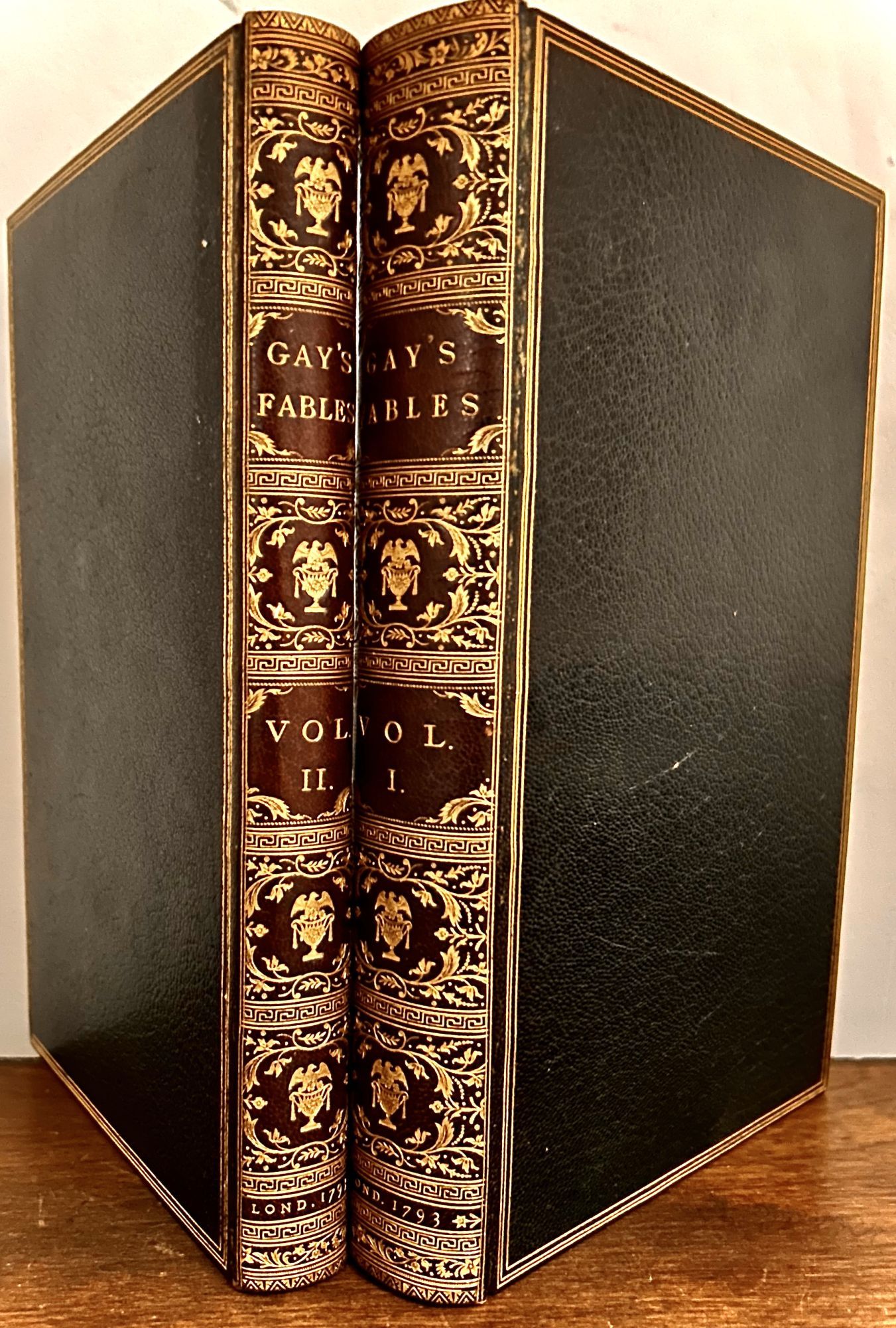 London: John Stockdale, 1793. First edition. leather_bound. Full green levant, spines evenly faded to brown. Aeg. Fine. Blake, William. 225, 187. 27 x 17 cm. First Stockdale edition, first issue (with long "s" throughout). Frontispiece memorial illustration, engraved title pages in both volumes, and 68 engraved plates, including 12 by William Blake. Published posthumously with a life of the author at the end of volume 2. List of Subscribers also end of Vol.2; with verso of last leaf a publisher advert. With the "Gay Monument" plate at rear of second volume. BENTLEY 460. GORDON RAY. "Blake's twelve engravings follow designs in earlier editions of the 'Fables,' but hey are freely adapted." KEYNES 106. Wide text margins, plates with tissue guards, marbled endpapers, inner dentelles, backstrip lettered and decorated with gilt motifs. Bound by Lloyd, Wallis & Lloyd Bentley of London.
