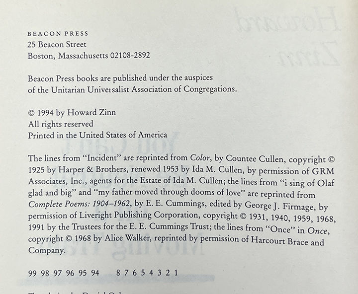 Boston: Beacon Press, 1994. First Edition. Hardcover. Fine/Near Fine. Fine in a Near Fine jacket, unclipped ($22.00), bumped and with a closed tear at the top edge, some creases at the flaps. Black cloth, pushed at the head and foot of the spine, pink ink lettering on the spine. Square and firmly bound, clean internally. Zinn's memoir about his previous thirty years, from teaching at Spelman to his work as a social activist.