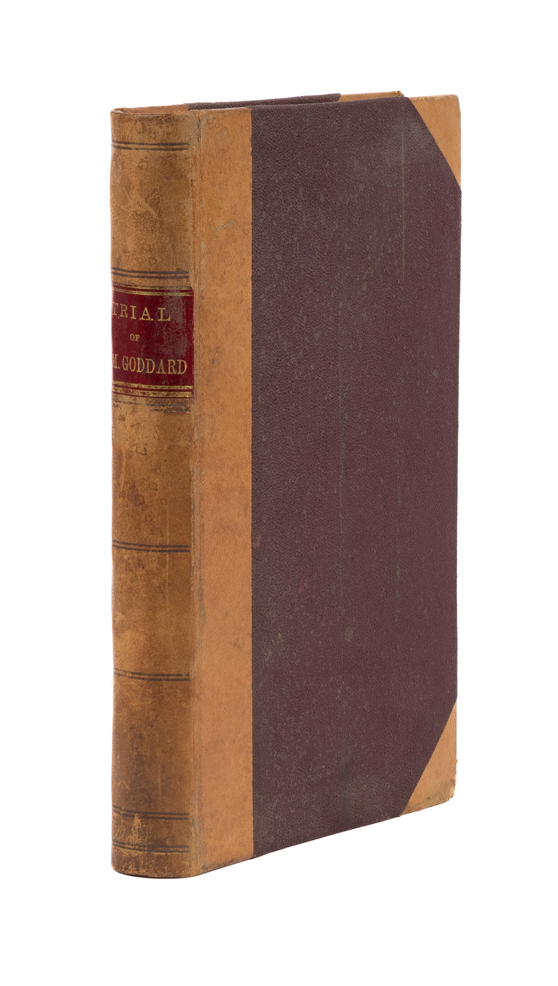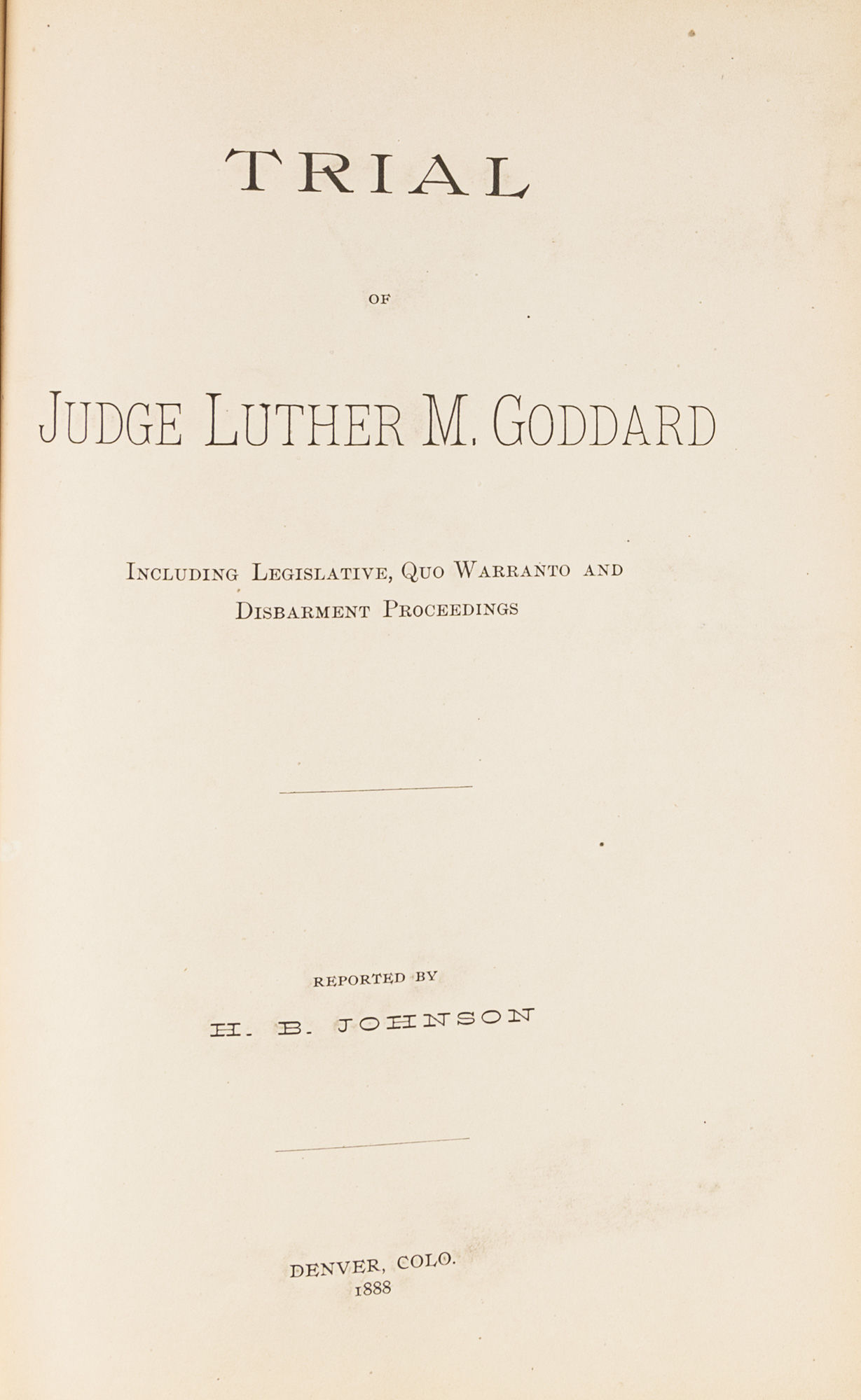 1888. Dener, 1888. Scarce. 1st and only edition.. Dener, 1888. Scarce. 1st and only edition. Did the Judge Promise an Appointment in Exchange for a Donation? [Trial]. Goddard, Luther M. [1840-1917], Defendant. Johnson, H.B., Reporter. Trial of Judge Luther M. Goddard: Including Legislative, Quo Warranto and Disbarment Proceedings. Denver: S.n., 1888. 470 pp. Octavo (9" x 6"). Contemporary three-quarter law calf, lettering piece and blind fillets to spine. Light rubbing to extremities, faint spotting to boards, corners bumped and lightly rubbed, front hinge just starting at ends, early owner signature in pencil (S.T. Horn) to front free endpaper. Light toning to interior, faint crinkling from moisture to foot of text block. $750. * Only edition. At the time of this trial, Goddard, later an associate justice of the Colorado Supreme Court, was an elected judge of the 5th Judicial District. Goddard's trial was the result of an accusation that he promised to appoint a donor court clerk if elected in exchange for a campaign contribution. Goddard was acquitted. This is a scarce title. OCLC locates 9 copies, 6 in law libraries (Brigham Young, Colorado Supreme Court, LA County, University of Colorado, University of Denver, University of South Dakota). Not in the Harvard Law Catalogue (1909).