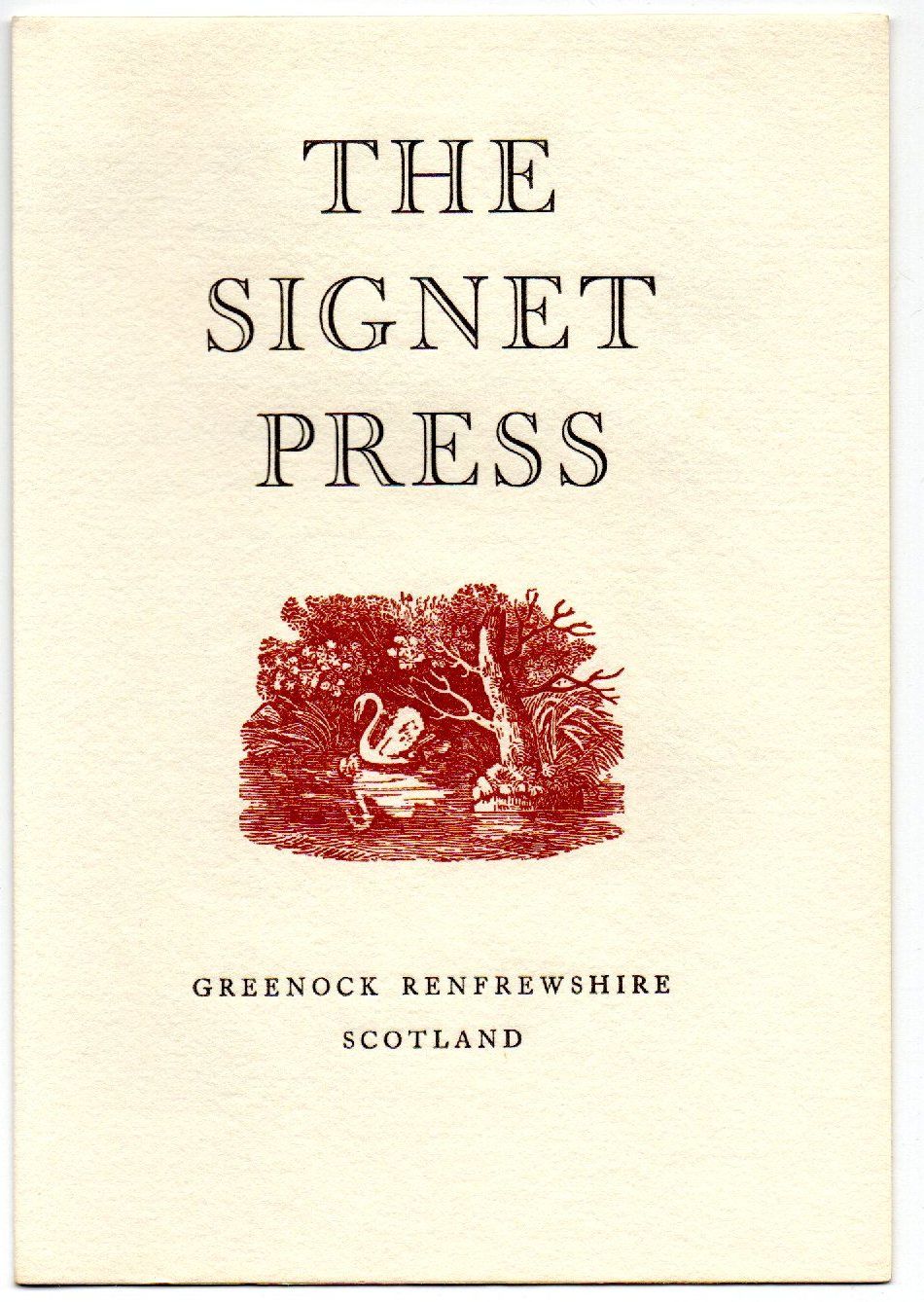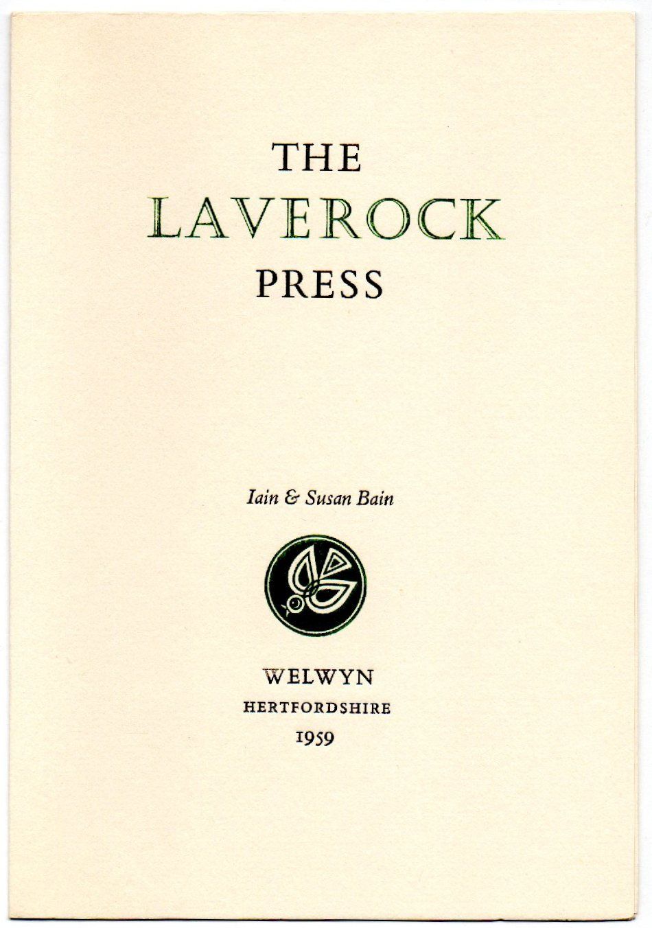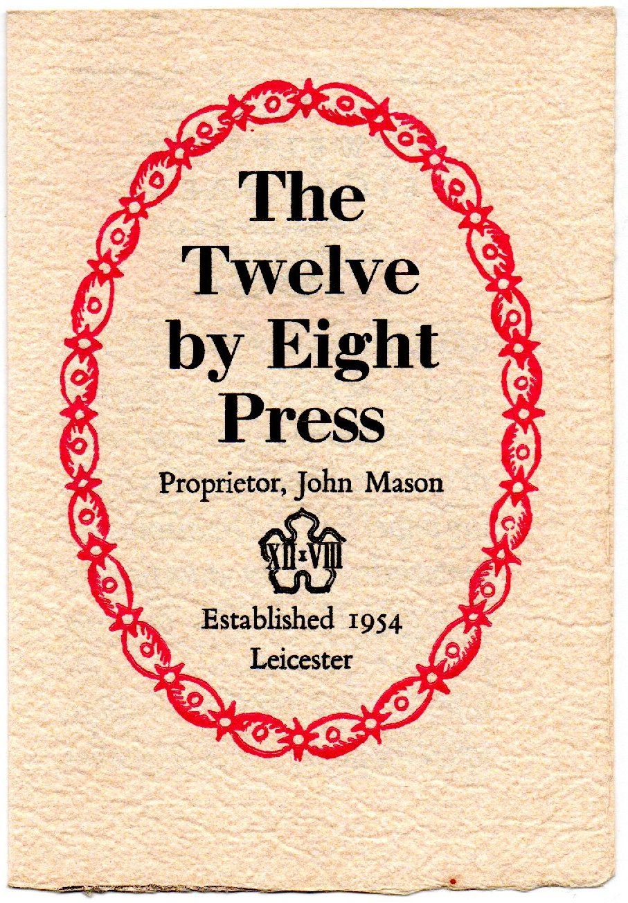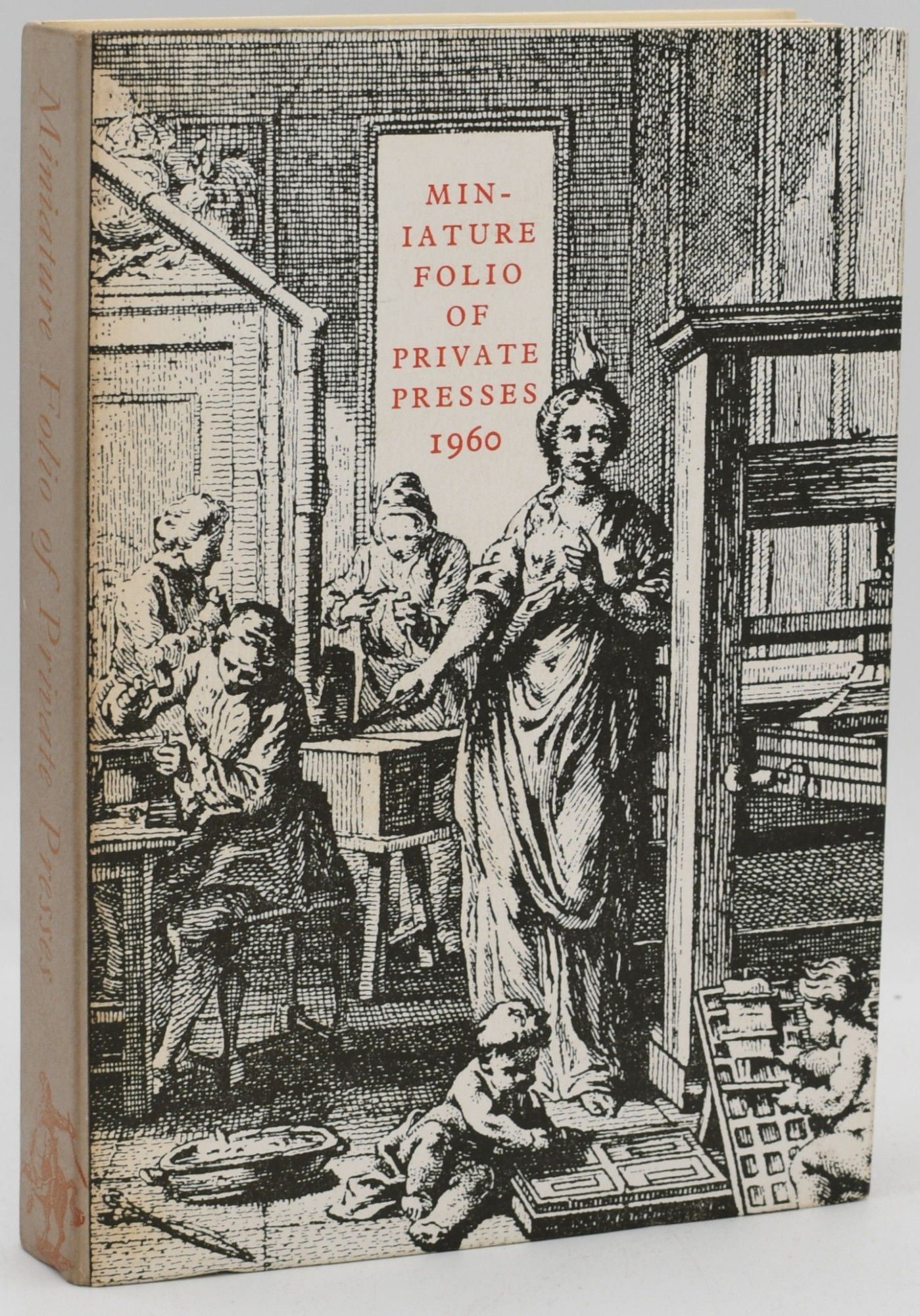 [London]: [Bodley Head], 1960. Hard Cover. Near Fine binding. 8vo; a gathering of 28 of samples from various private presses; from this list: Ashantilly, Barber Hill, Canterbury College of Art, Cuckoo Hill, Creekside, Damasine, Karuba, Kit-Cat Press, Laverock, Lincoln School of Art, Lion & Unicorn, Maidstone College of Art, Mermaid, Merrion, Miniature, Melchior W Mittl, Officina Bodoni, Ogham, F E Pardoe, Prinny, Privateer, Shoestring, Signet, Smout, Tuinwijkpress, Twelve by Eight and Adrian Wilson.~The contributions are in chemise with printed paper over boards; the whole housed in a paste-paper slipcase.~~With prospectus and two pieces of correspondence -- one als and one tls -- from John Ryder, art director of The Bodley Head and book designer. The notes are on Bodley Head letterhead and are addressed to "Fridolf" .~~. Near Fine binding.