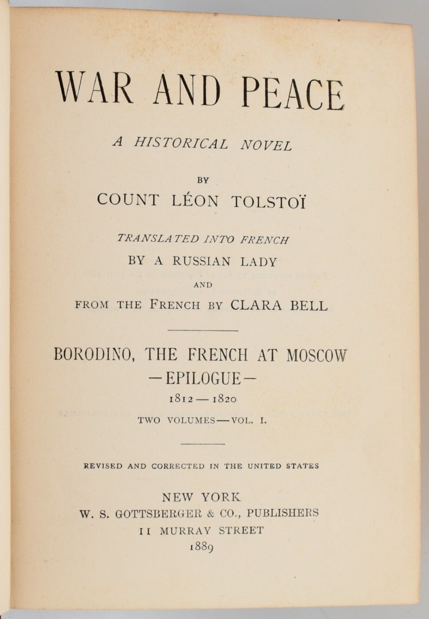 New York: W. S. Gottsberger & Co., Publishers, 1889. Early Printing. Very Good binding. Six octavo volumes; in brown cloth, decorated and letters in black and gilt; all early printings of the English language edition; with a bit of rubbing to the spines ends.~~The set with two bookplates in each volume, each with an interesting connection to The University of Virginia.~~One of the monumental works of Russian literature. The first English language edition was published by Gottsburger in 1886. Very Good binding.