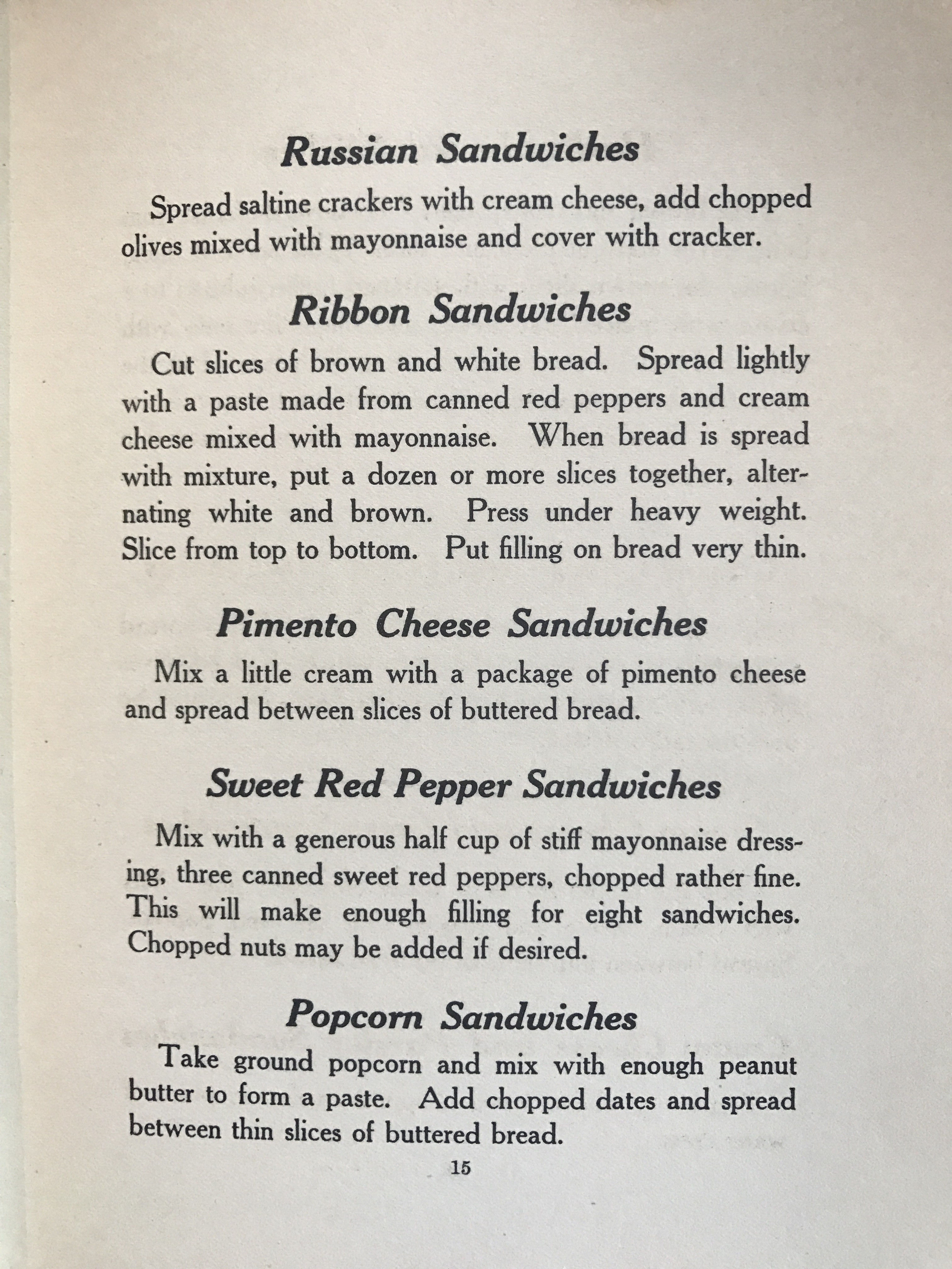 Rochester, NY, 1913. Hardcover. Brown illustrated boards. Good. 44 pages, 12 blank for recipes. 19x 15 cm. A charming cookbook including recipes for popcorn sandwiches, bacon sandwiches, and everyone's all time favorite, anchovy sandwiches (saltines, anchovy paste, and cayenne pepper). Covers rubbed, interior clean. [BROWN 2250]