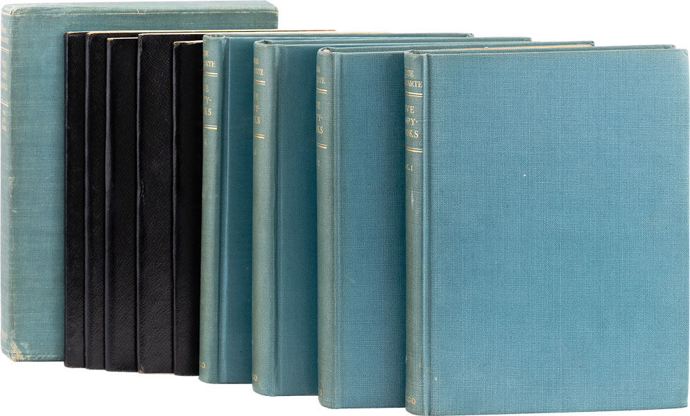 London: Imago, (1950). First, Limited Edition. 4 octavo volumes, plus the later issued facsimile collection of the original copy books from Marie's childhood, in their gilt titled slipcase. 22cm x 17.5cm. Original green blue buckram with gilt spine titles; 284+396+416+329pp; illustrations & facsimiles (some folding). Number 47 of a limitation of 1030. A near fine set, clean, bright, and extremely handsome. Internally clean.