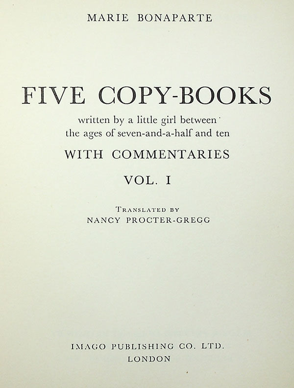 A classic of juvenile psychology by Princess Marie Bonaparte (1882-1962), the prominent French psychologist, popularizer of psychoanalysis, disciple and patron of Sigmund Freud, amongst a wealth of other things; she negotiated with the Nazis to allow Jews to leave Vienna, and she avidly delved into psychosexuality primarily as a therapeutic measure to deal with her own chequered and erratic sexual history. This collection of "Five Copy Books" includes the facsimiles of her own notebooks as a child, illustrating and attempting to interpret the root causes of the various traumas and neuroses that arose later in her life.