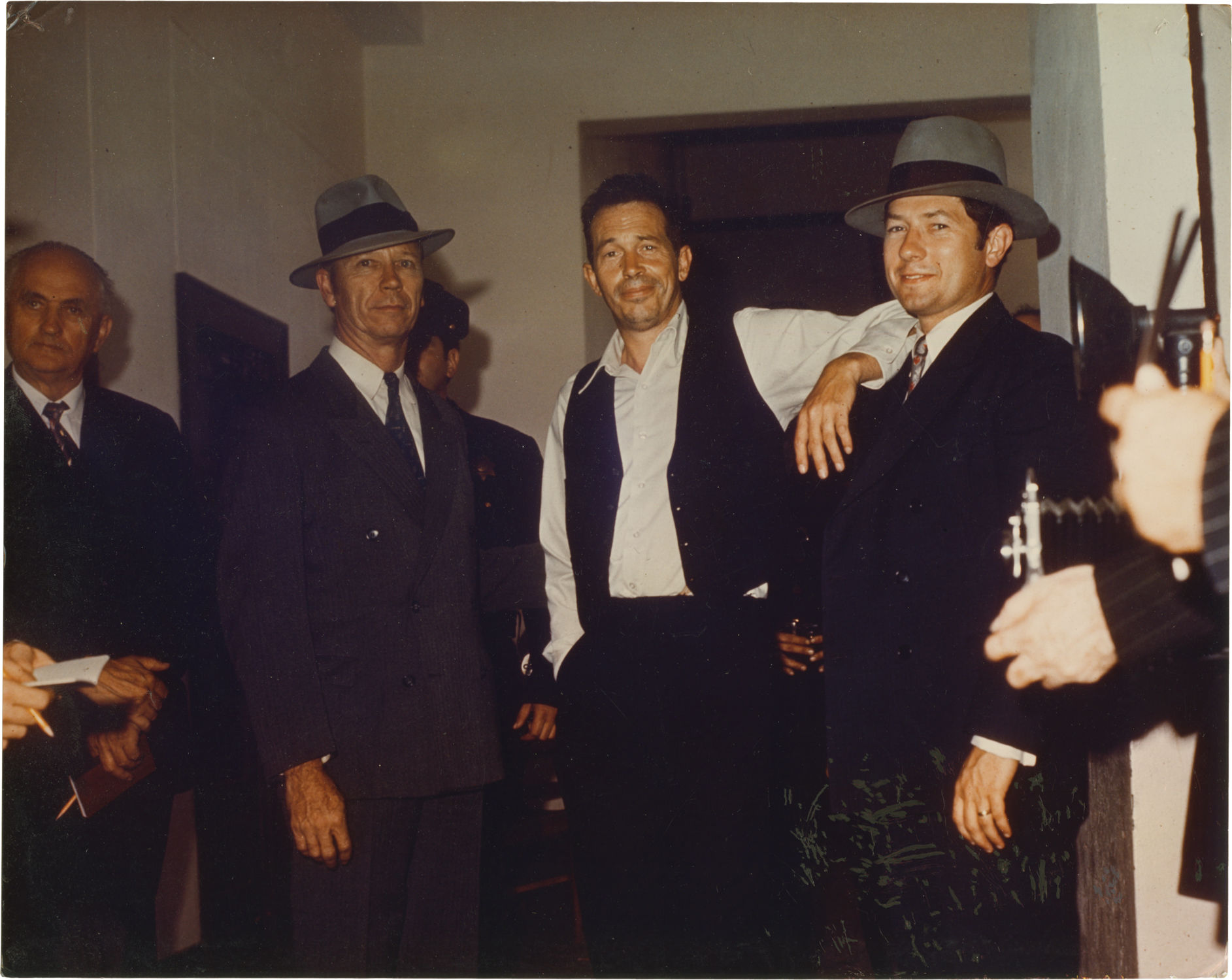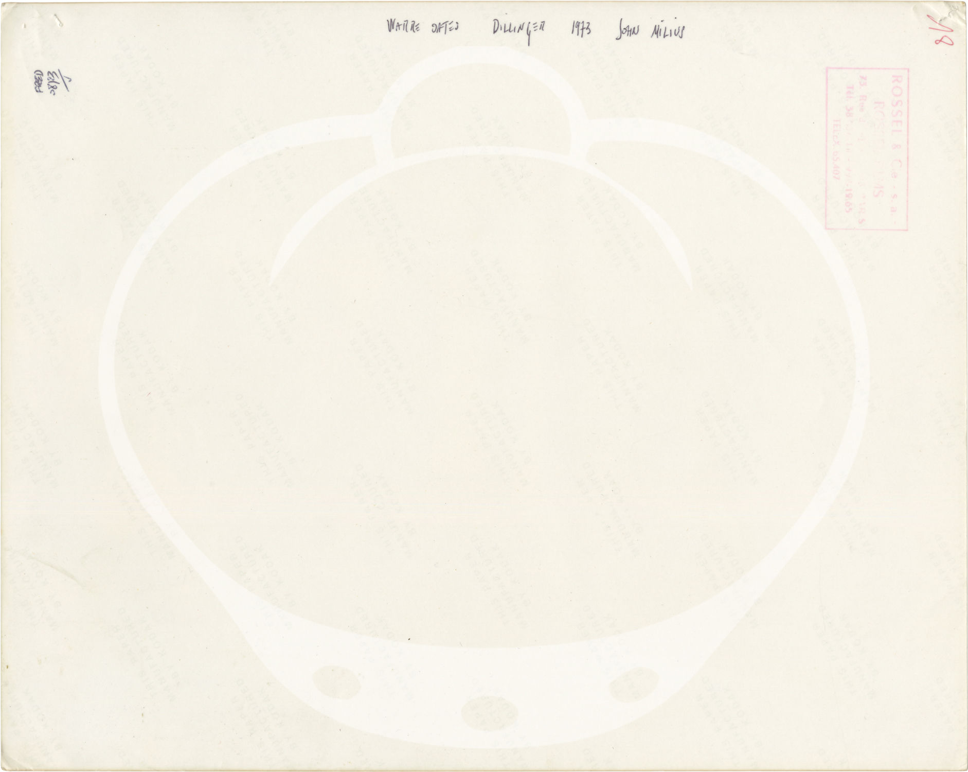 Los Angeles: American International Pictures [AIP], 1973. Vintage oversize borderless color reference photograph from the 1973 film, showing actor Warren Oates and director John Milius between takes. Stamp of Rossel Films on the verso.