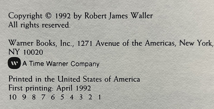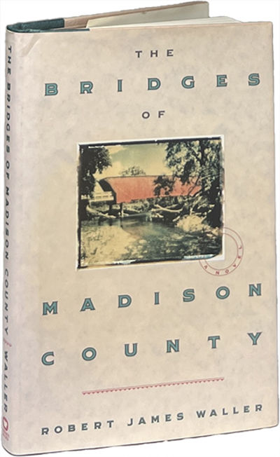 New York: Warner, 1992. First Edition. Hardcover. Near Fine/Near Fine. Near Fine in a Near Fine jacket, unclipped ($14.95), bumped at the head of the spine, a strip of fading down the rear spine fold. Green paper on the spine with light brown paper on the boards. Square and firmly bound, former owner's bookplate on the front endpaper. Waller's classic Midwestern love story between a National Geographic photographer and an Italian bride living in southern Iowa. Famously adapted into the 1995 Clint Eastwood film starring Eastwood and Meryl Streep.