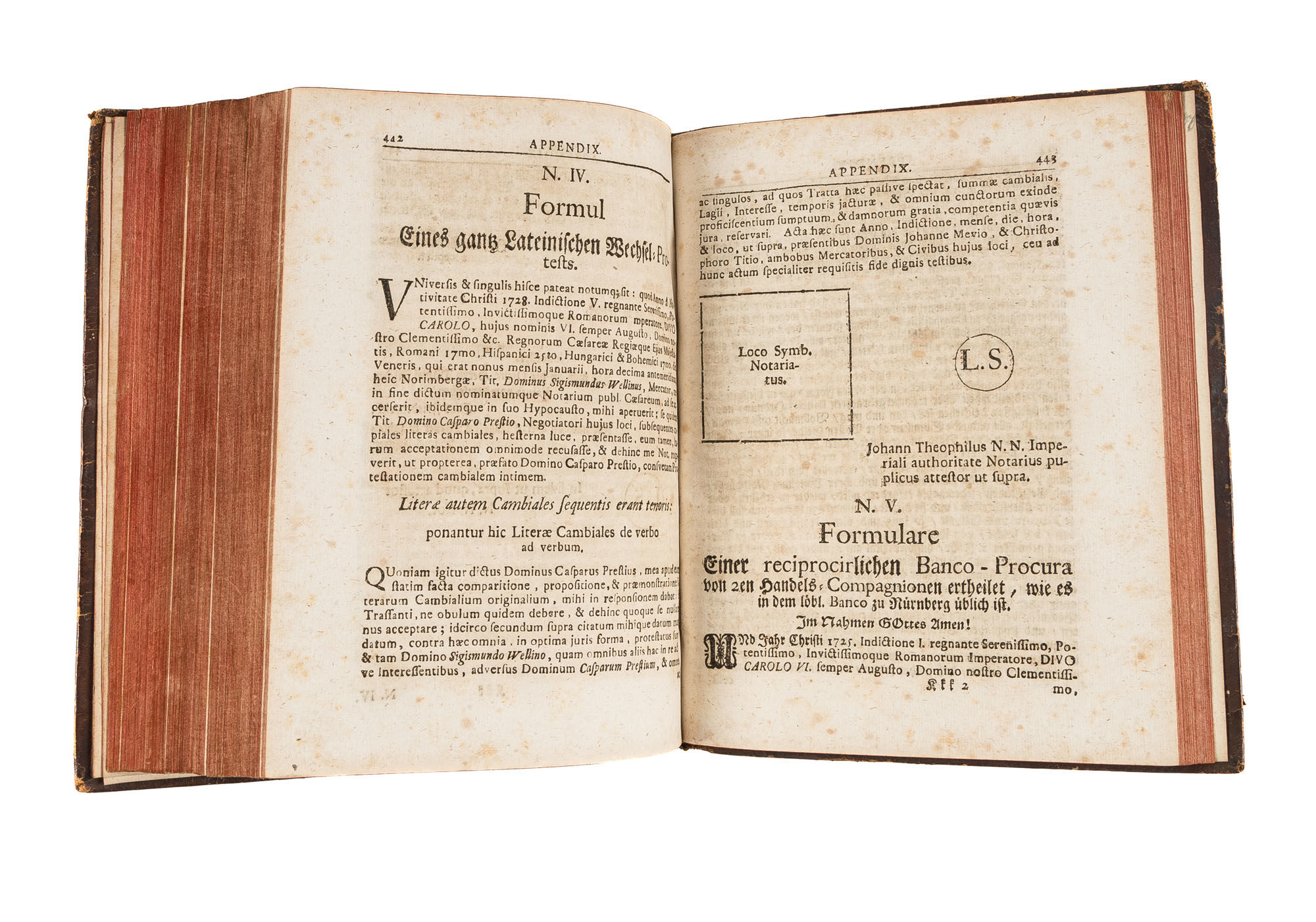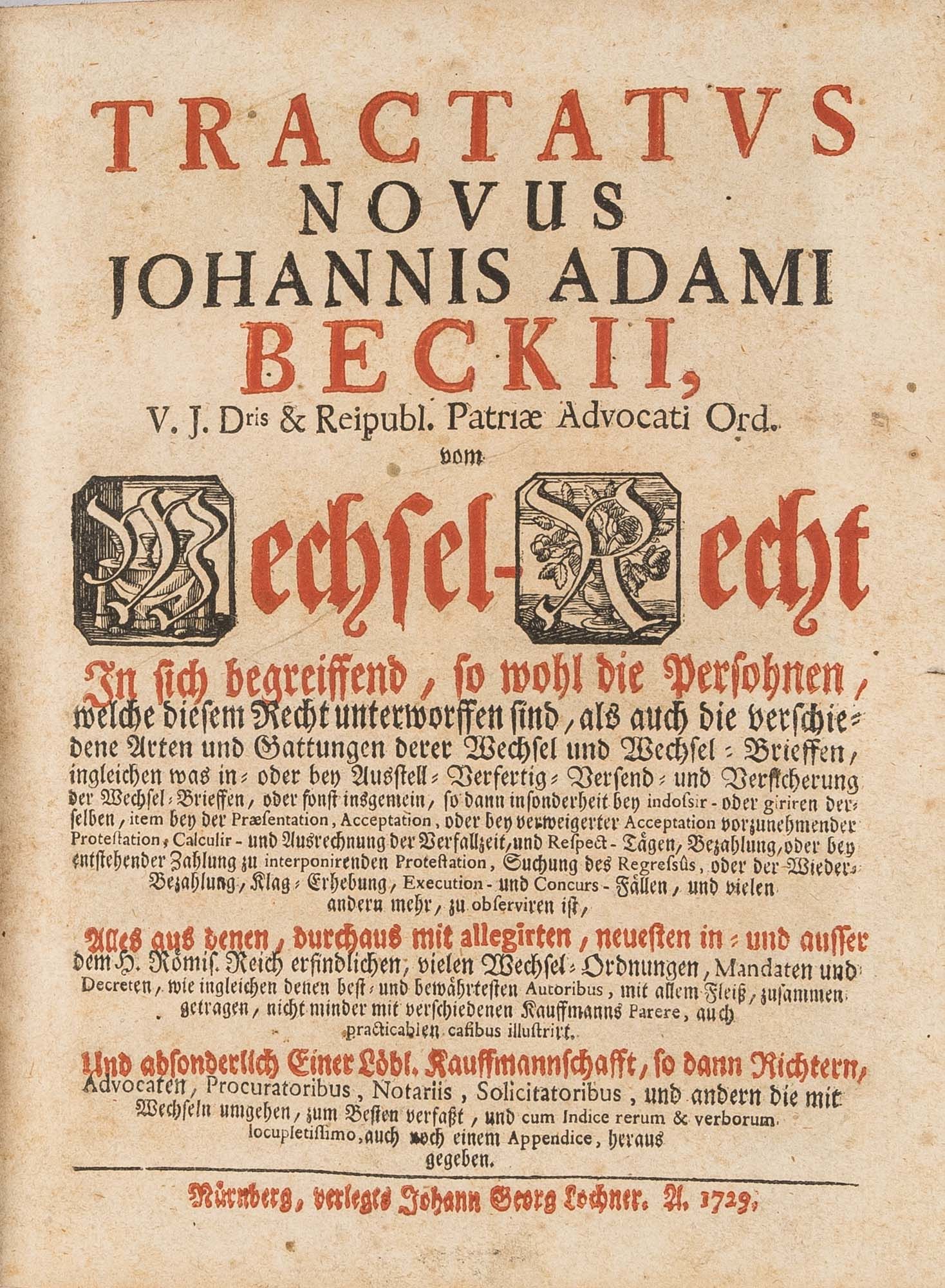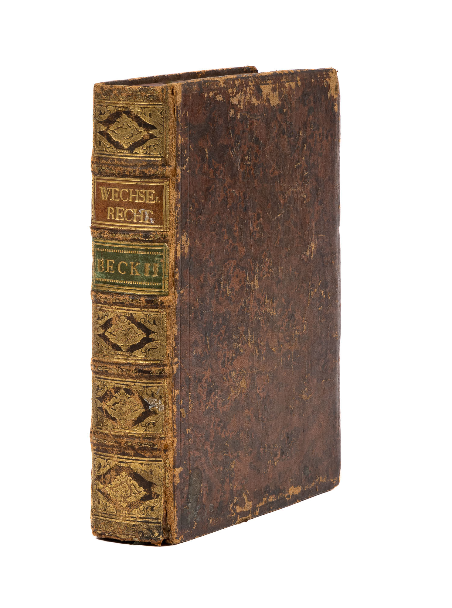 1729. with striking engraved frontispiece. with striking engraved frontispiece. Scarce Treatise on Exchange in the Holy Roman Empire with Striking Engraved Pictorial Frontispiece Beck, Johann Adam [1686-1751]. Tractatus Novus vom Wechsel-Recht: In Sich Begreiffend, So Wohl die Persohnen, Welche Diesem Recht Unterworffen Sind, Als Auch die Verschiedene Arten und Gattungen Derer Wechsel und Wechsel-Brieffen, Ingleichen was in- Order bey Ausstell- Verfertig- Versend- Und Versicherung der Wechsel-Brieffen, Oder Sonst Insgemein [...] Zu Observiren ist, Alles aus Denen, Durchaus mit Allegirten, Neuesten in- Und Ausser dem H. Romis. Reich Erfindlichen, Vielen Wechsel-Ordnungen, Mandaten und Decreten, Wie Ingleichen Denen Best- Und Bewahrtesten Autoribus, Mit Allem Flei , Zusammen Getragen, Nicht Minder mit Verschiedenen Kauffmanns Parere, Auch Practicablen Casibus Illustrirt. Und Absonderlich Einer Lobl. Kauffmannschafft, So Dann Richtern, Advocaten, Procuratoribus, Notariis, Solicitatoribus, Und Andern die mit Wechseln Umgehen, Zum Besten Verfa t, Und cum Indice Rerum & Verborum Locupletissimo, Auch Noch Einem Appendice, Heraus Gegeben. Nuremberg: Verlegis Johann Georg Lochner, 1729. [xii], 512 pp. Title in red and black, copperplate pictorial frontispiece, typographic folding table. Quarto (8" x 6-1/4"). Contemporary mottled calf, blind rules to boards, gilt spine with raised bands and red and green lettering pieces, marbled endpapers, edges rouged, silk ribbon bookmark. Light rubbing and minor scuffing and scratching to boards, moderate rubbing to extremities, somewhat heavier to joints, chipping to spine ends, front joint starting at foot, corners bumped and lightly worn, front hinge starting, rear hinge cracked, later bookplate (of Otto Zeilinger) to front pastedown. Woodcut head and tail-pieces. Moderate toning to interior, occasional light foxing. $1,500. * First edition. This treatise discusses the law of exchange in the Holy Roman Empire with attention to bills of exchange, promissory notes and foreign exchange. The frontispiece shows the busy work taking place in a Baroque exchange office with wooden paneling, cornice statutes and pictures as well as the figure of Mercury, famously the Roman god of trade and patron saint of merchants, with a caduceus, winged shoes and winged helmet. Apparently a well-received work, a second edition was published in 1751. OCLC locates 5 cop.
