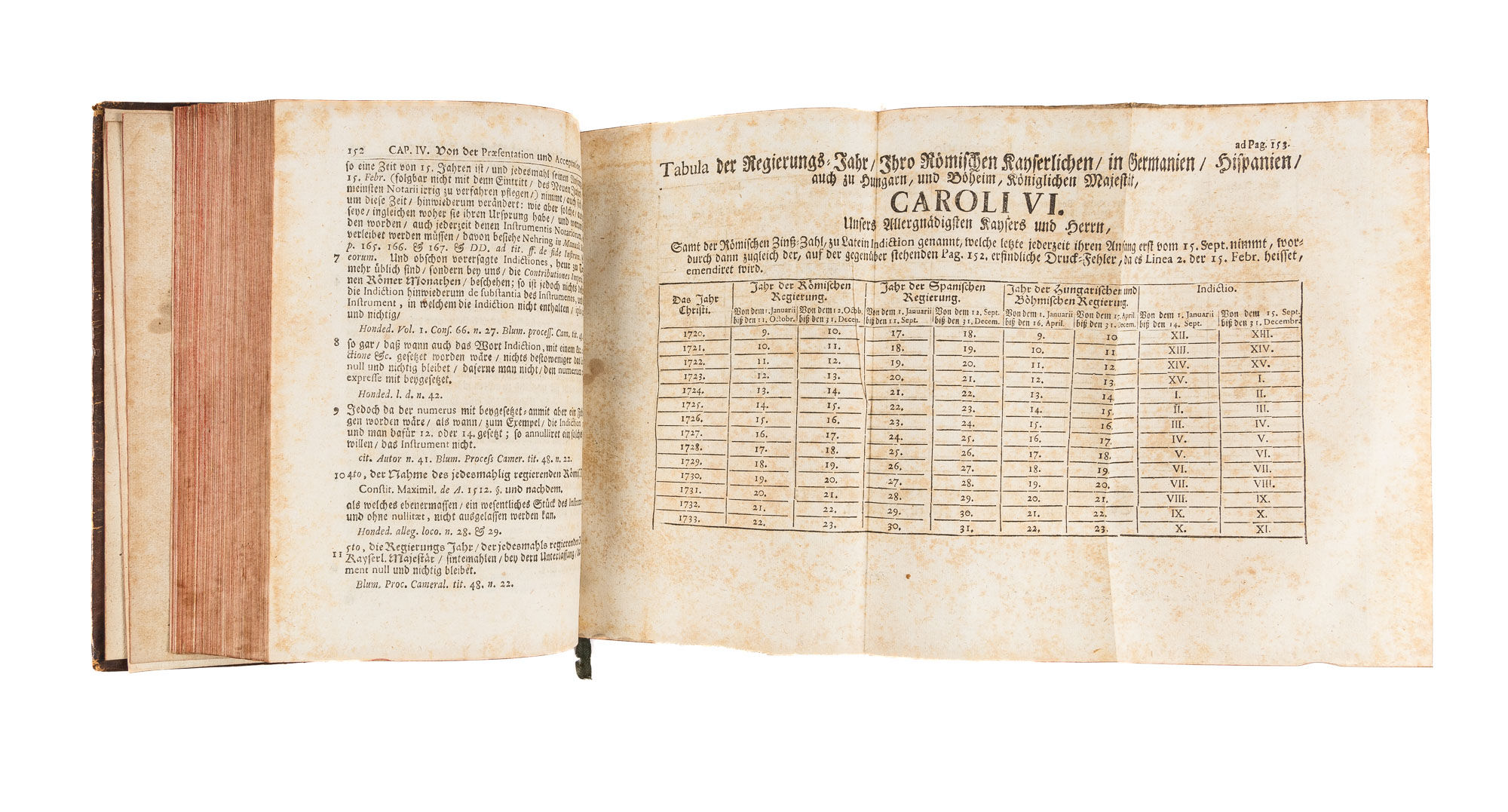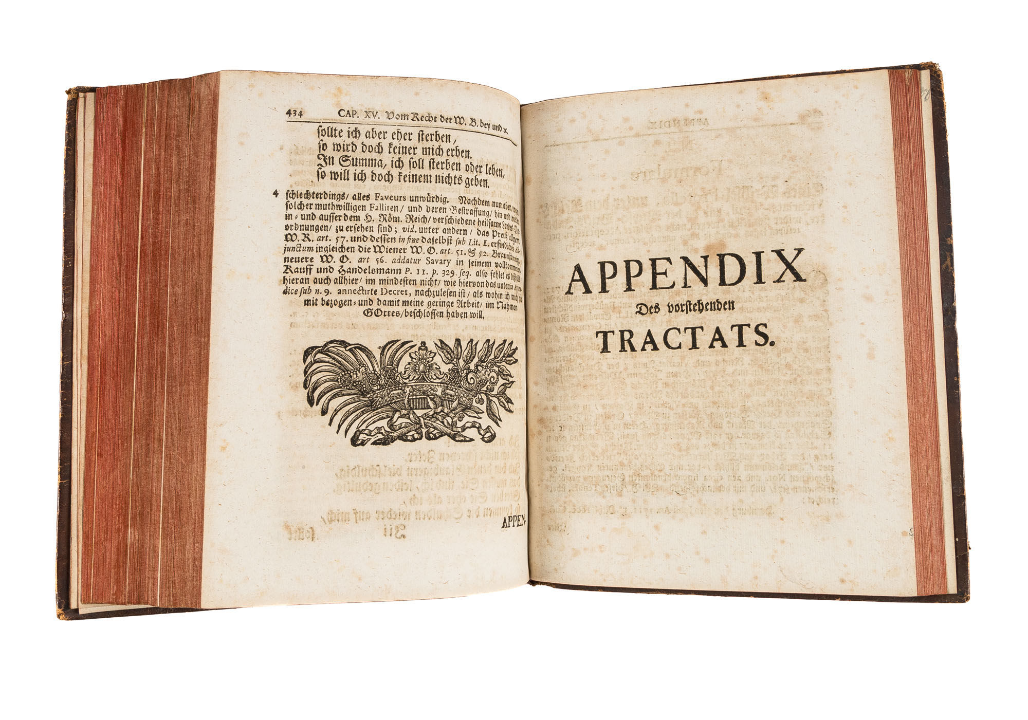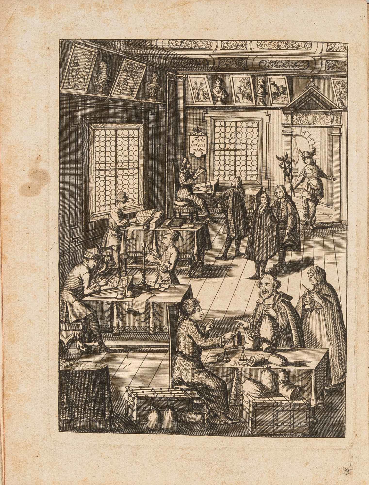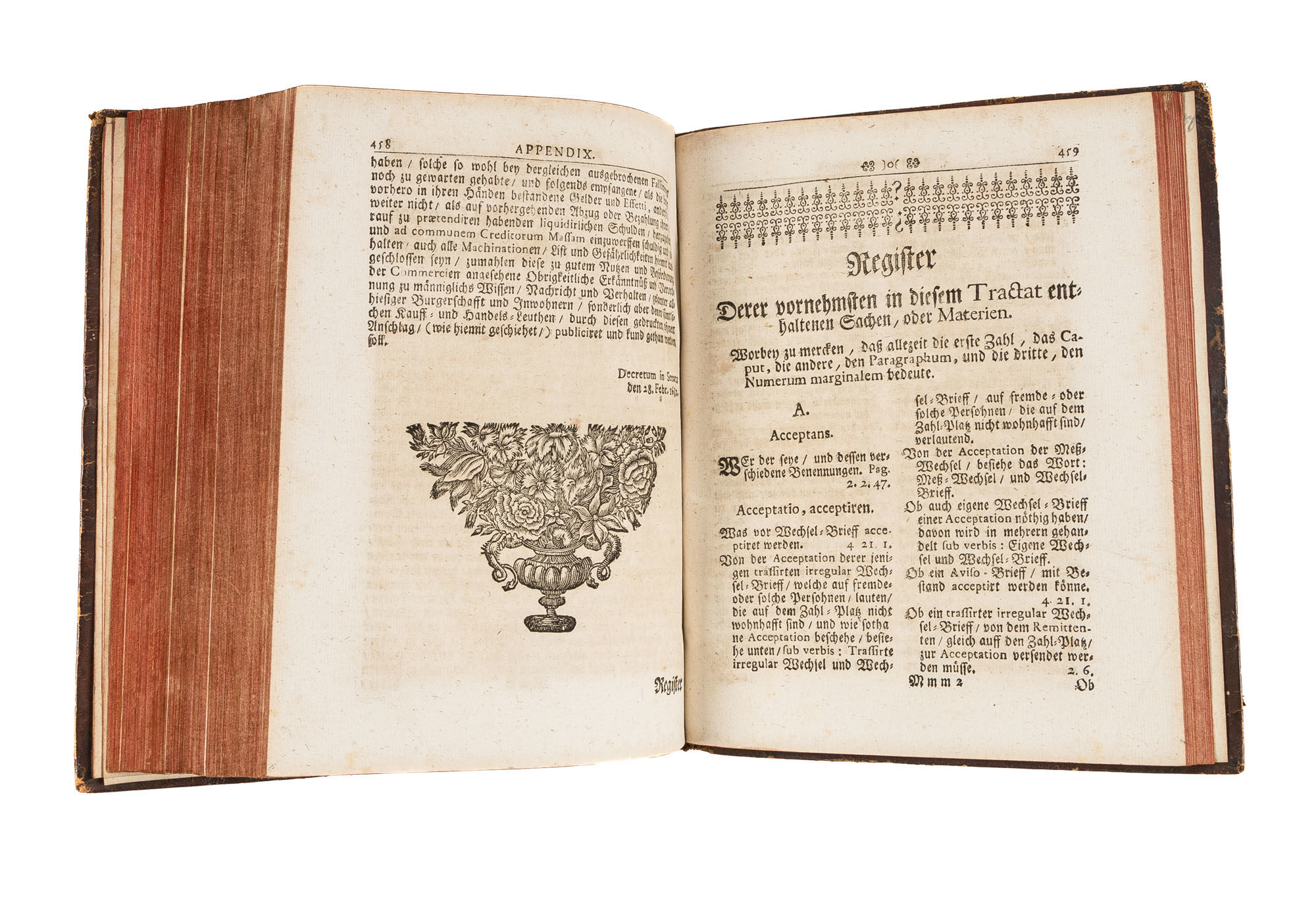 1729. with striking engraved frontispiece. with striking engraved frontispiece. Scarce Treatise on Exchange in the Holy Roman Empire with Striking Engraved Pictorial Frontispiece Beck, Johann Adam [1686-1751]. Tractatus Novus vom Wechsel-Recht: In Sich Begreiffend, So Wohl die Persohnen, Welche Diesem Recht Unterworffen Sind, Als Auch die Verschiedene Arten und Gattungen Derer Wechsel und Wechsel-Brieffen, Ingleichen was in- Order bey Ausstell- Verfertig- Versend- Und Versicherung der Wechsel-Brieffen, Oder Sonst Insgemein [...] Zu Observiren ist, Alles aus Denen, Durchaus mit Allegirten, Neuesten in- Und Ausser dem H. Romis. Reich Erfindlichen, Vielen Wechsel-Ordnungen, Mandaten und Decreten, Wie Ingleichen Denen Best- Und Bewahrtesten Autoribus, Mit Allem Flei , Zusammen Getragen, Nicht Minder mit Verschiedenen Kauffmanns Parere, Auch Practicablen Casibus Illustrirt. Und Absonderlich Einer Lobl. Kauffmannschafft, So Dann Richtern, Advocaten, Procuratoribus, Notariis, Solicitatoribus, Und Andern die mit Wechseln Umgehen, Zum Besten Verfa t, Und cum Indice Rerum & Verborum Locupletissimo, Auch Noch Einem Appendice, Heraus Gegeben. Nuremberg: Verlegis Johann Georg Lochner, 1729. [xii], 512 pp. Title in red and black, copperplate pictorial frontispiece, typographic folding table. Quarto (8" x 6-1/4"). Contemporary mottled calf, blind rules to boards, gilt spine with raised bands and red and green lettering pieces, marbled endpapers, edges rouged, silk ribbon bookmark. Light rubbing and minor scuffing and scratching to boards, moderate rubbing to extremities, somewhat heavier to joints, chipping to spine ends, front joint starting at foot, corners bumped and lightly worn, front hinge starting, rear hinge cracked, later bookplate (of Otto Zeilinger) to front pastedown. Woodcut head and tail-pieces. Moderate toning to interior, occasional light foxing. $1,500. * First edition. This treatise discusses the law of exchange in the Holy Roman Empire with attention to bills of exchange, promissory notes and foreign exchange. The frontispiece shows the busy work taking place in a Baroque exchange office with wooden paneling, cornice statutes and pictures as well as the figure of Mercury, famously the Roman god of trade and patron saint of merchants, with a caduceus, winged shoes and winged helmet. Apparently a well-received work, a second edition was published in 1751. OCLC locates 5 cop.
