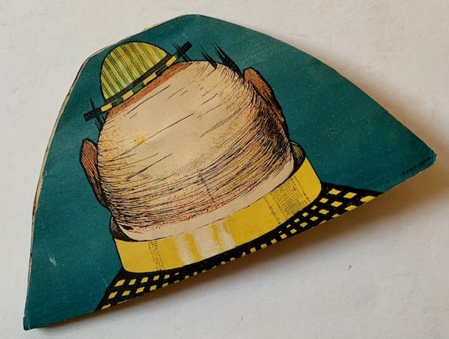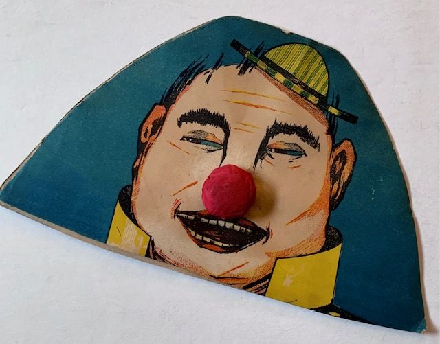 1930. Ephemera. Very Good +. Charming German paper hat, circa 1930, an apparent hommage to Oliver Hardy (of "Laurel and Hardy"). Bright and VG in its vivid blues, yellows, blacks and reds (the prominent bulbous nose), with very light wear along the tips. The only printing appears on the lower reverse and states in tiny letters "D.R.G.M. Germany". Measures (in its almost half-circle) 12" wide x 7" tall.