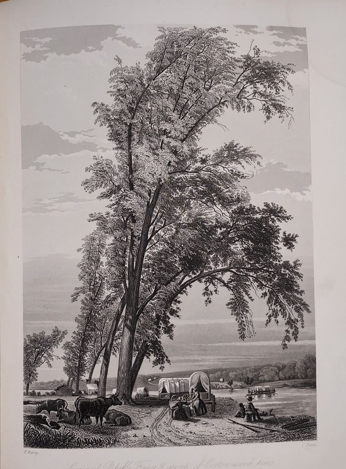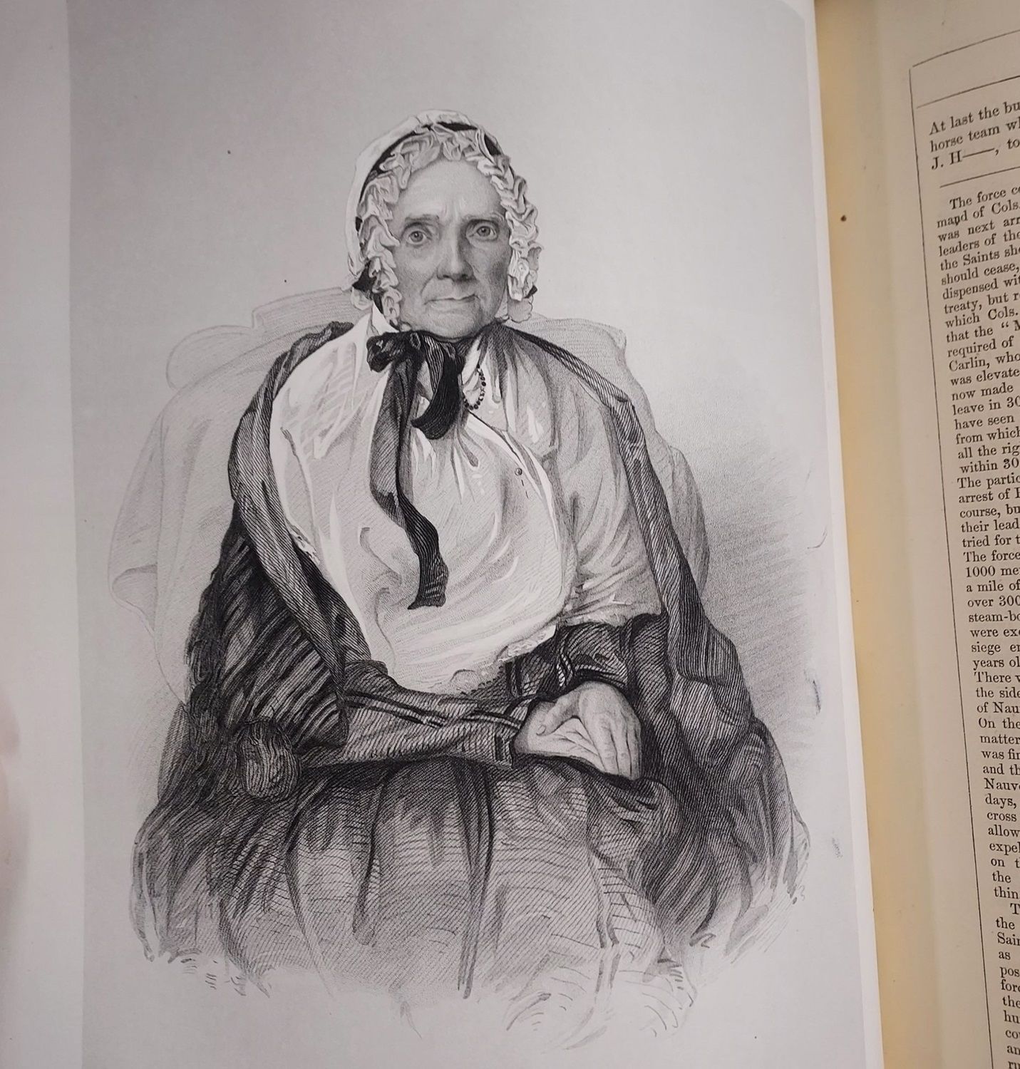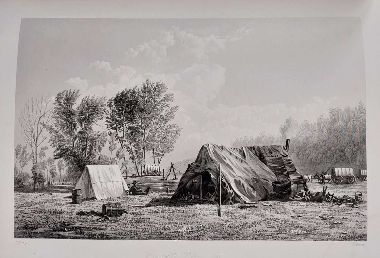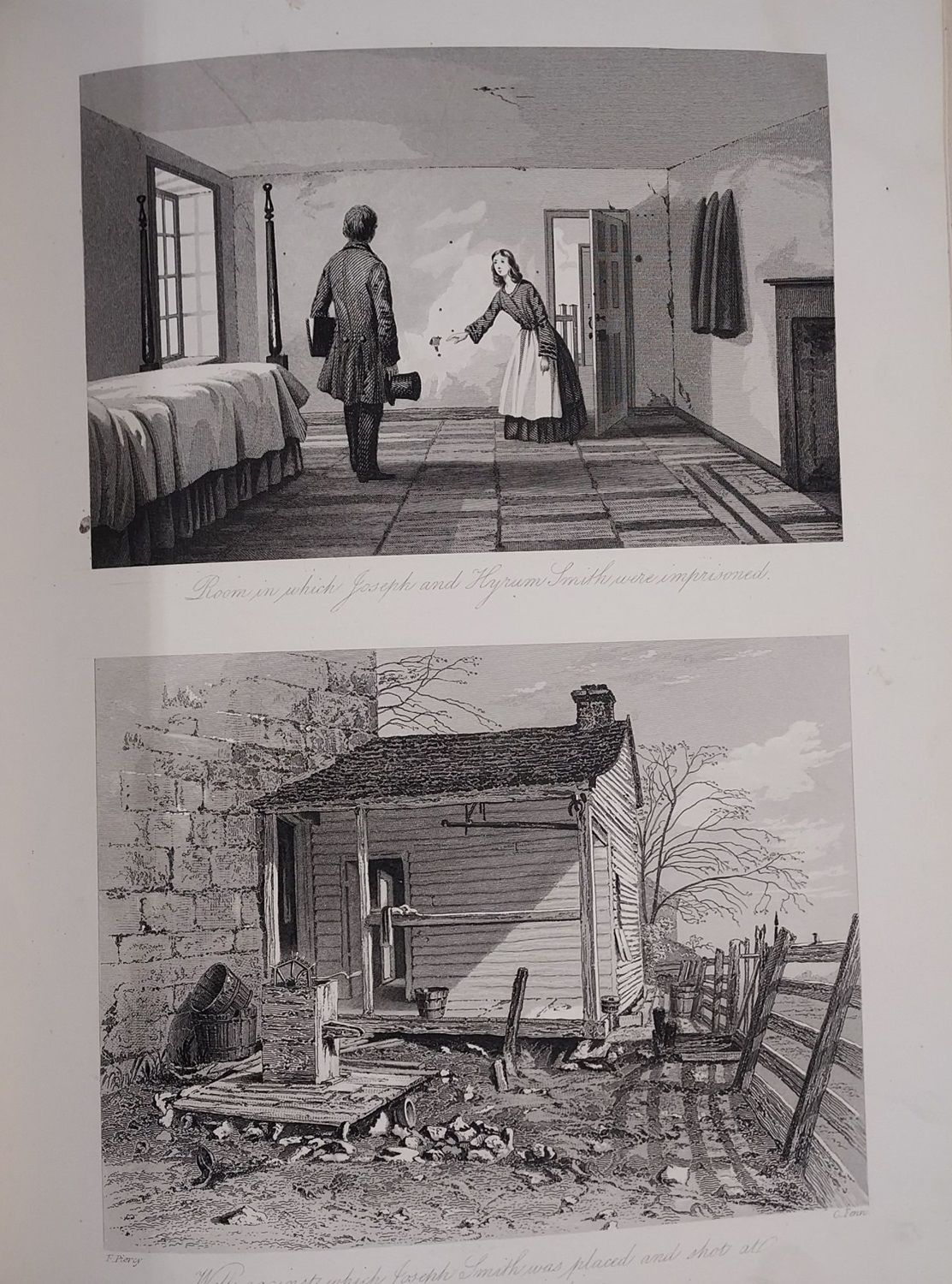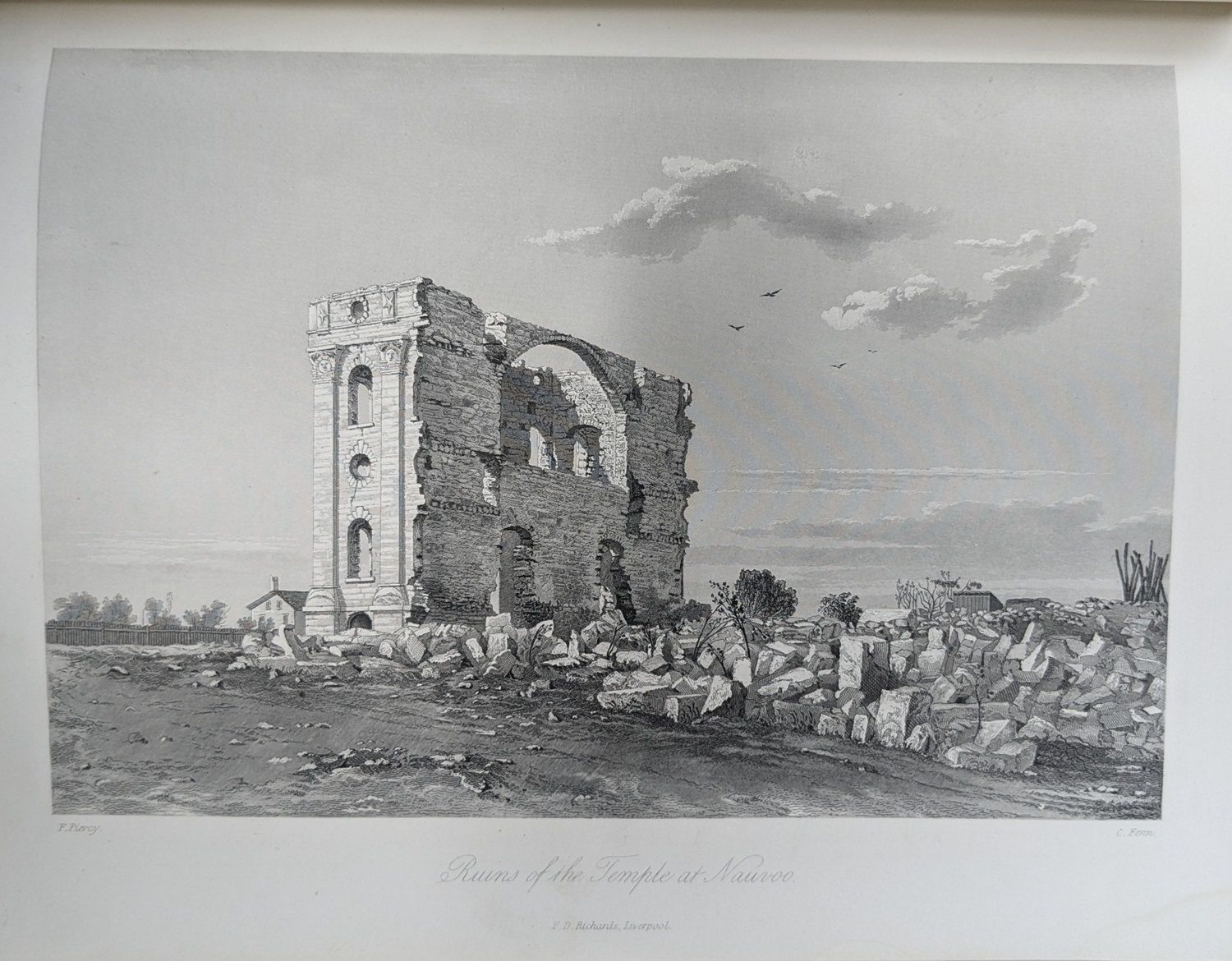 Scarce in any condition. A collection of engravings of the most significant landmarks and points of interest on the Route between Liverpool and Great Salt Lake City, such as "New Orleans," "St. Louis," "Camp at Keokuck," "Ruins of the Temple at Nauvoo," "Room in which Joseph and Hyrum Smith were imprisoned," "Wall against which Joseph Smith was placed and shot at after his assassination," "Council Bluffs Ferry & group of Cotton-wood trees," and "Great Salt Lake City in 1853." The book also includes portraits of prominent Latter-day Saints, including Joseph Smith, Hyrum Smith, Lucy Smith, and Brigham Young. Extremely high quality illustrations made from the drawings that talented young artist Frederick Piercy made along the trail.